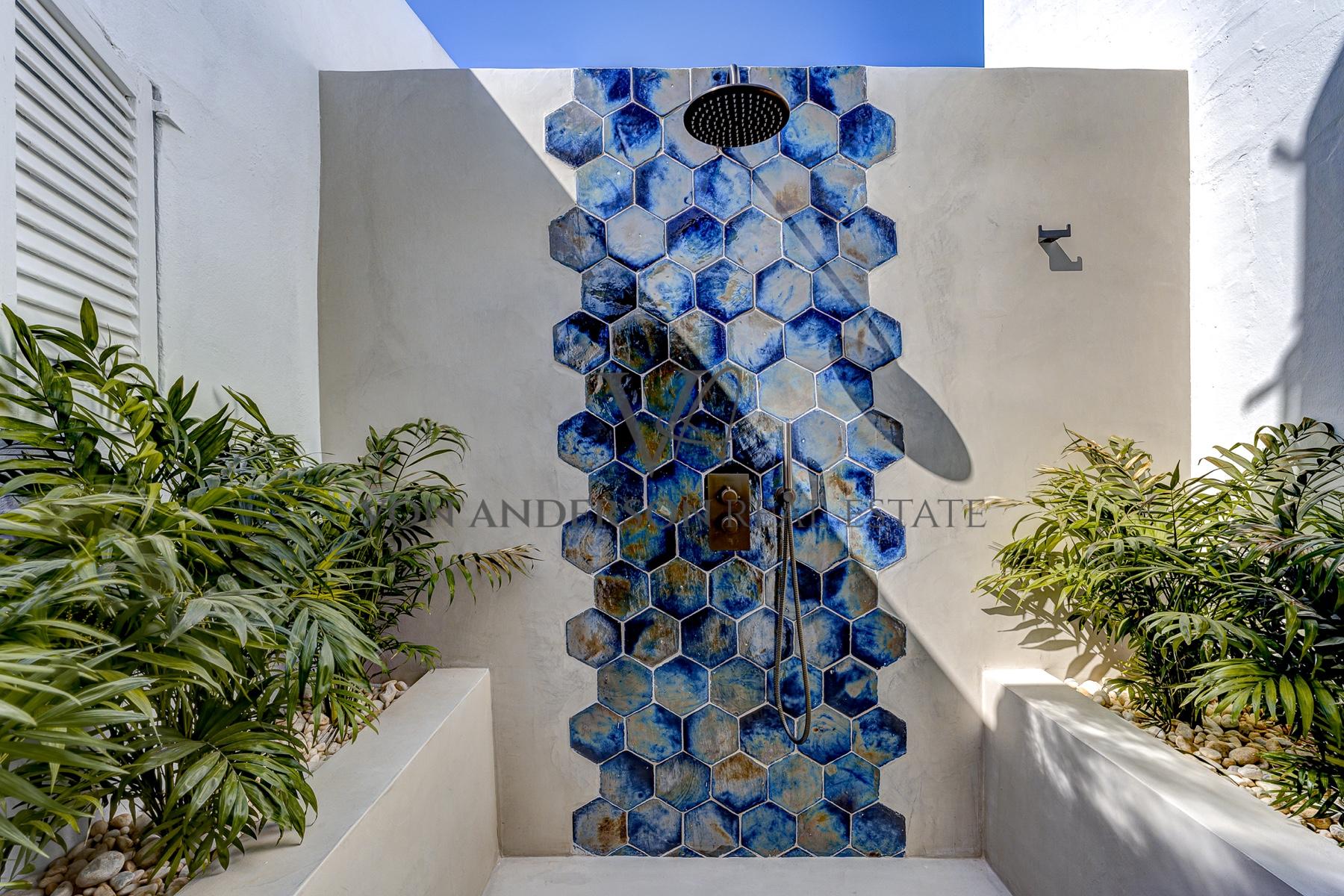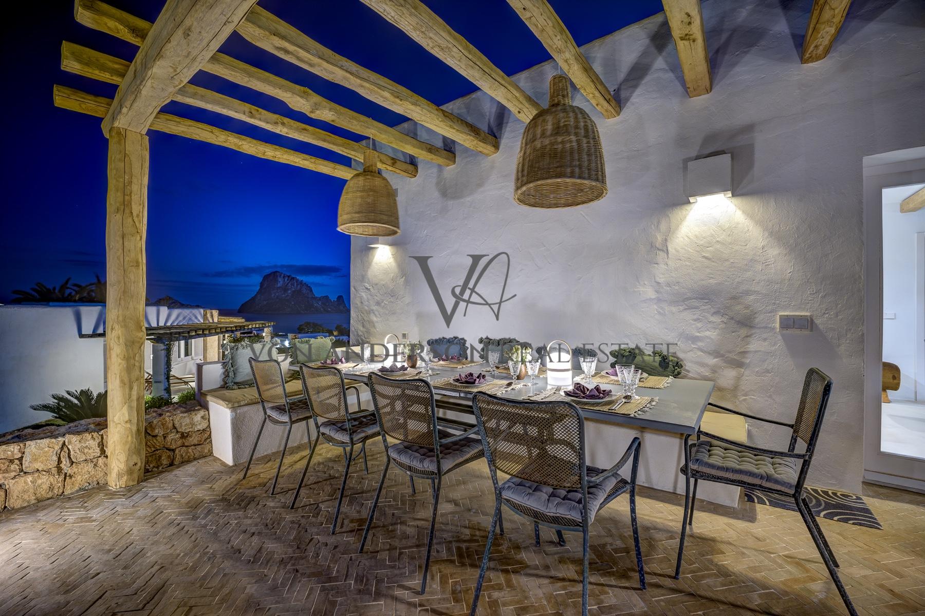 Die Außenbereiche sind mit mehreren möblierten Terrassen, schattigen Innenhöfen und mediterranen Gärten für luxuriöse Entspannung und Unterhaltung ausgelegt. Ein Highlight ist die Außenküche, die sowohl einen Grill im Egg-Stil als auch einen argentinischen Grill, ein Spülbecken und einen großen Esstisch für bis zu 14 Personen umfasst. Die Dachterrasse bietet einen spektakulären 360-Grad-Blick, perfekt, um die atemberaubende Landschaft zu genießen, von der bezaubernden Es Vedra bis zu den faszinierenden Sonnenuntergängen.