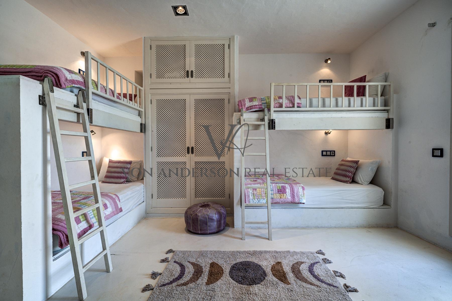 Das Nebengebäude bietet fünf weitere Schlafzimmer - drei Doppelzimmer mit eigenem Bad und zwei Zimmer mit Etagenbetten, die sich ein Familienbad teilen - und ist damit ein vielseitiger Raum für die Unterbringung größerer Gruppen. Das helle, luftige Interieur ist mit natürlichen Materialien wie Holz und lokalem Stein gestaltet, was die zeitlose und warme Atmosphäre des Hauses unterstreicht.