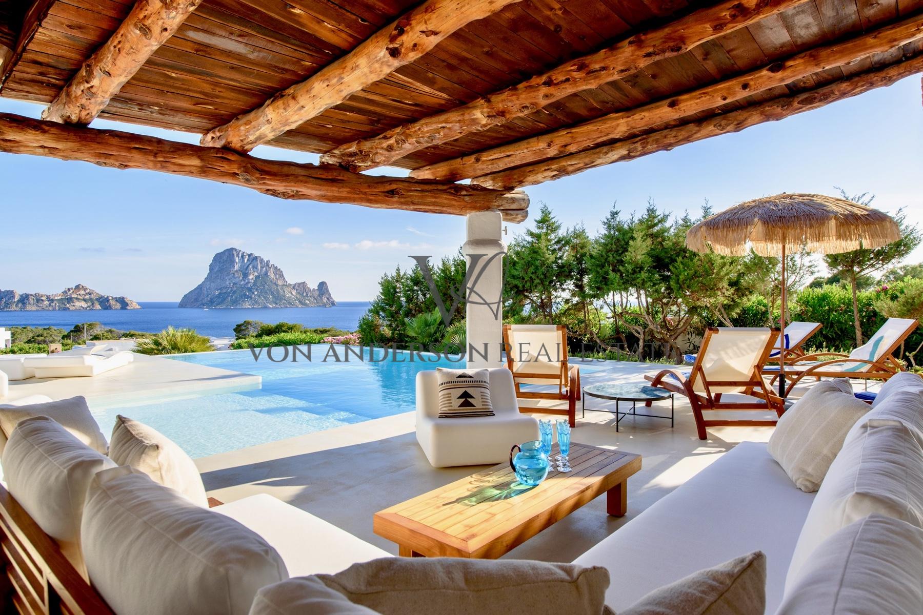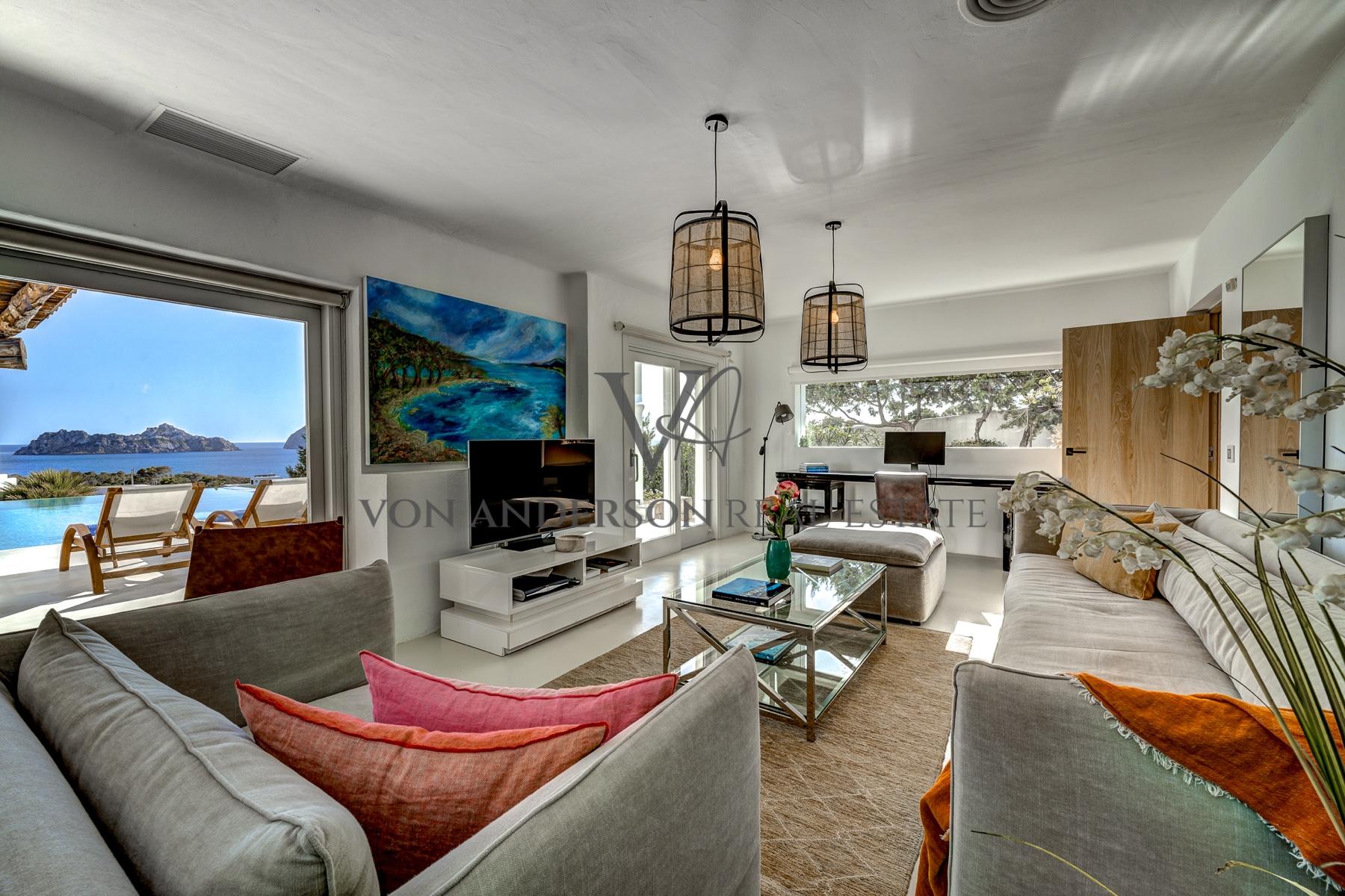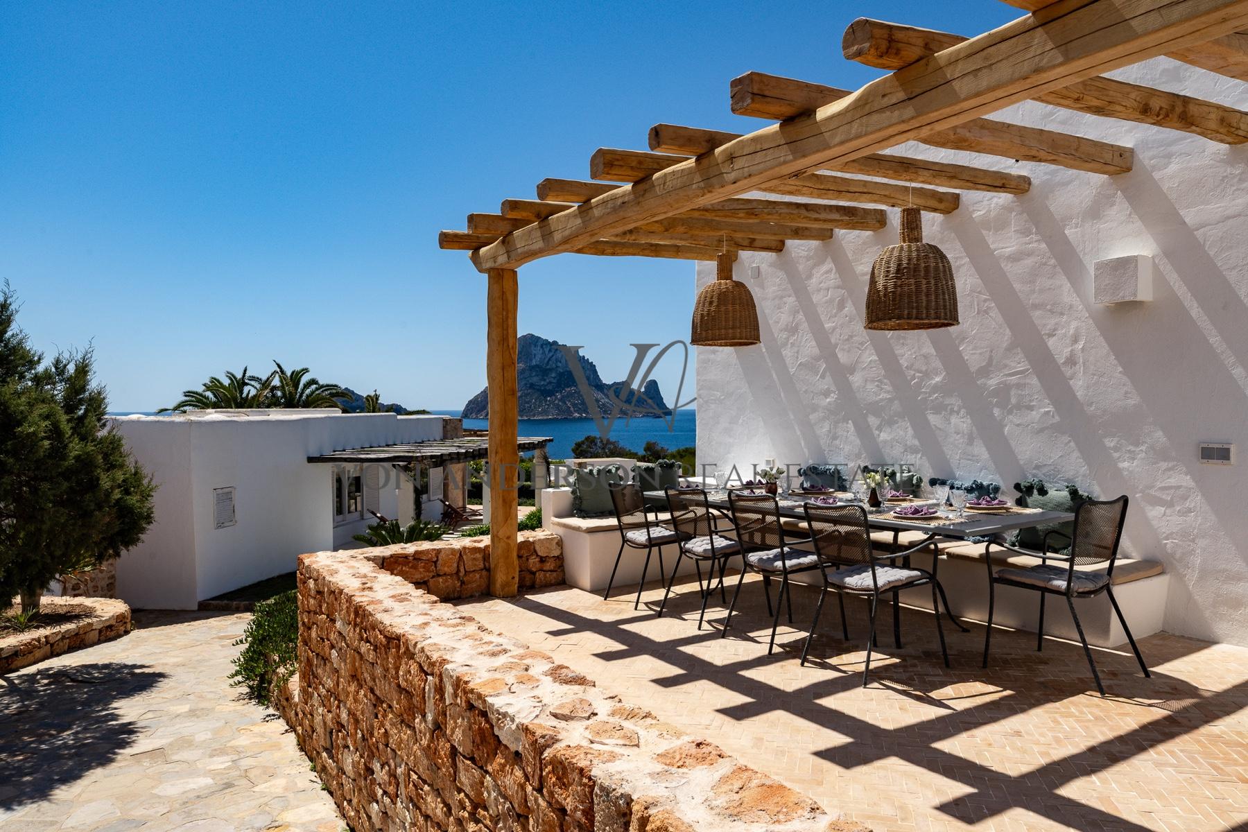 Eine atemberaubende, exklusive Villa in der begehrten Cala Carbo, südwestlich von Ibiza, bekannt als eine der schönsten Gegenden der Insel, um die faszinierende Aussicht auf Es Vedra und die atemberaubenden Sonnenuntergänge zu genießen.