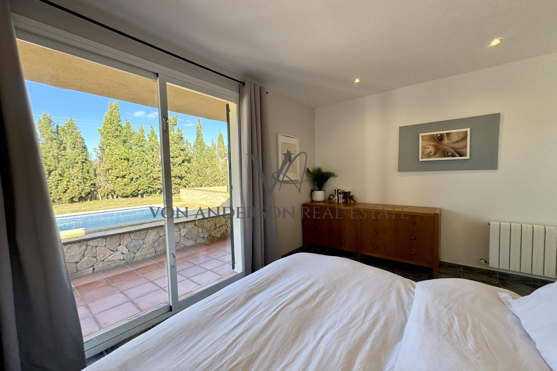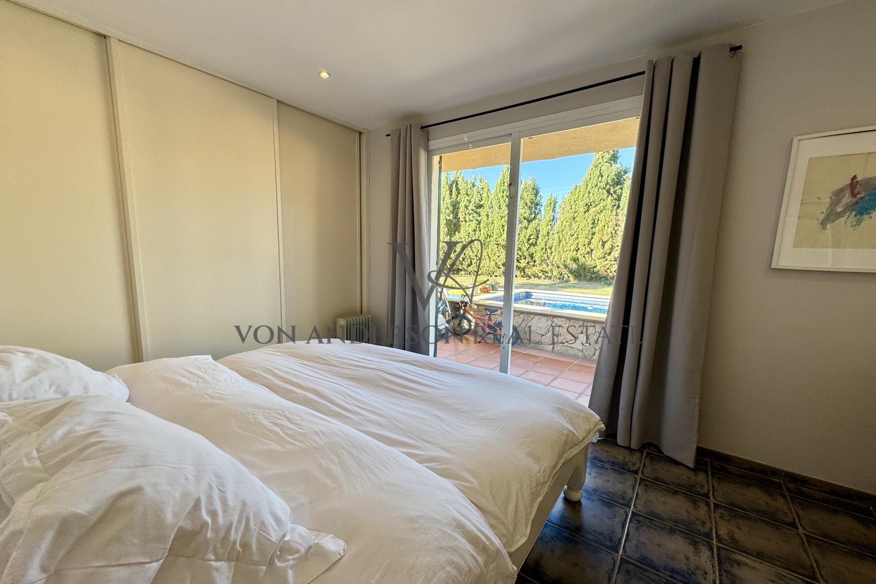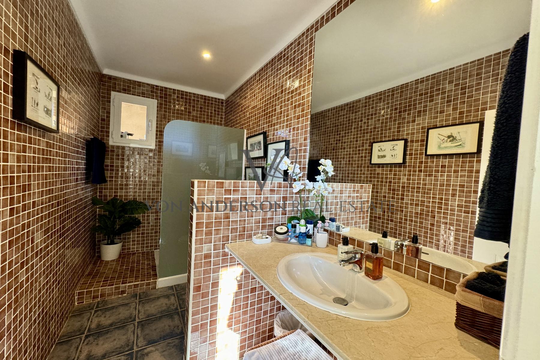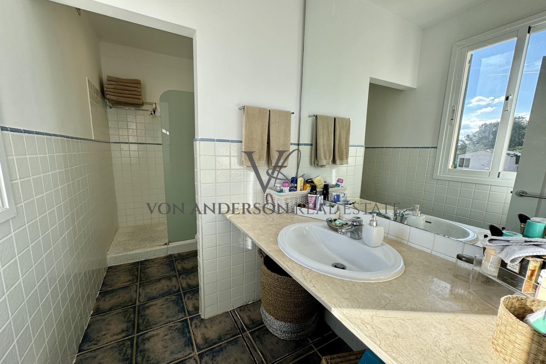 La espaciosa propiedad en forma de "L" mide 230m2 y ofrece un total de cuatro dormitorios y tres baños, dos de ellos en suite. La villa con calefacción central de gasoil también ofrece un amplio espacio de vida que incorpora una cocina independiente totalmente equipada, un elegante comedor y un salón con una acogedora chimenea de leña típica. Todas las habitaciones disponen de aire acondicionado.