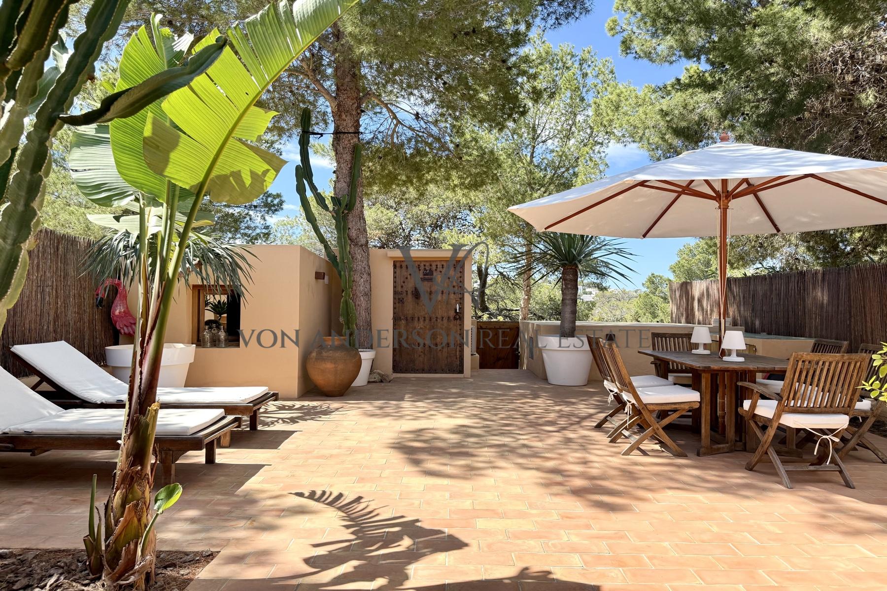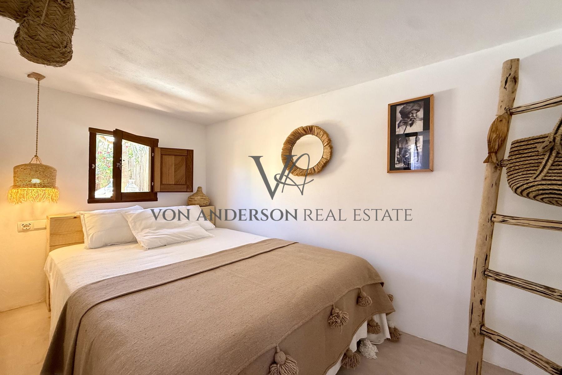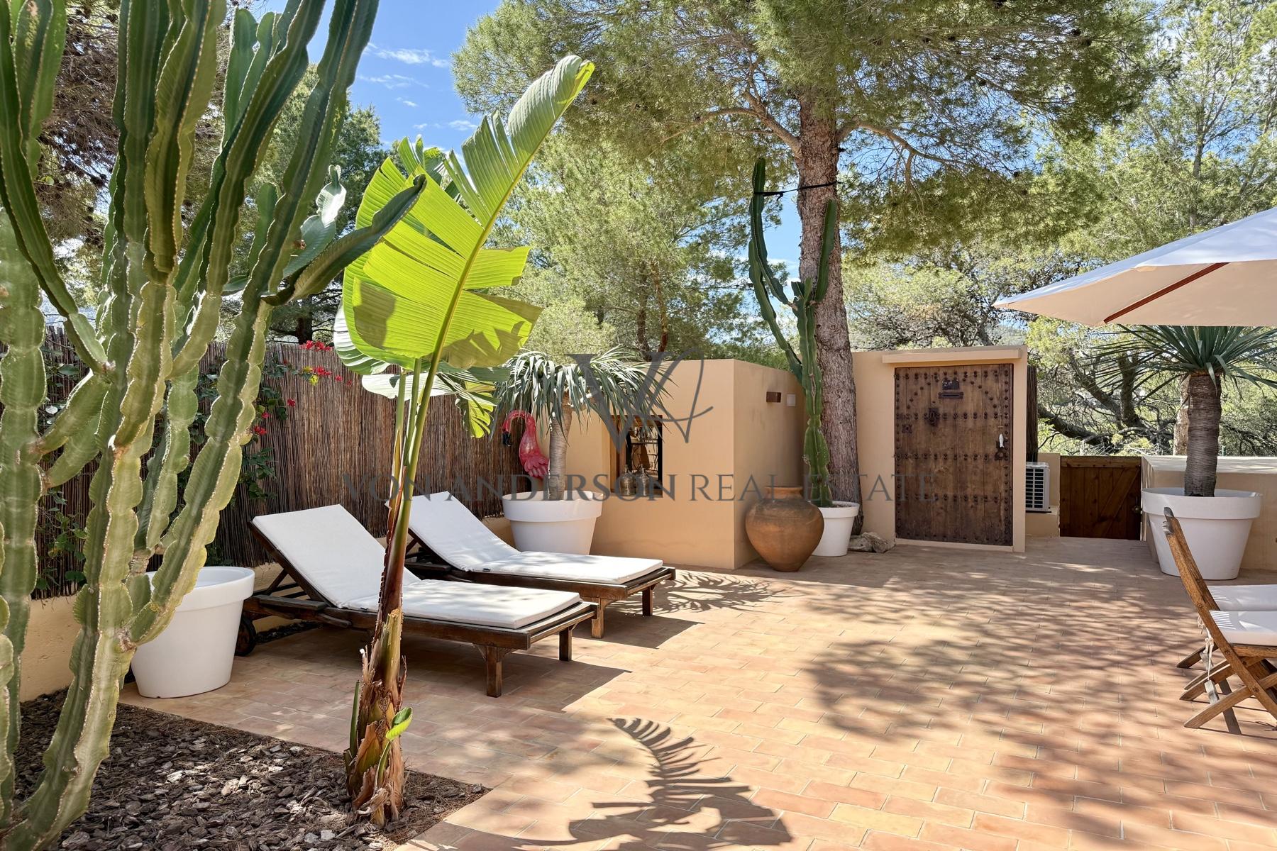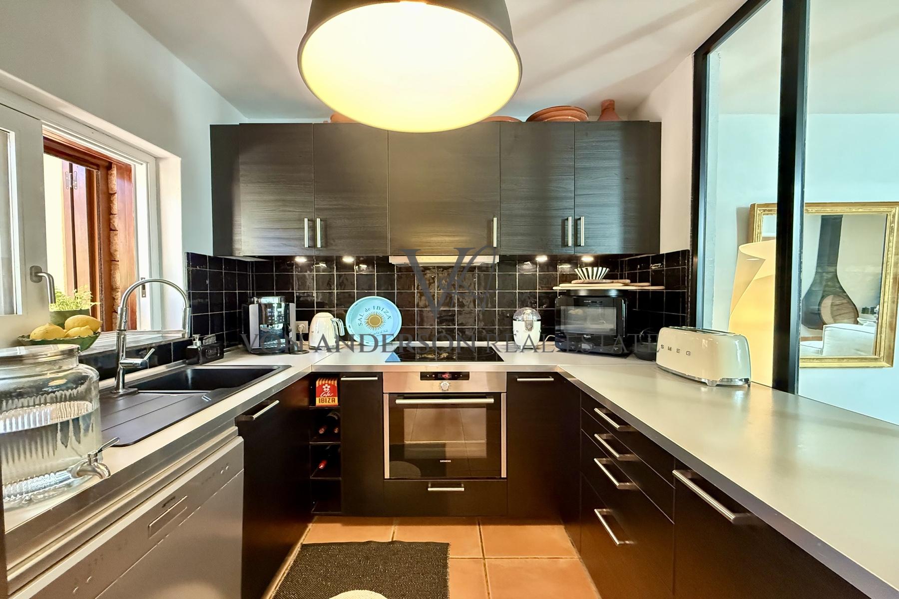 Situada entre pinos maduros, la casa disfruta de vistas al mar y de un ambiente tranquilo y privado. En el interior, un jardín de estilo mediterráneo le da la bienvenida a un espacio diáfano que combina una luminosa y moderna cocina con electrodomésticos de alta gama y un acogedor salón con chimenea. El diseño es limpio y sobrio, reflejo del espíritu relajado de Ibiza.