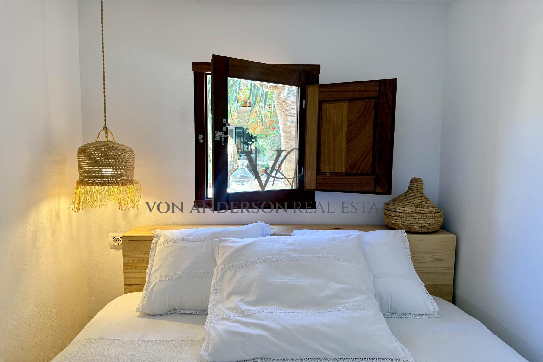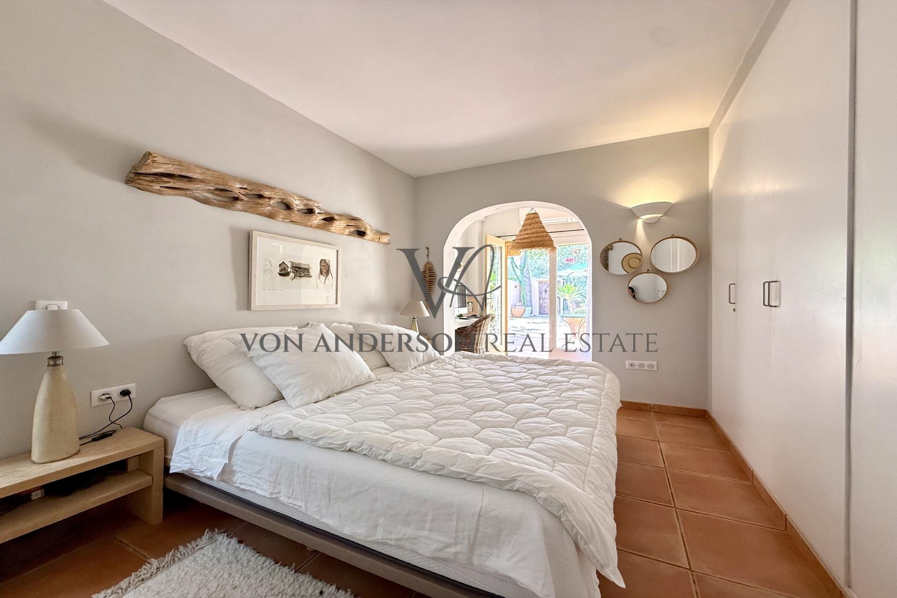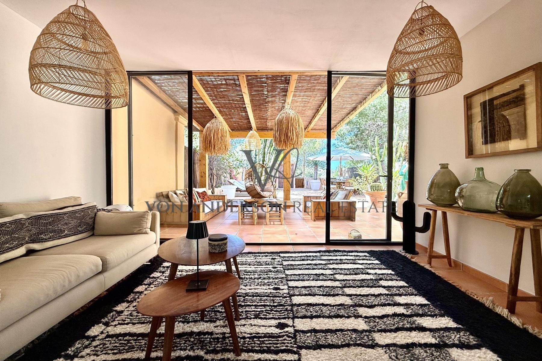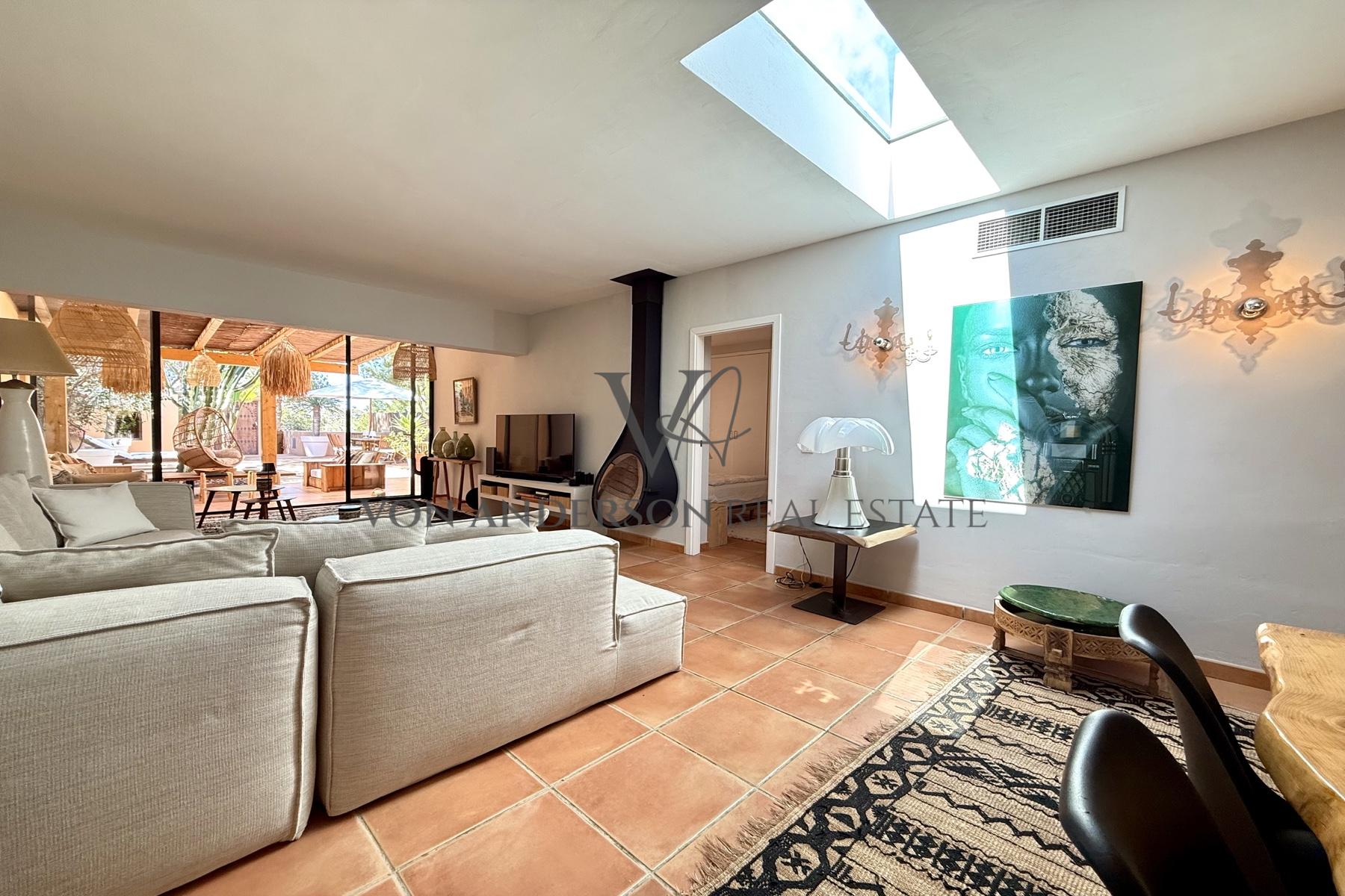 Situada entre pinos maduros, la casa disfruta de vistas al mar y de un ambiente tranquilo y privado. En el interior, un jardín de estilo mediterráneo le da la bienvenida a un espacio diáfano que combina una luminosa y moderna cocina con electrodomésticos de alta gama y un acogedor salón con chimenea. El diseño es limpio y sobrio, reflejo del espíritu relajado de Ibiza.