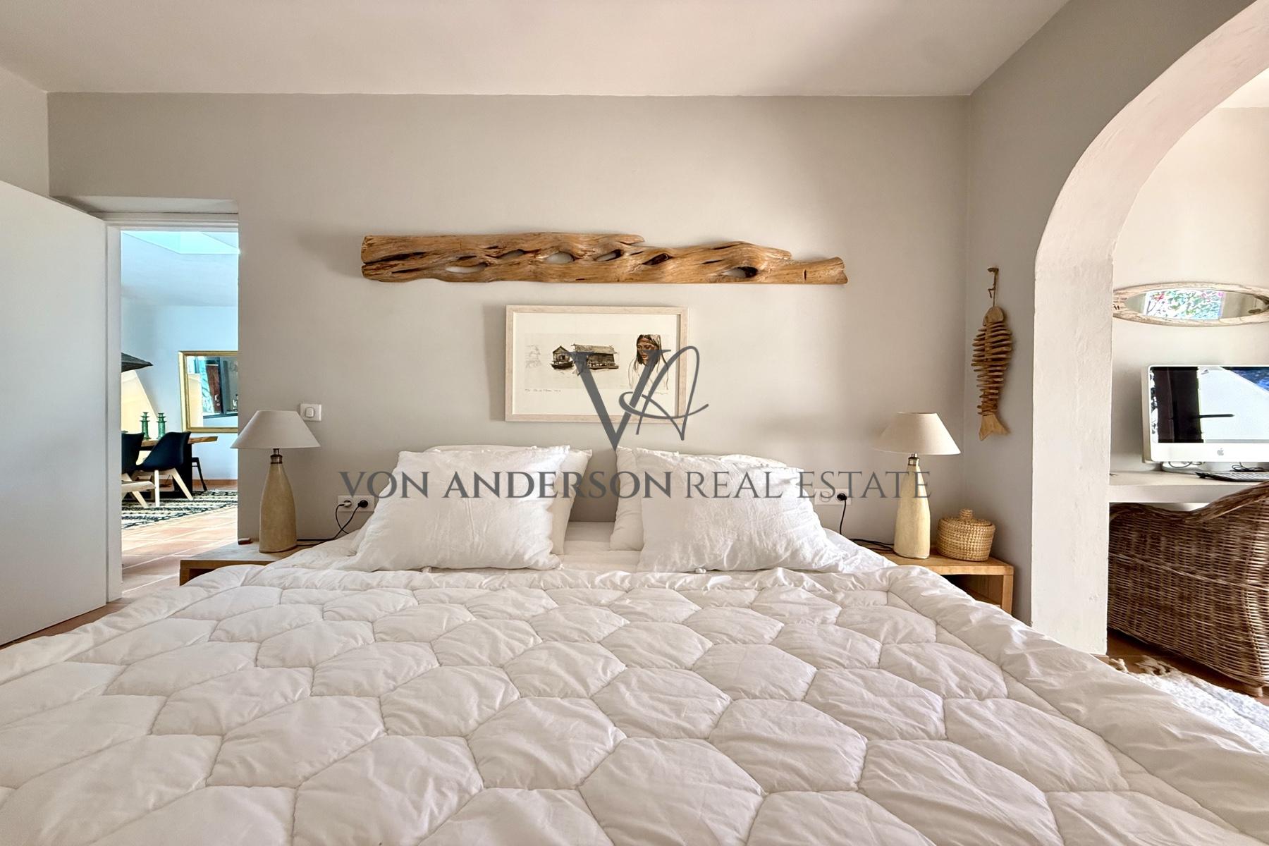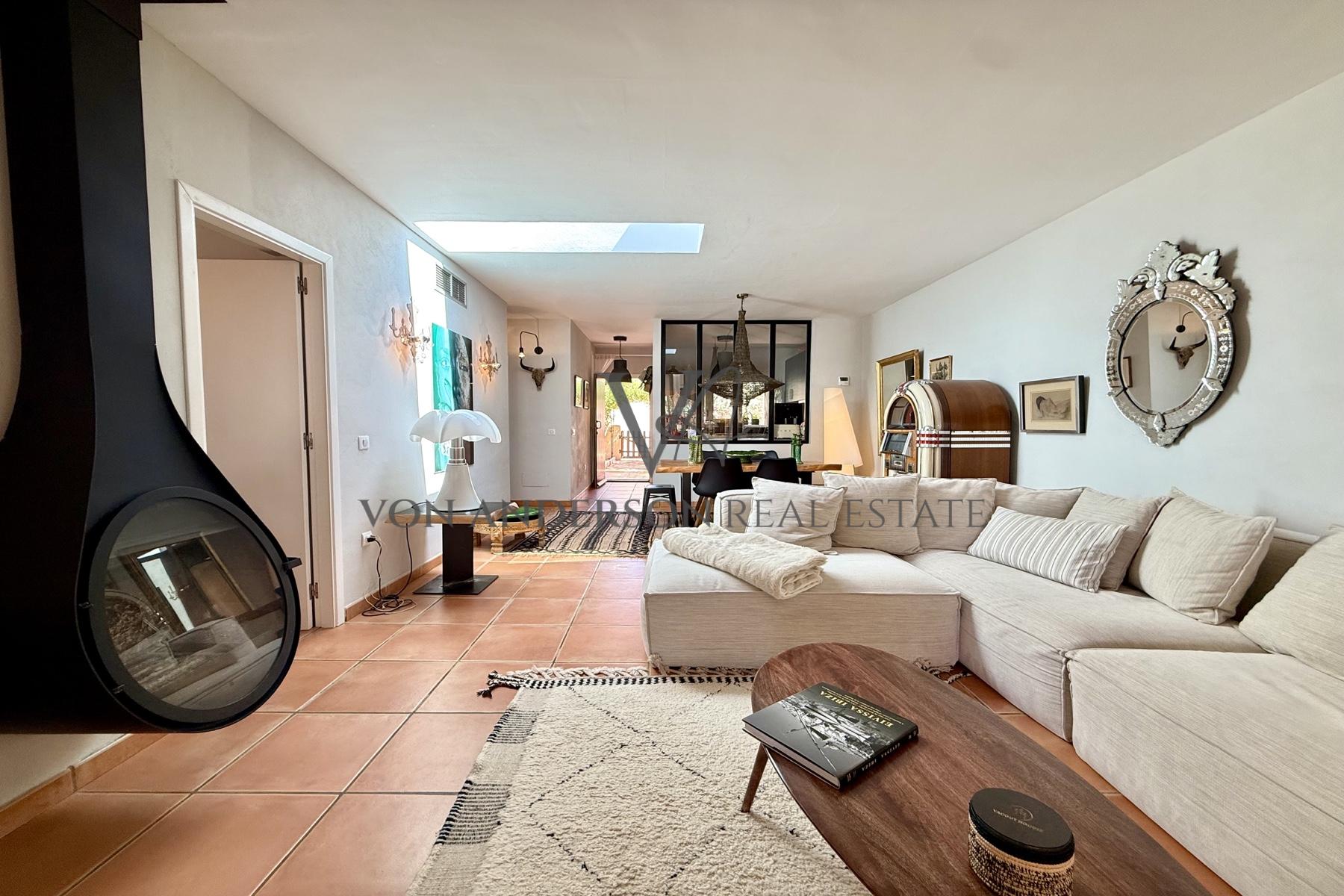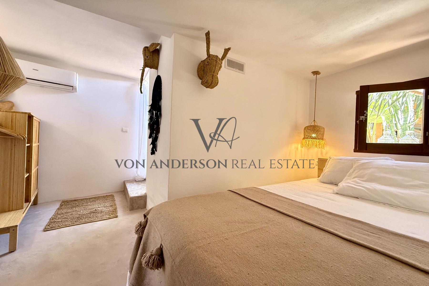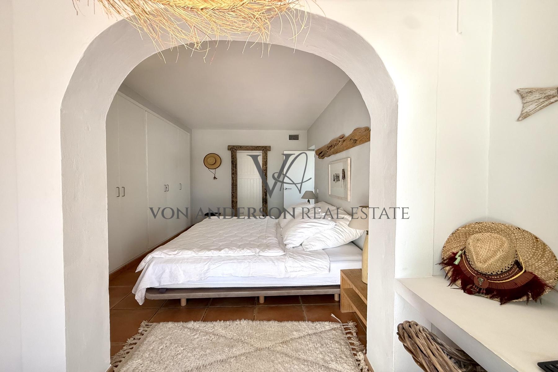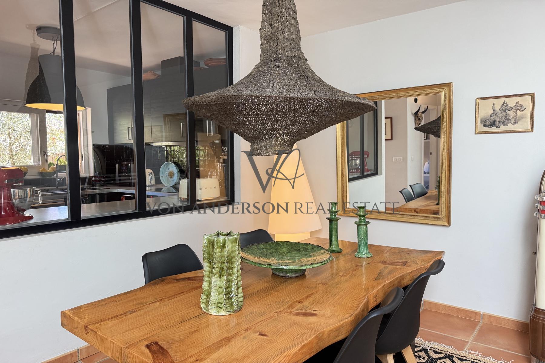 Situada entre pinos maduros, la casa disfruta de vistas al mar y de un ambiente tranquilo y privado. En el interior, un jardín de estilo mediterráneo le da la bienvenida a un espacio diáfano que combina una luminosa y moderna cocina con electrodomésticos de alta gama y un acogedor salón con chimenea. El diseño es limpio y sobrio, reflejo del espíritu relajado de Ibiza.