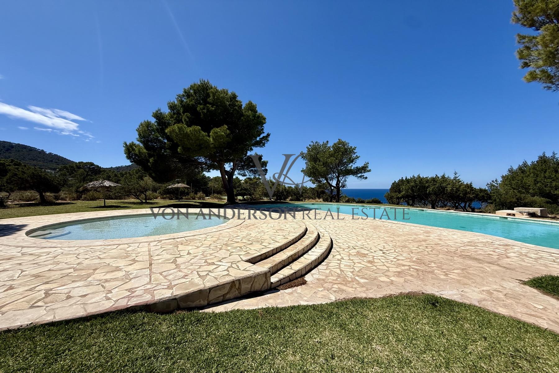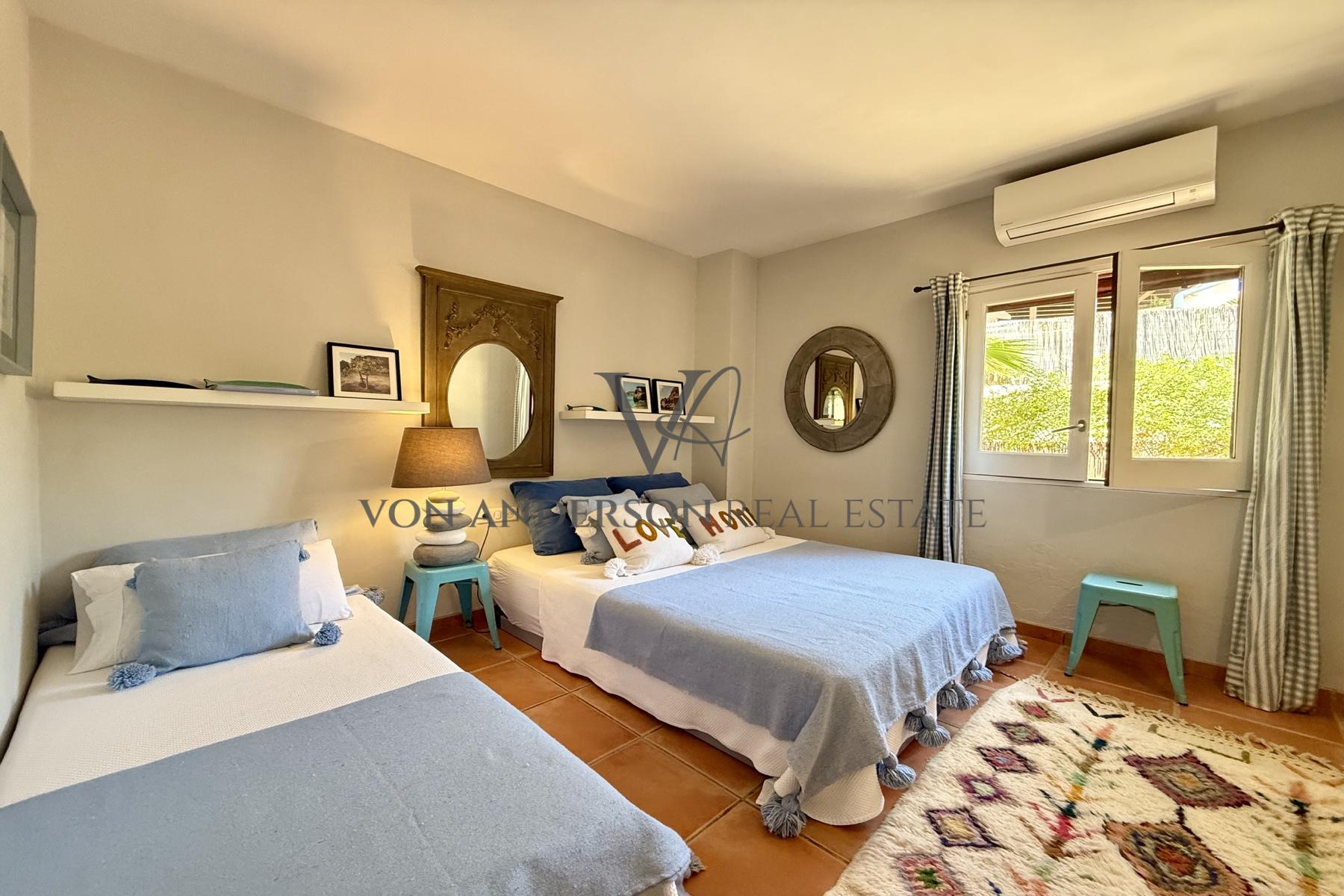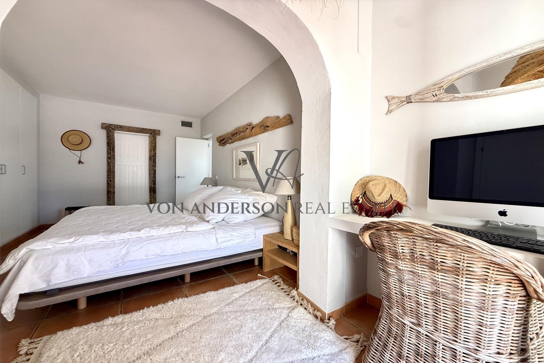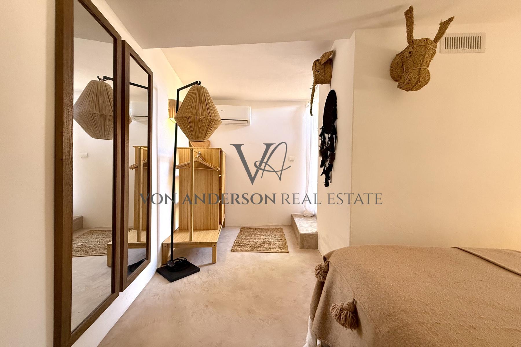Situada entre pinos maduros, la casa disfruta de vistas al mar y de un ambiente tranquilo y privado. En el interior, un jardín de estilo mediterráneo le da la bienvenida a un espacio diáfano que combina una luminosa y moderna cocina con electrodomésticos de alta gama y un acogedor salón con chimenea. El diseño es limpio y sobrio, reflejo del espíritu relajado de Ibiza.