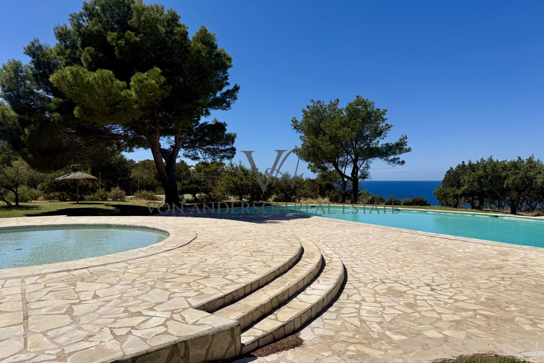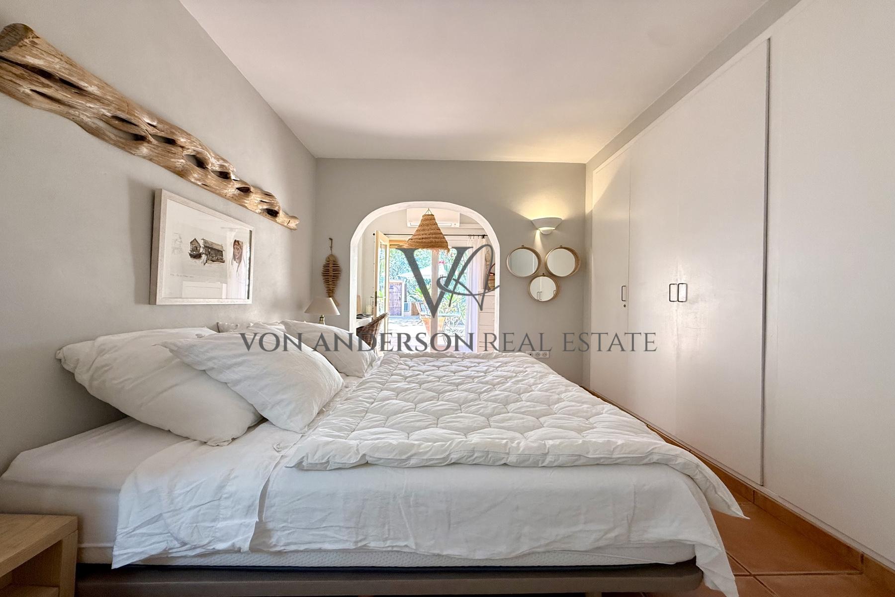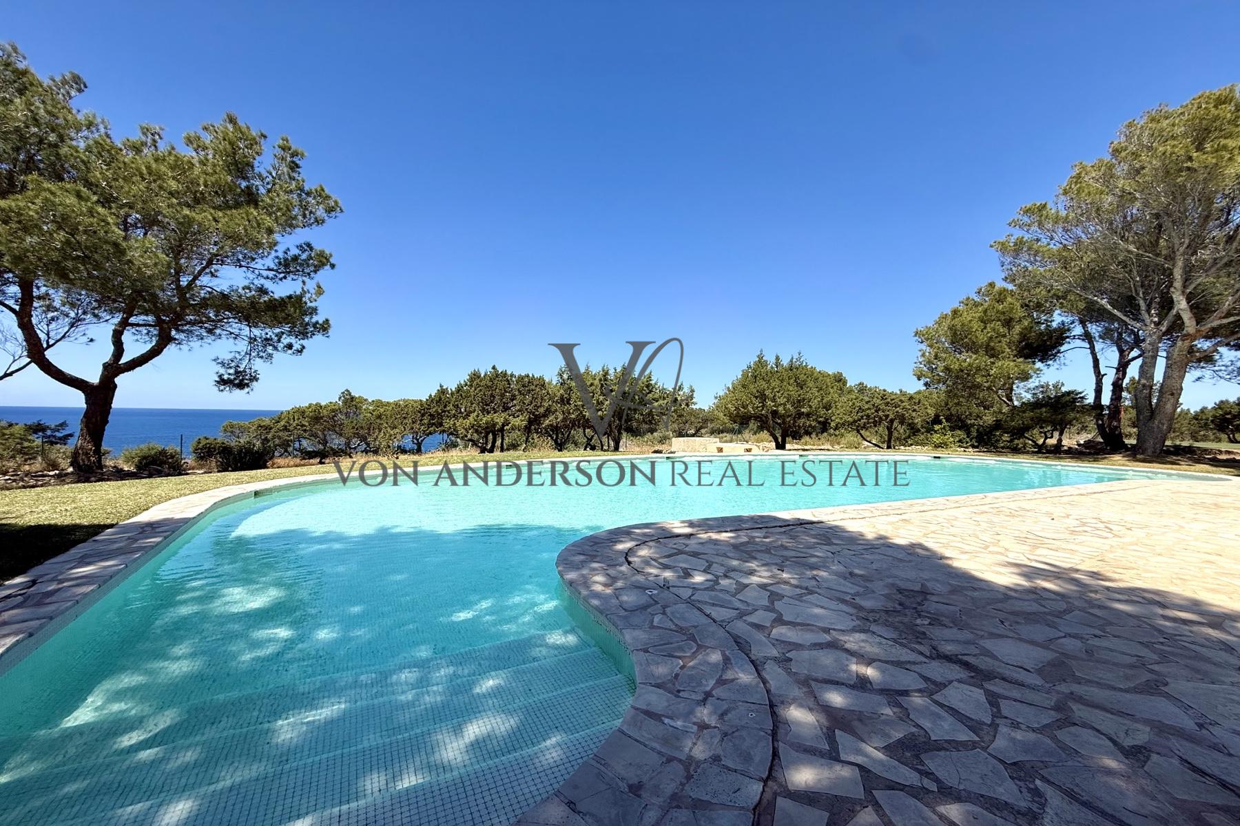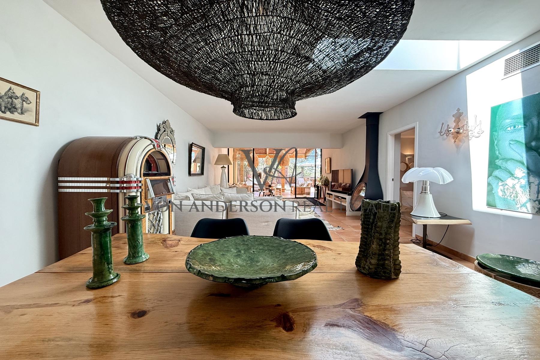 Situada entre pinos maduros, la casa disfruta de vistas al mar y de un ambiente tranquilo y privado. En el interior, un jardín de estilo mediterráneo le da la bienvenida a un espacio diáfano que combina una luminosa y moderna cocina con electrodomésticos de alta gama y un acogedor salón con chimenea. El diseño es limpio y sobrio, reflejo del espíritu relajado de Ibiza.