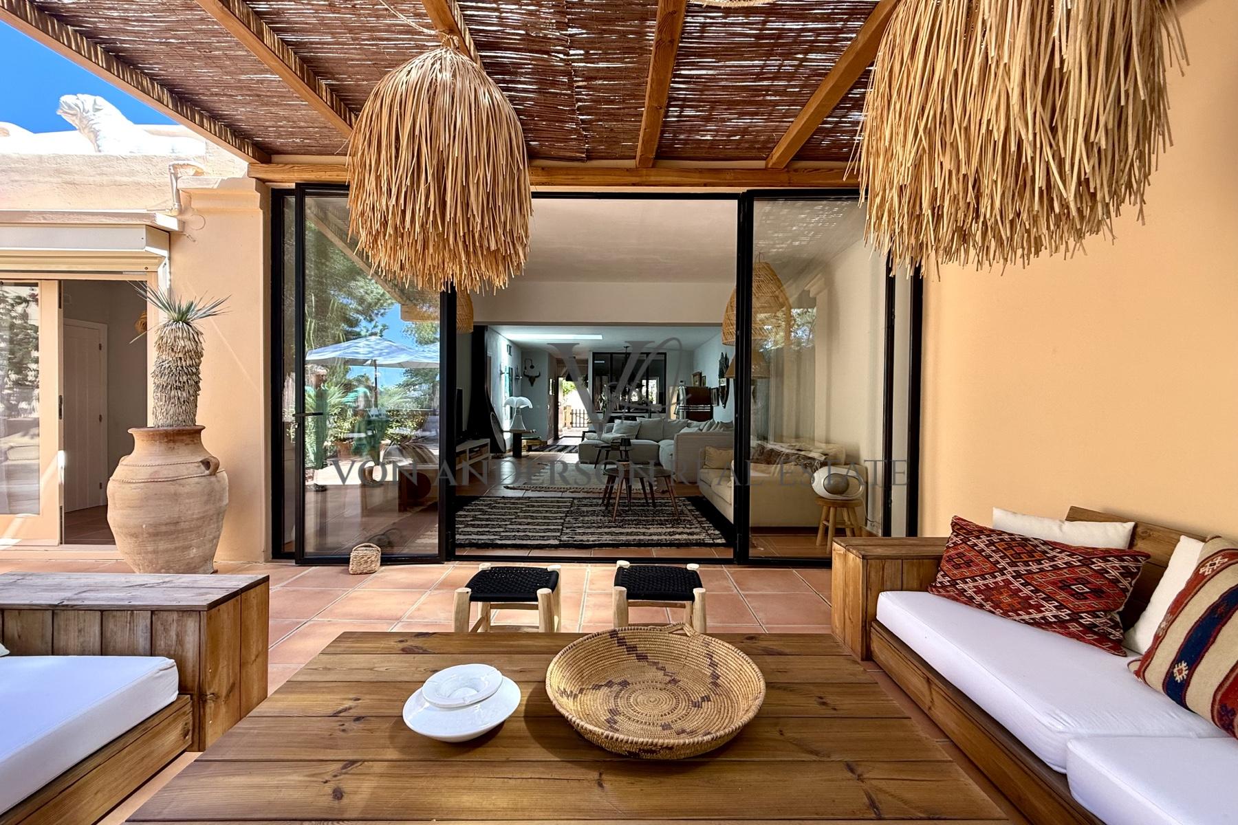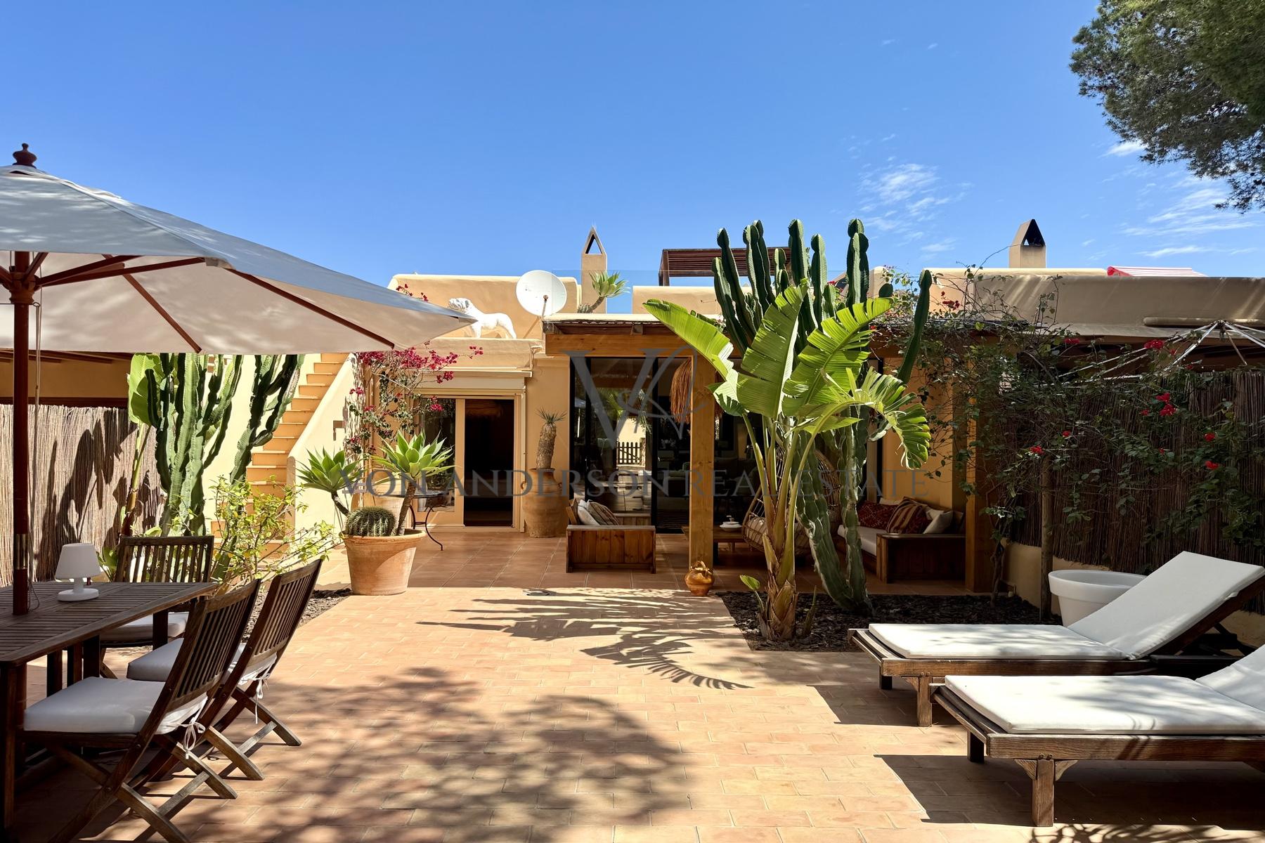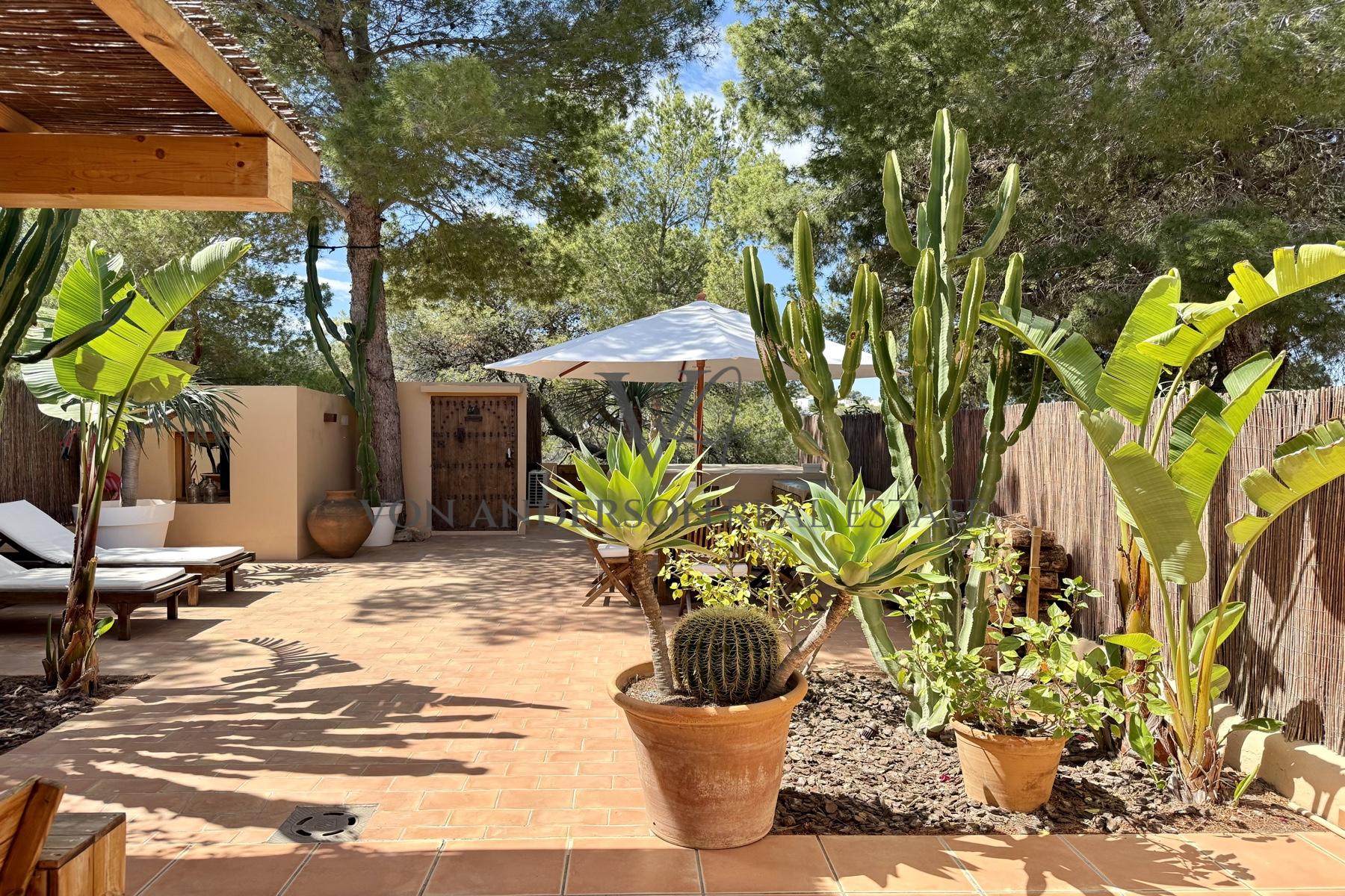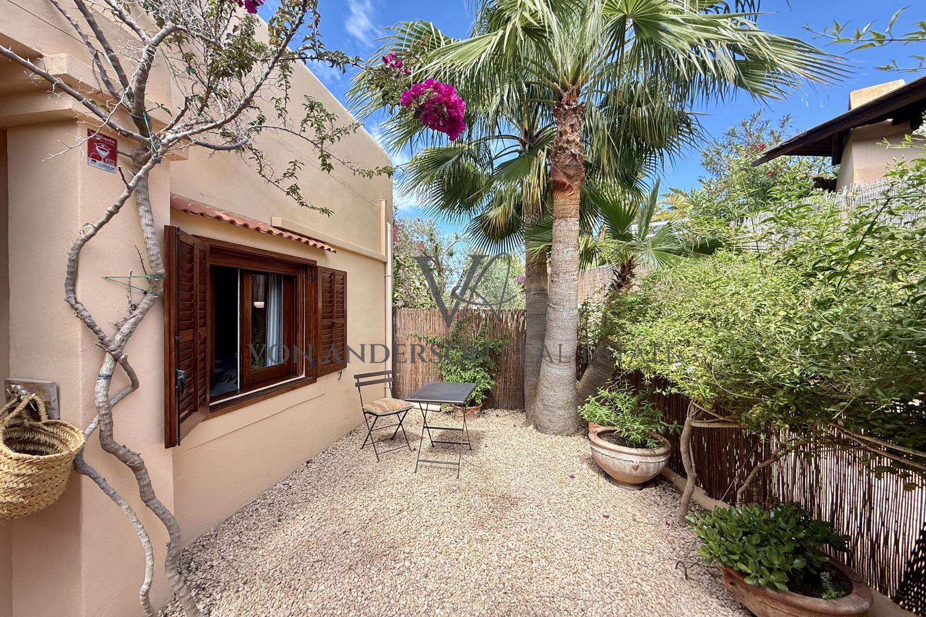 Elegante adosado de una sola planta cerca de Cala Tarida con jardín privado y terraza en la azotea