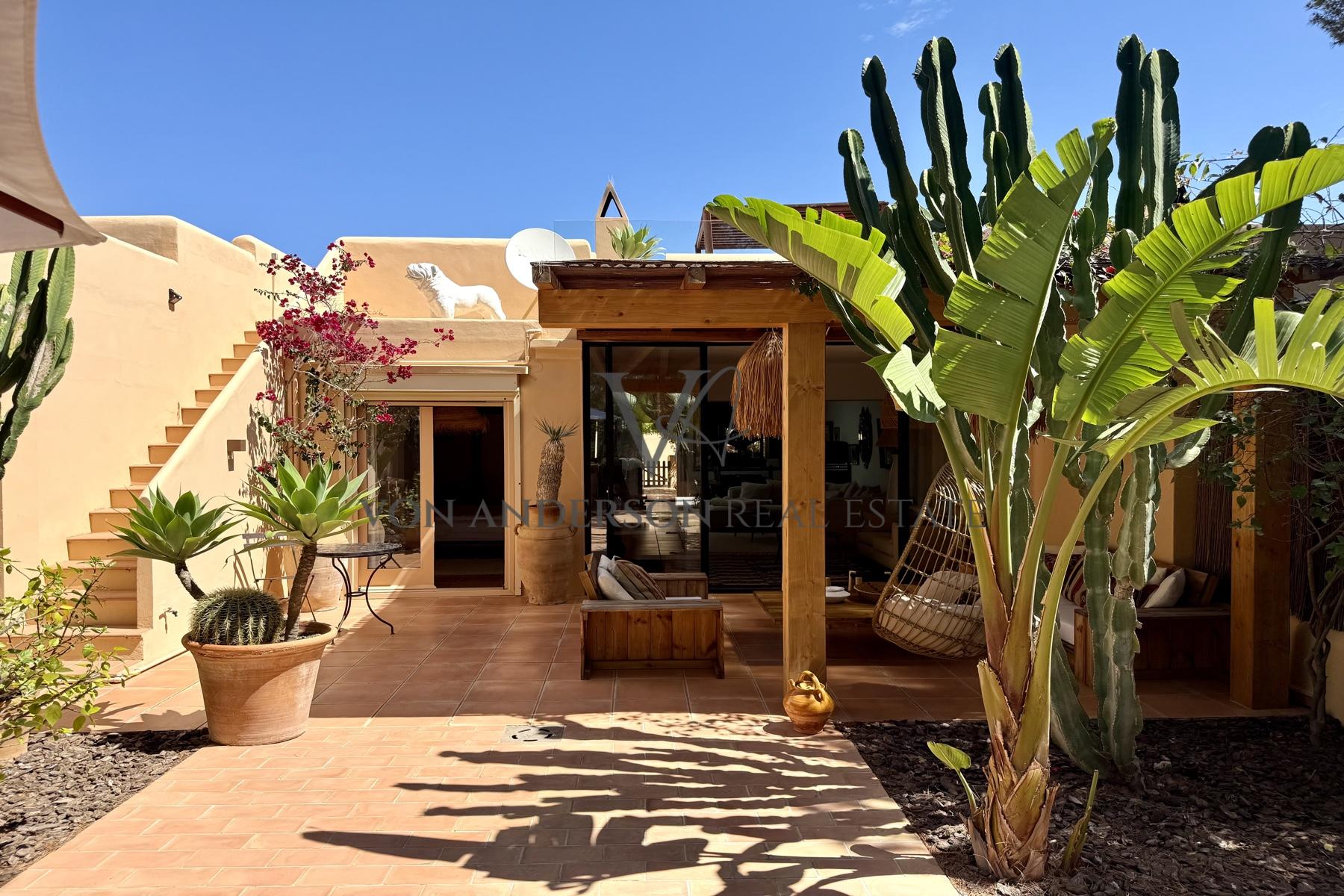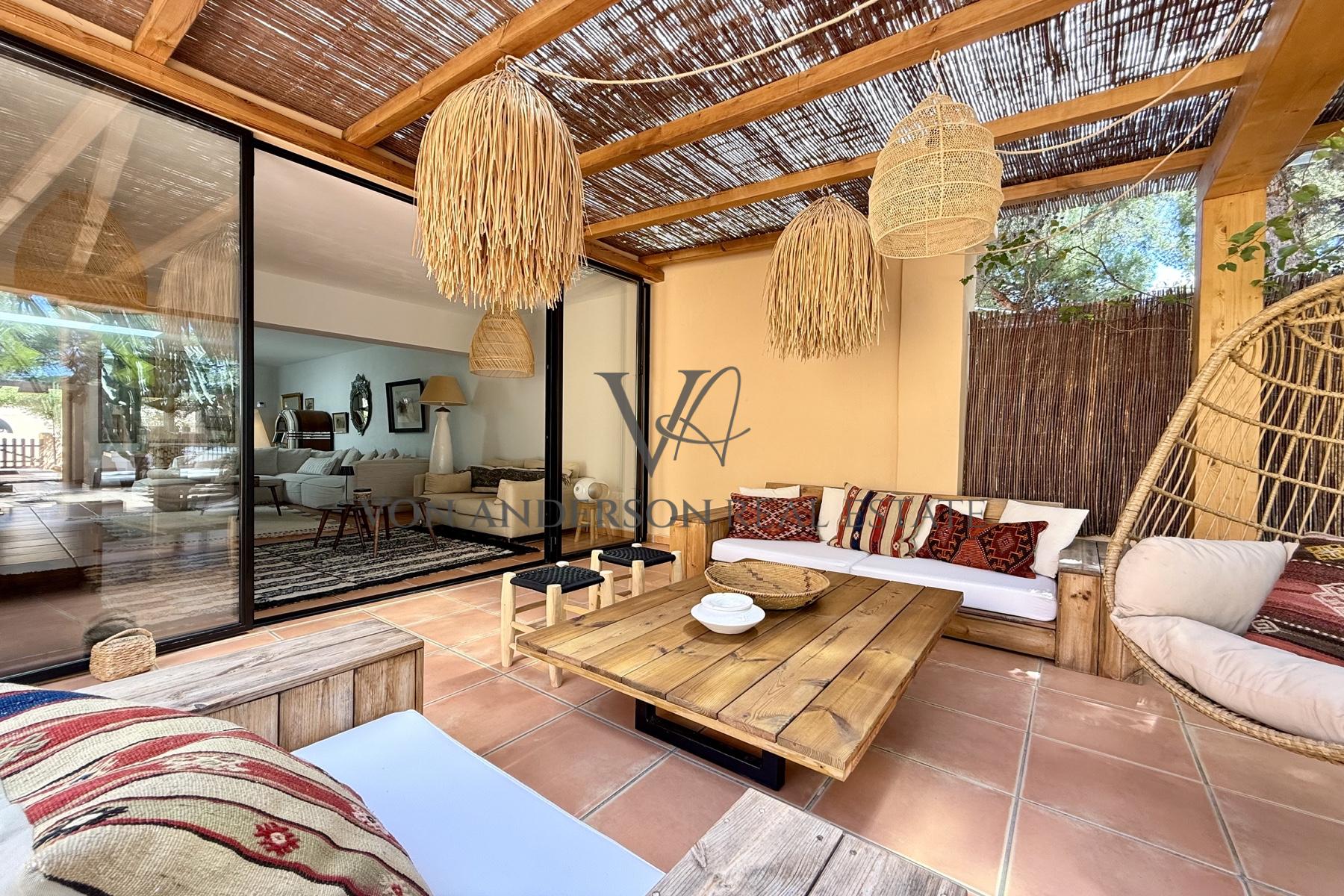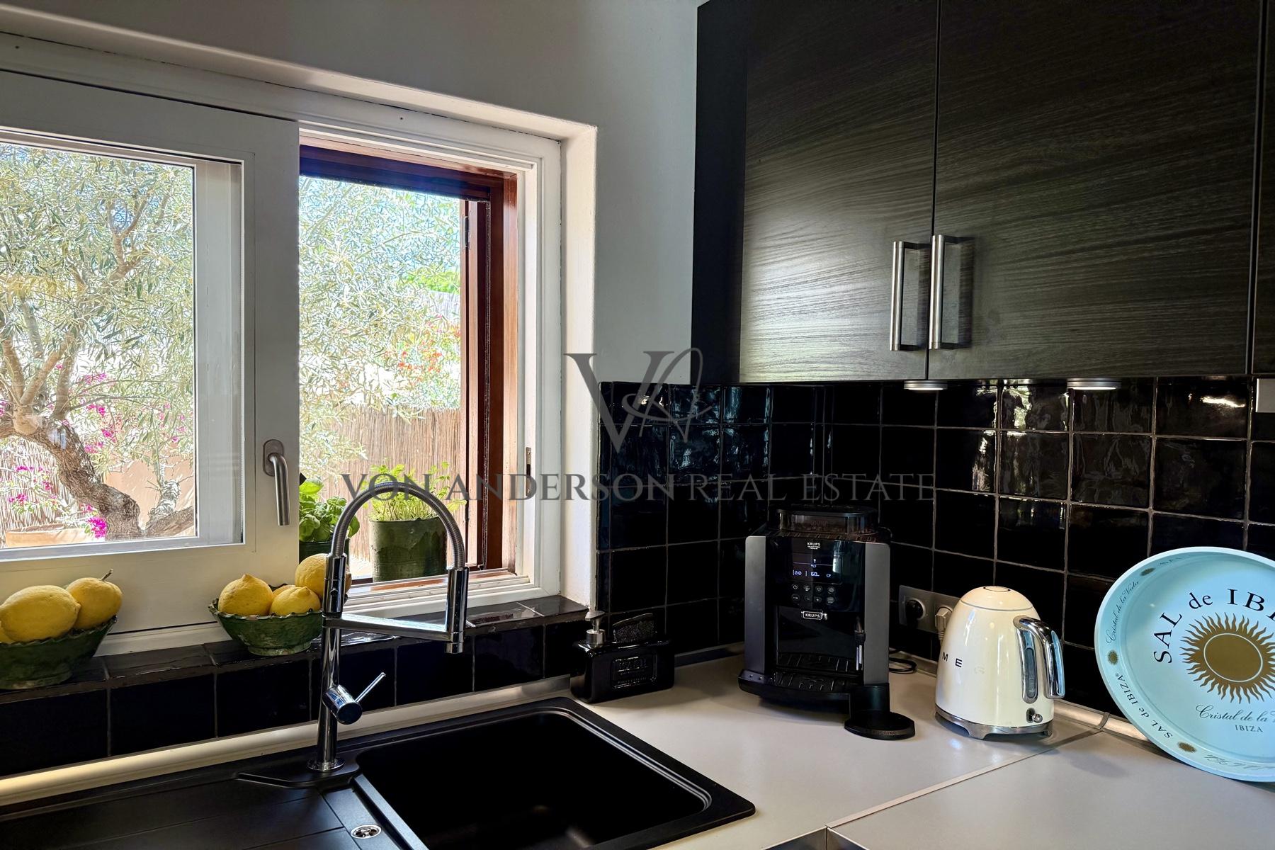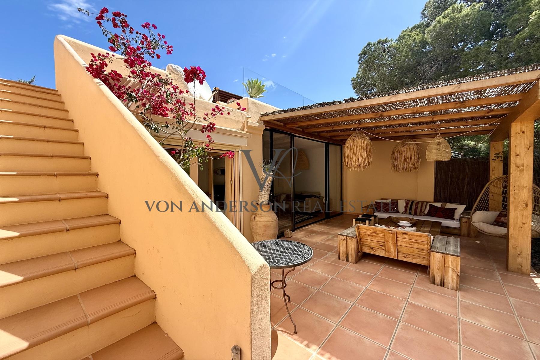 Elegante adosado de una sola planta cerca de Cala Tarida con jardín privado y terraza en la azotea