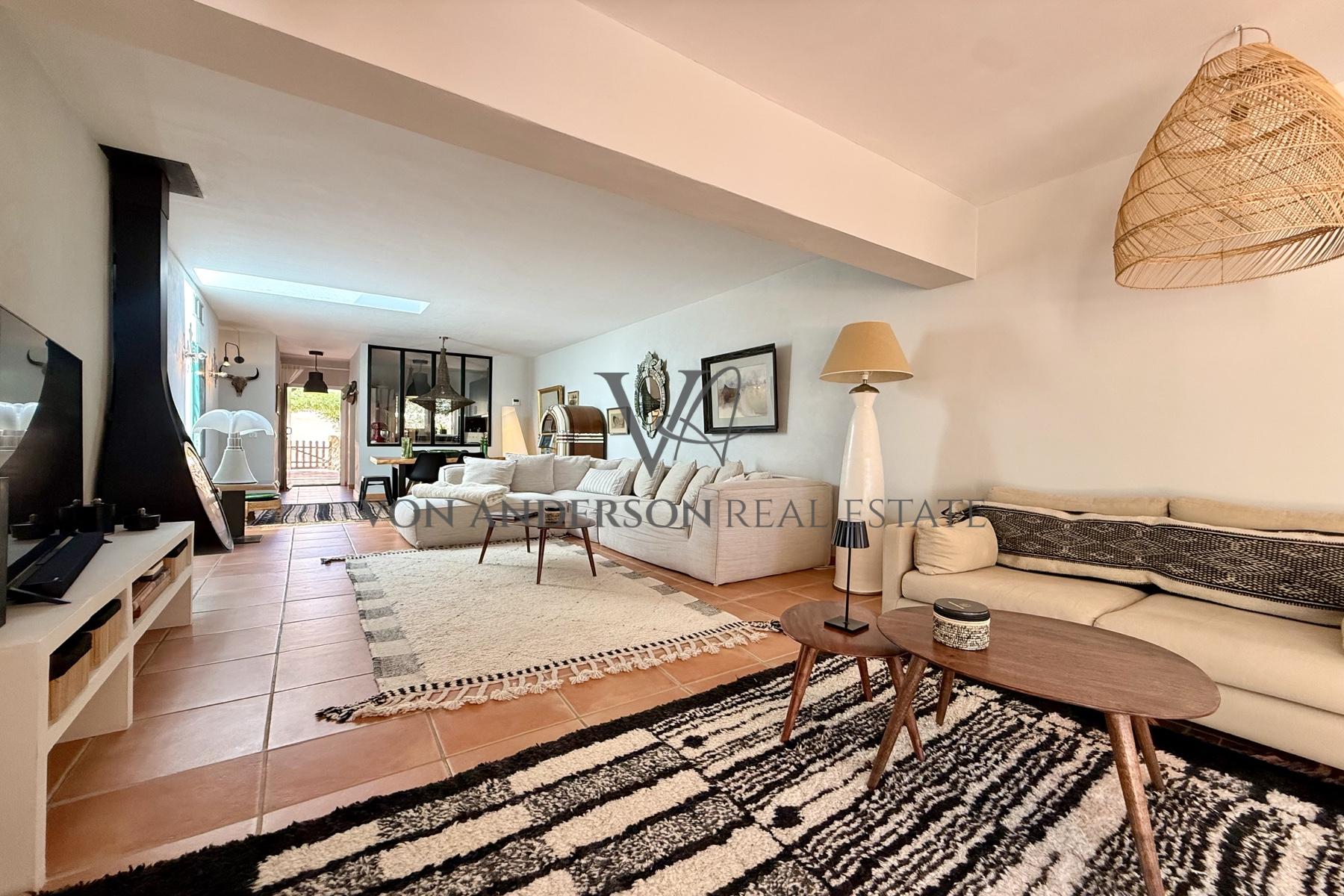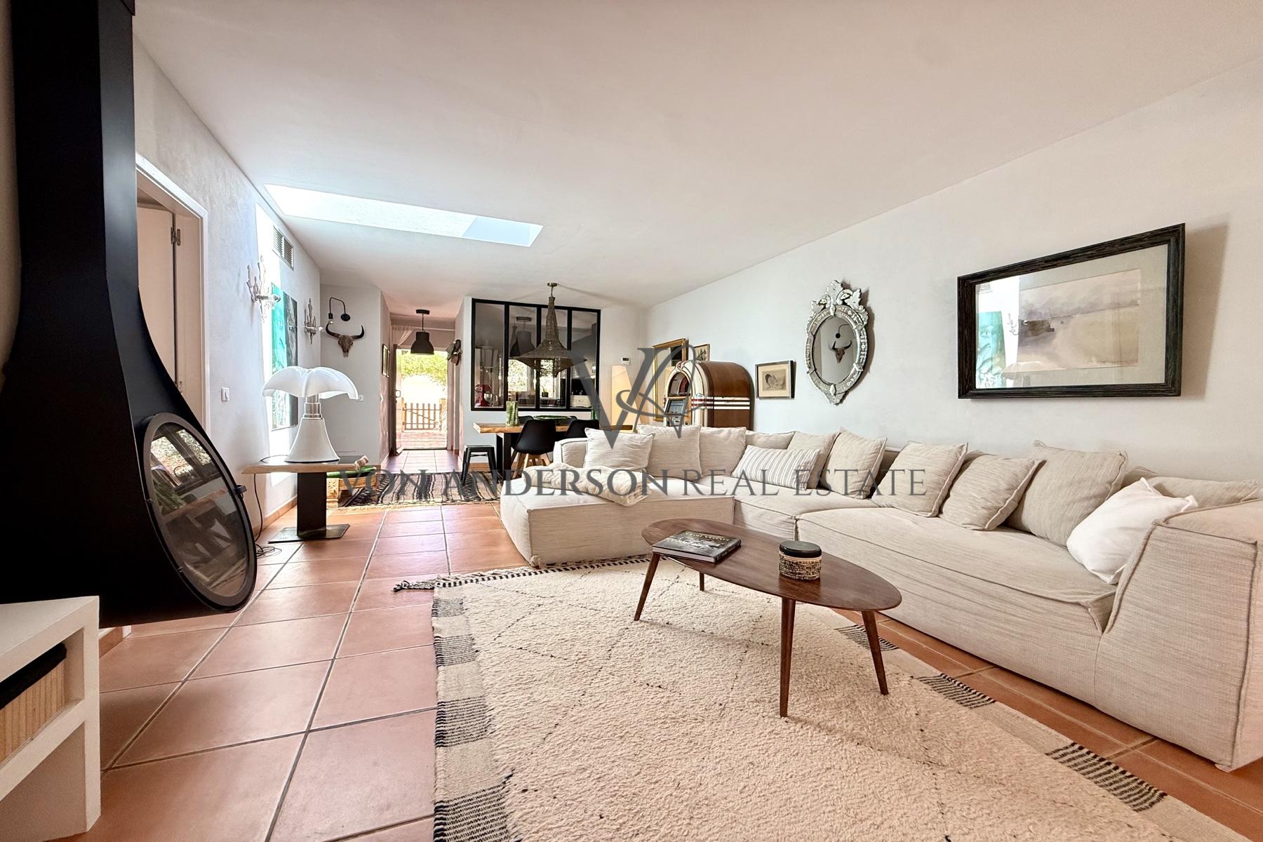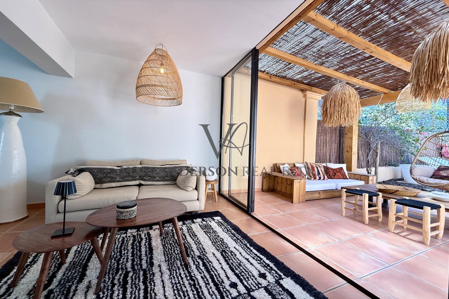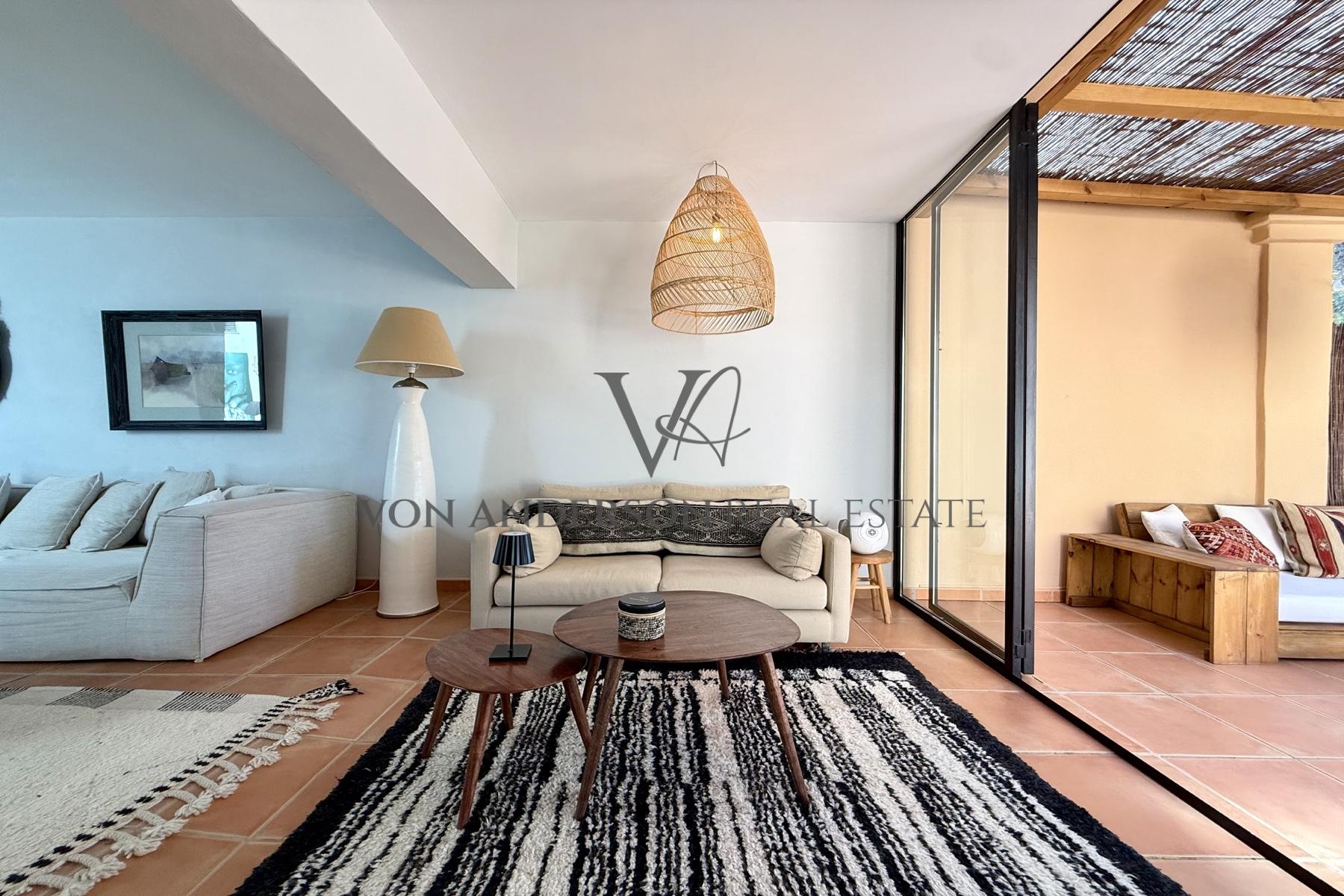 Elegante adosado de una sola planta cerca de Cala Tarida con jardín privado y terraza en la azotea
