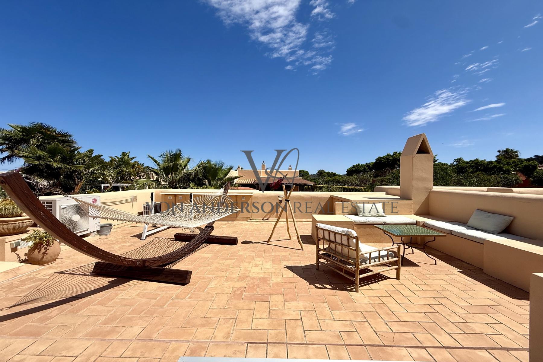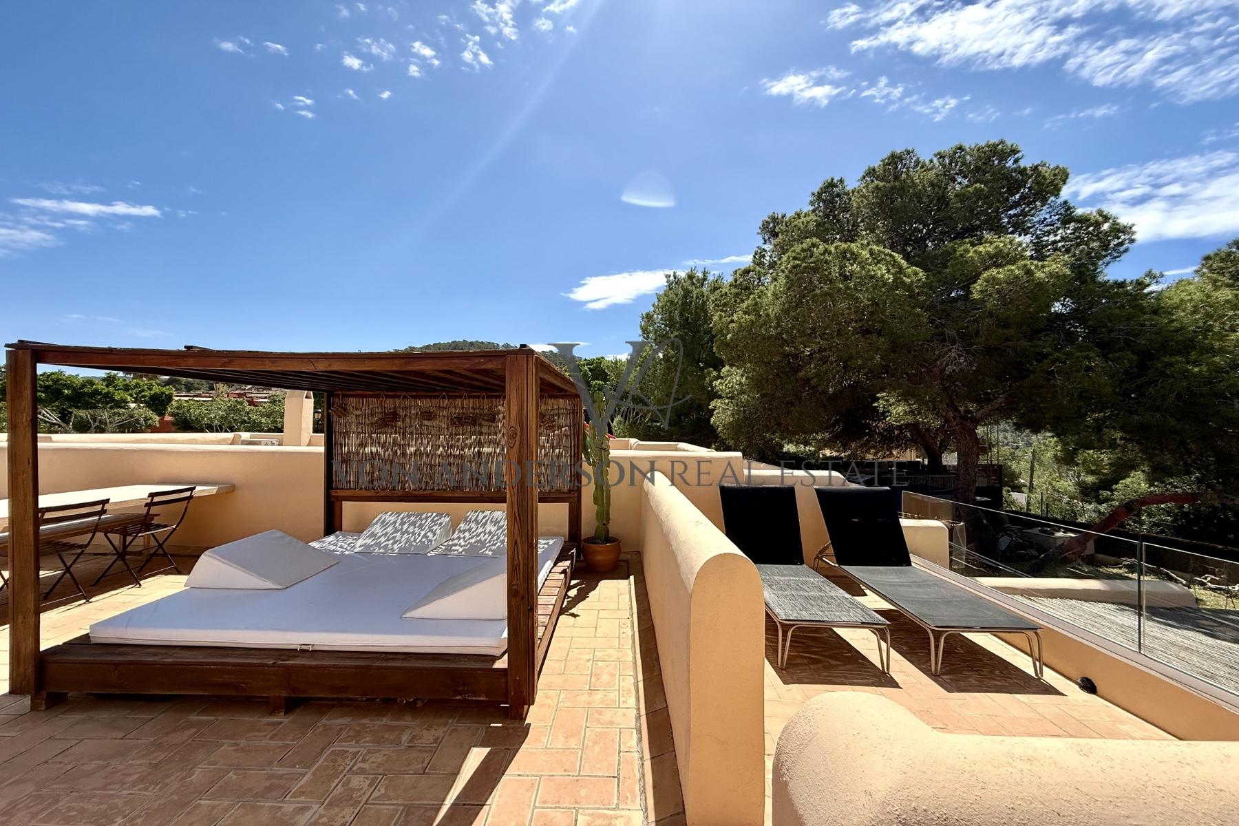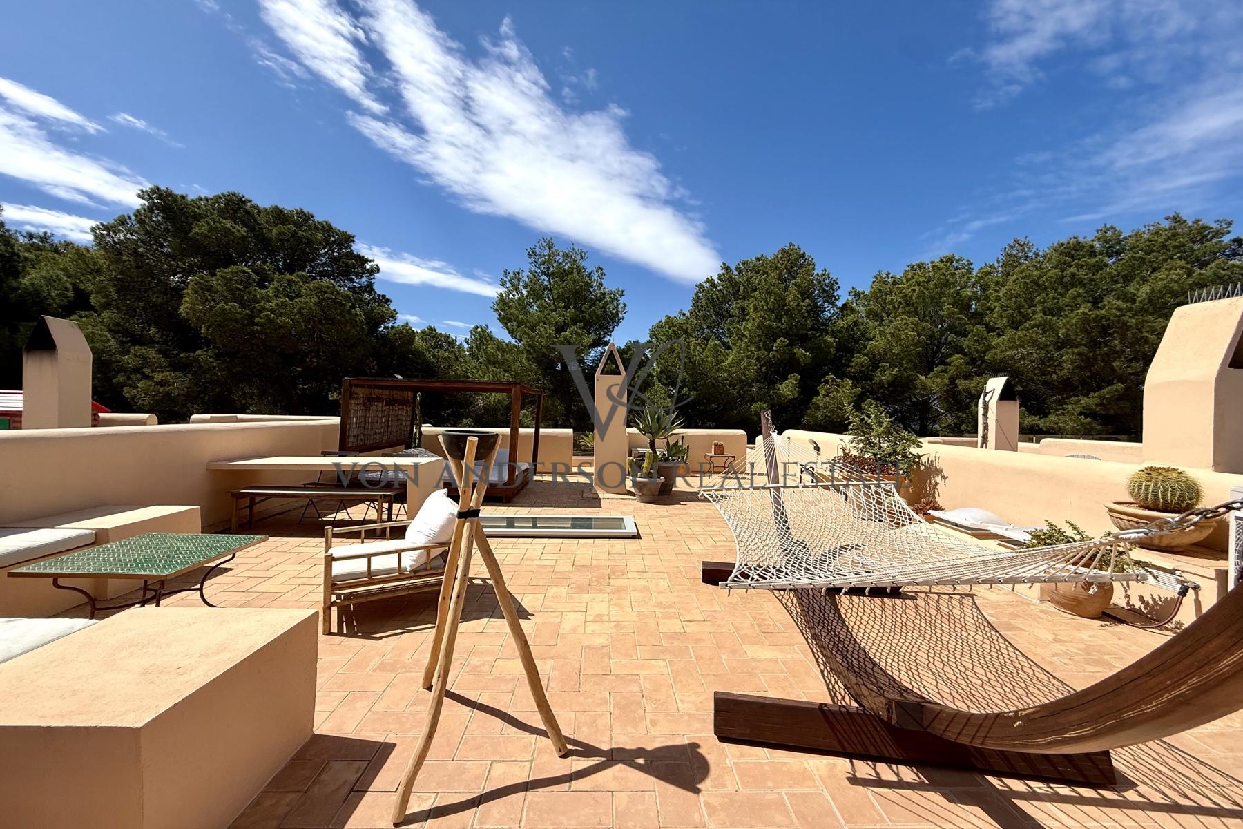 Los 255 m² de espacio exterior privado incluyen varias terrazas, una zona de comedor a la sombra, una pérgola y una gran terraza en la azotea con impresionantes vistas al mar y al paisaje circundante, perfecta para disfrutar de las emblemáticas puestas de sol de Ibiza.