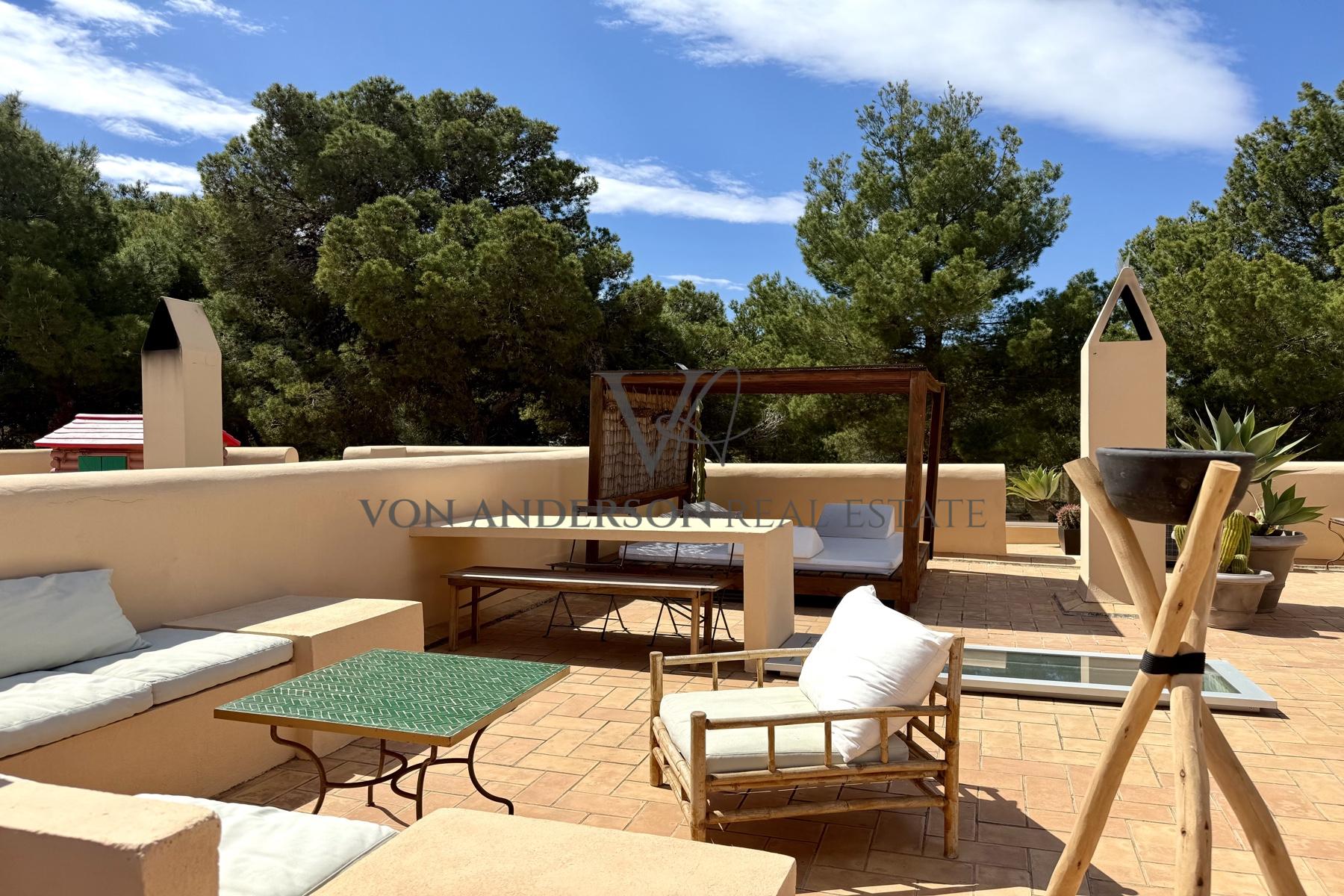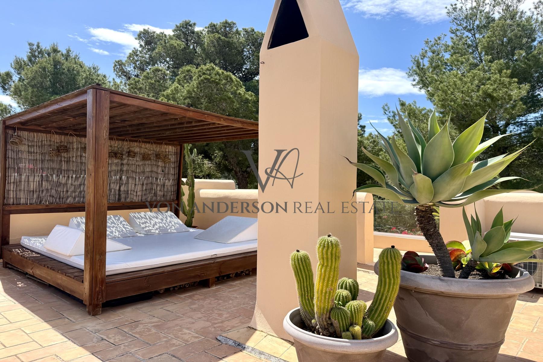 Los 255 m² de espacio exterior privado incluyen varias terrazas, una zona de comedor a la sombra, una pérgola y una gran terraza en la azotea con impresionantes vistas al mar y al paisaje circundante, perfecta para disfrutar de las emblemáticas puestas de sol de Ibiza.