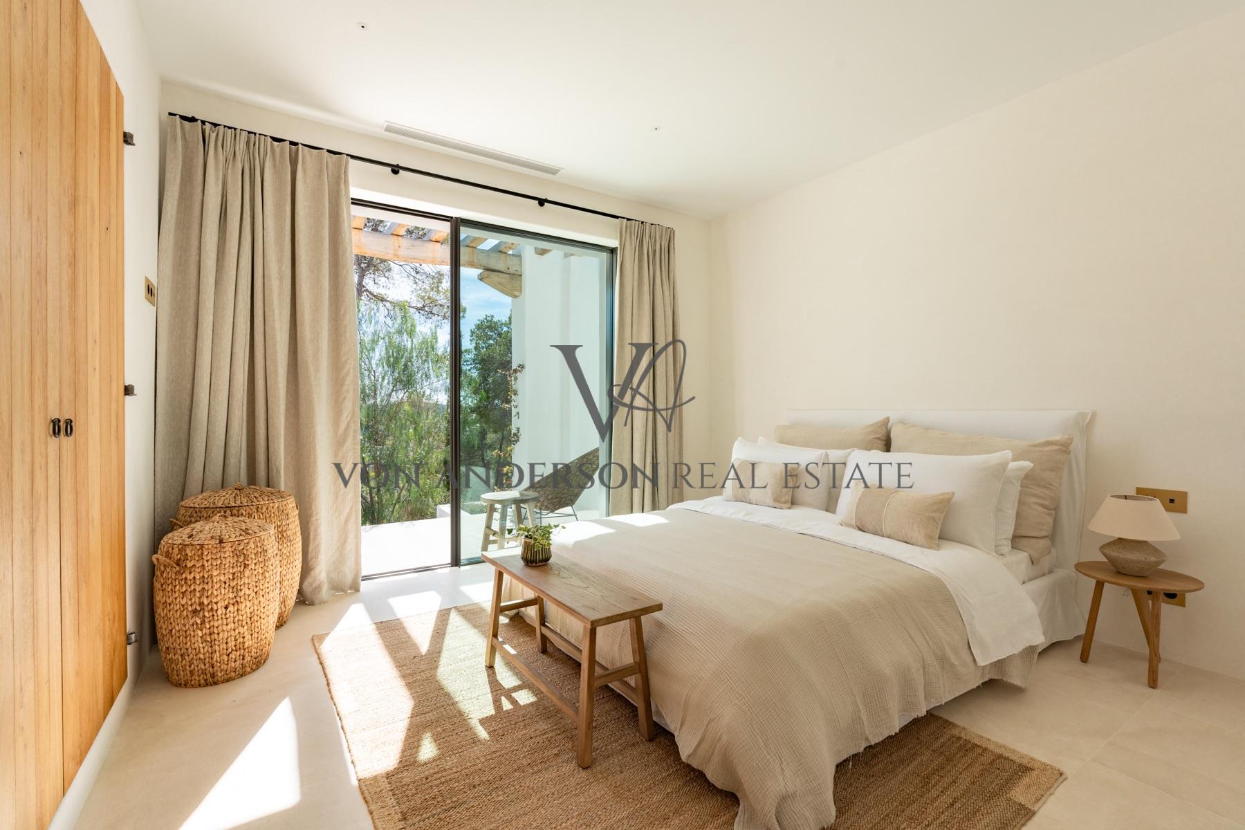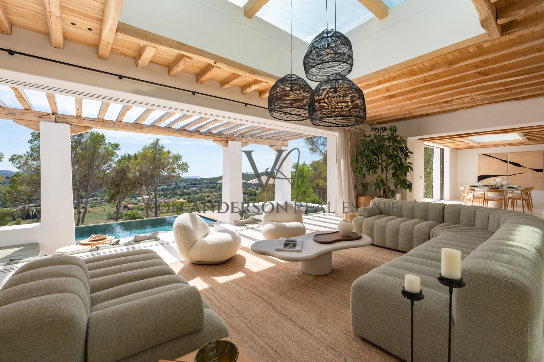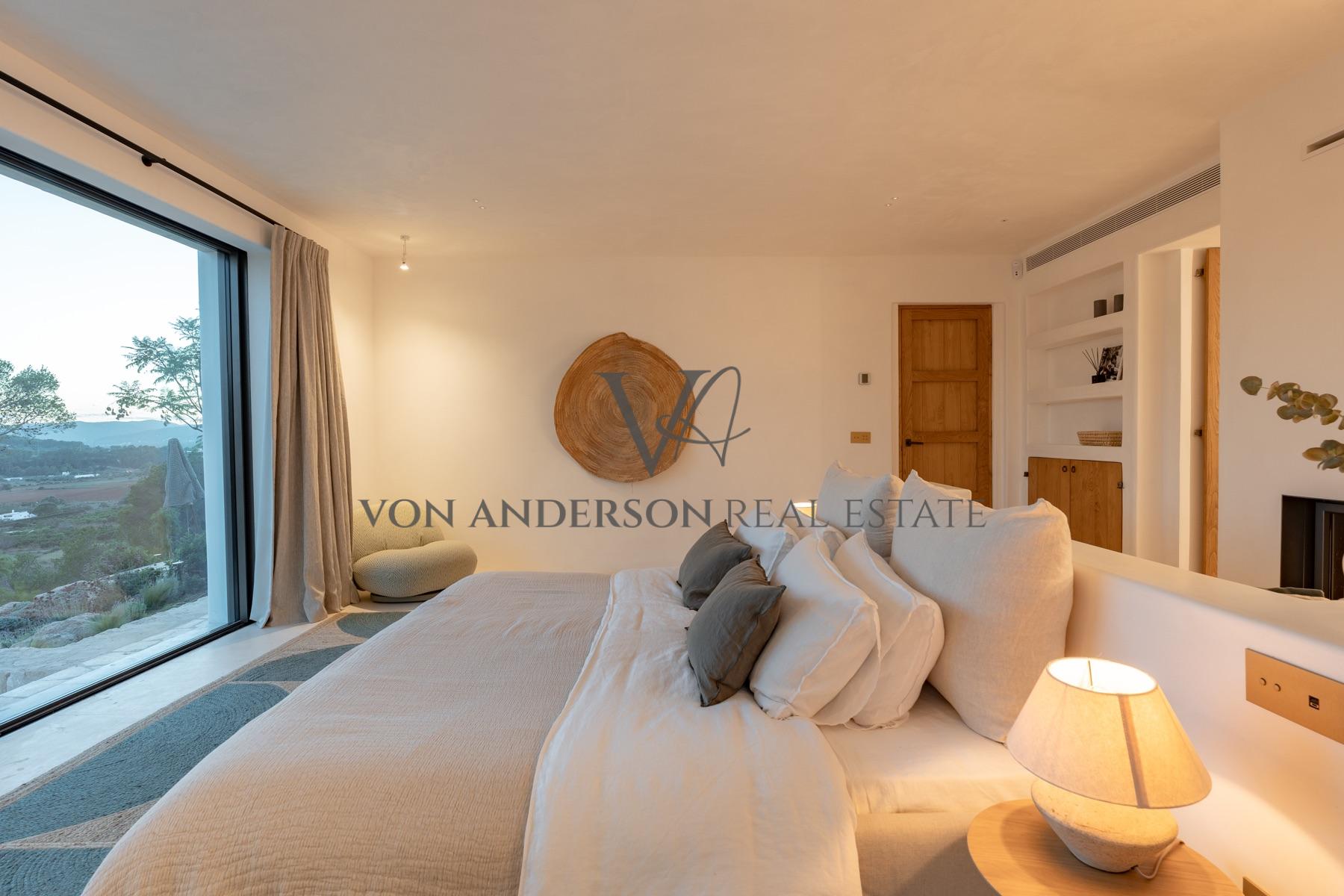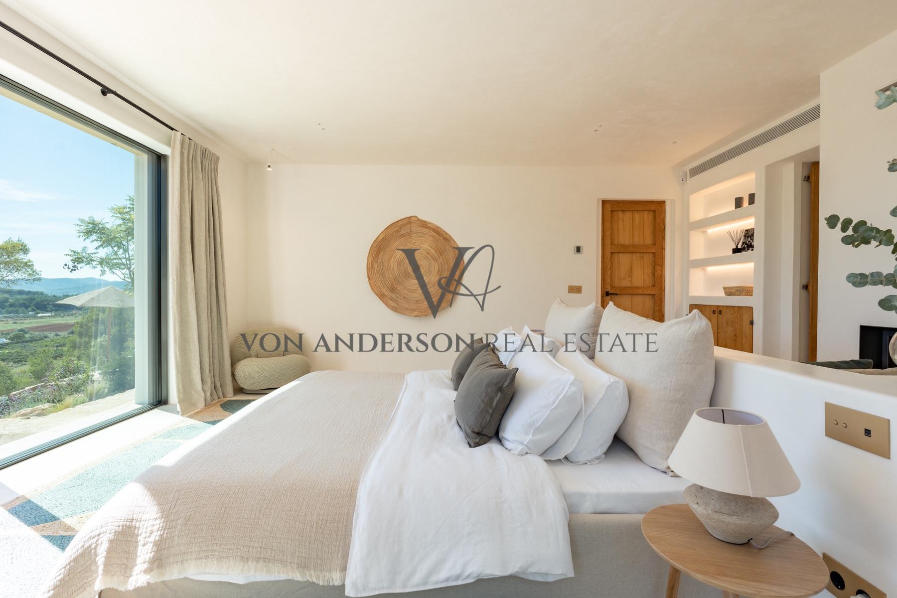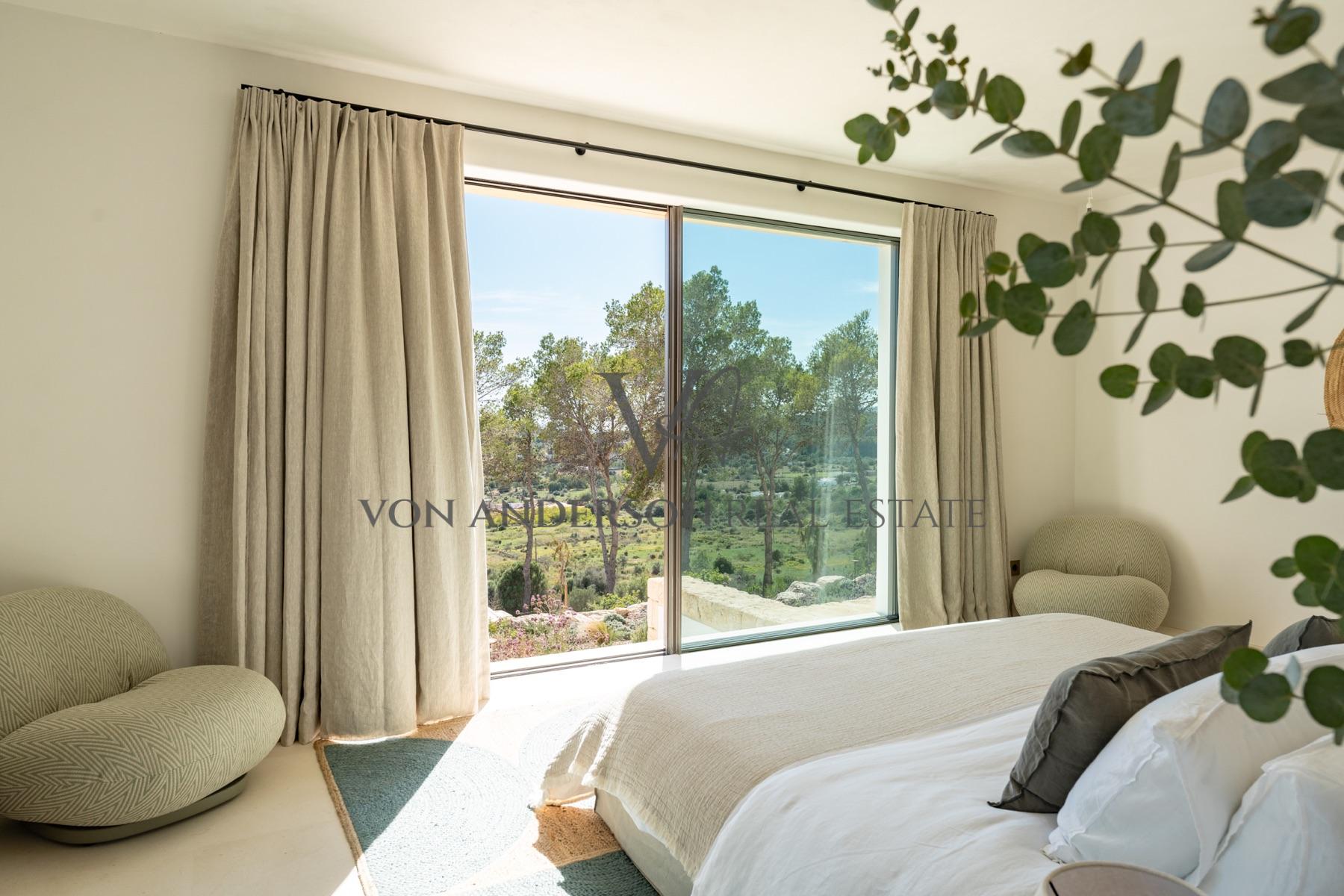 La villa comprend cinq chambres spacieuses, quatre salles de bains élégantes et un plan ouvert qui relie harmonieusement la cuisine sur mesure, le salon élégant et la salle à manger raffinée. Les portes coulissantes du sol au plafond inondent les intérieurs de lumière naturelle, encadrant les vues spectaculaires de la vallée tout en favorisant une atmosphère sereine et aérée. L'utilisation de matériaux naturels, tels que le bois et la pierre, apporte chaleur et authenticité, faisant écho au caractère des fincas historiques d'Ibiza.
