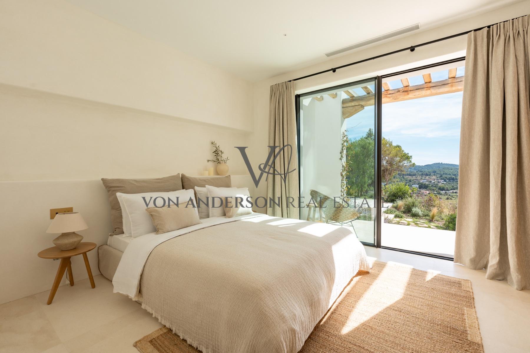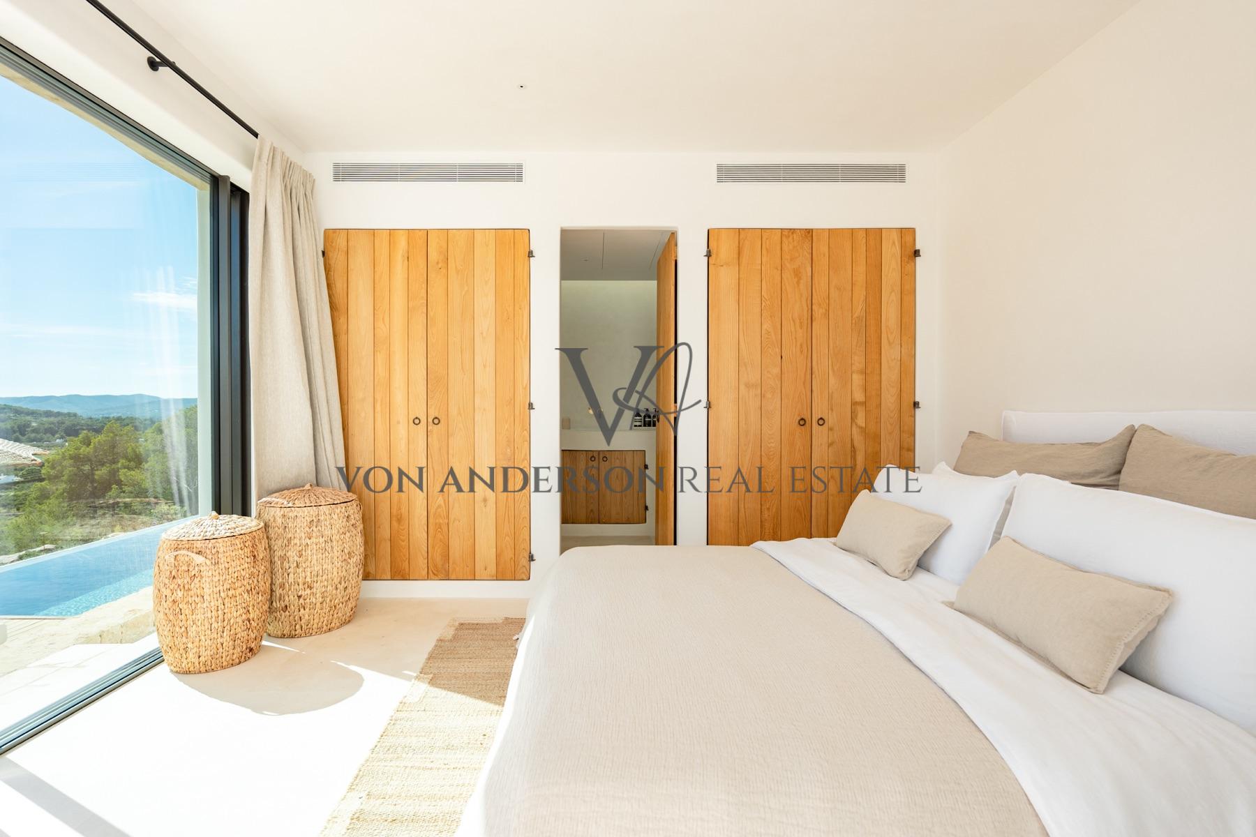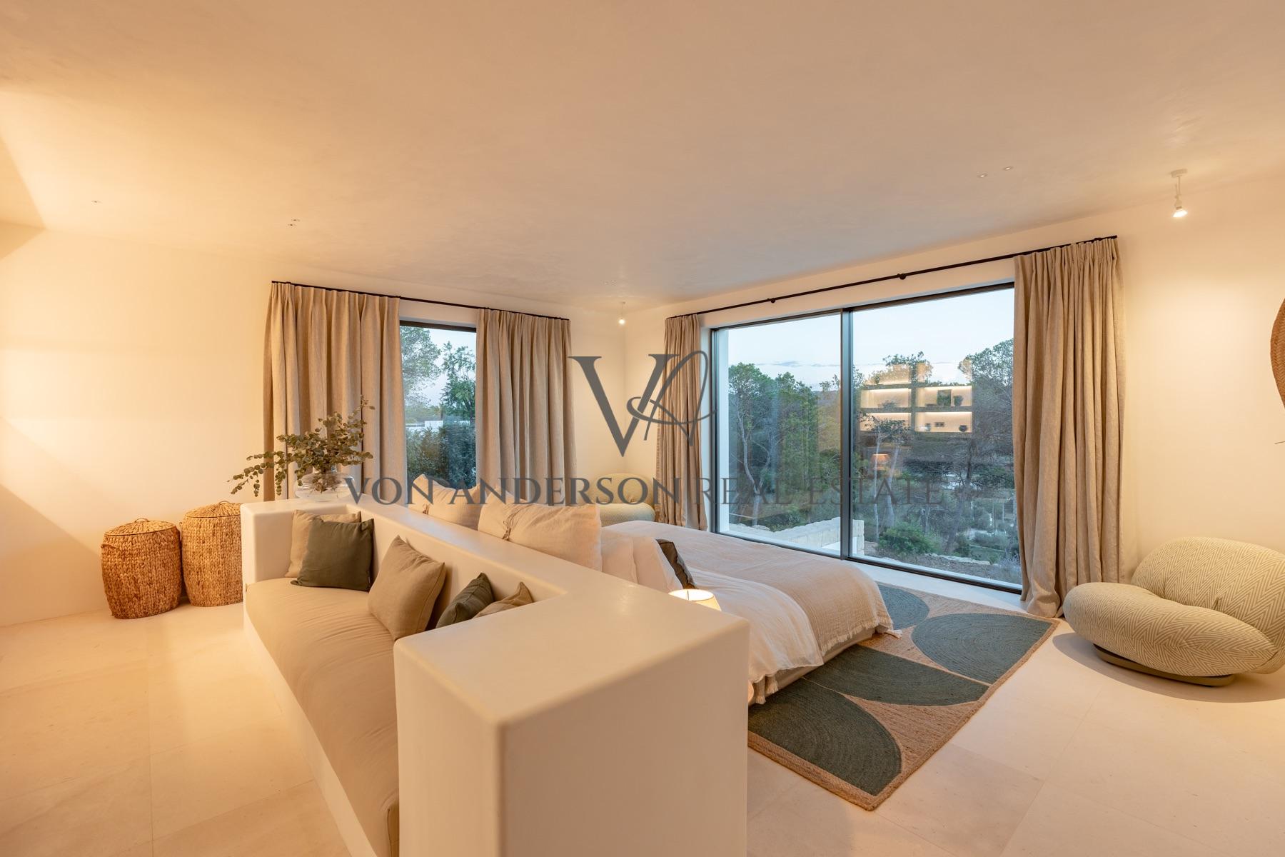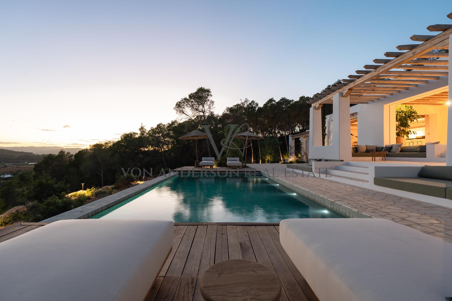 La villa comprend cinq chambres spacieuses, quatre salles de bains élégantes et un plan ouvert qui relie harmonieusement la cuisine sur mesure, le salon élégant et la salle à manger raffinée. Les portes coulissantes du sol au plafond inondent les intérieurs de lumière naturelle, encadrant les vues spectaculaires de la vallée tout en favorisant une atmosphère sereine et aérée. L'utilisation de matériaux naturels, tels que le bois et la pierre, apporte chaleur et authenticité, faisant écho au caractère des fincas historiques d'Ibiza.
