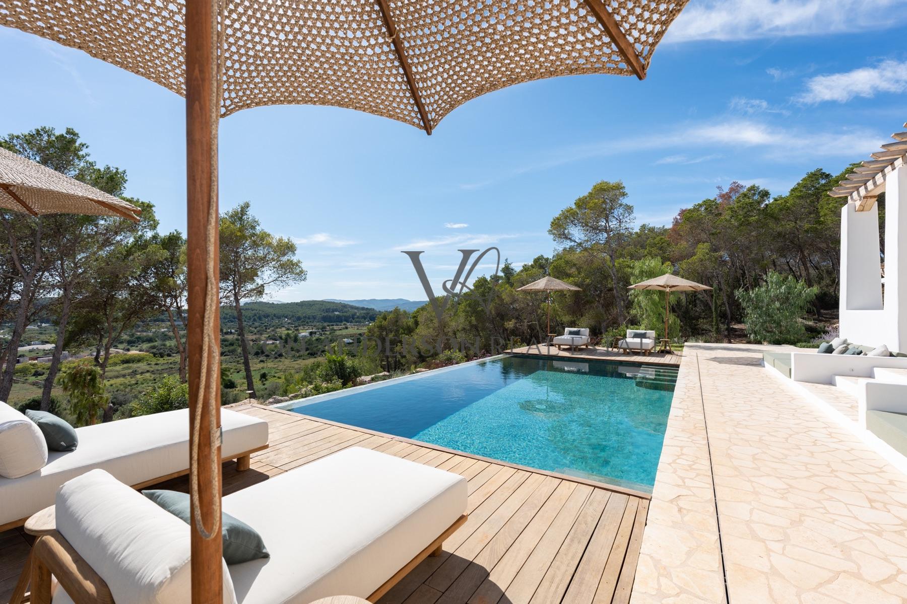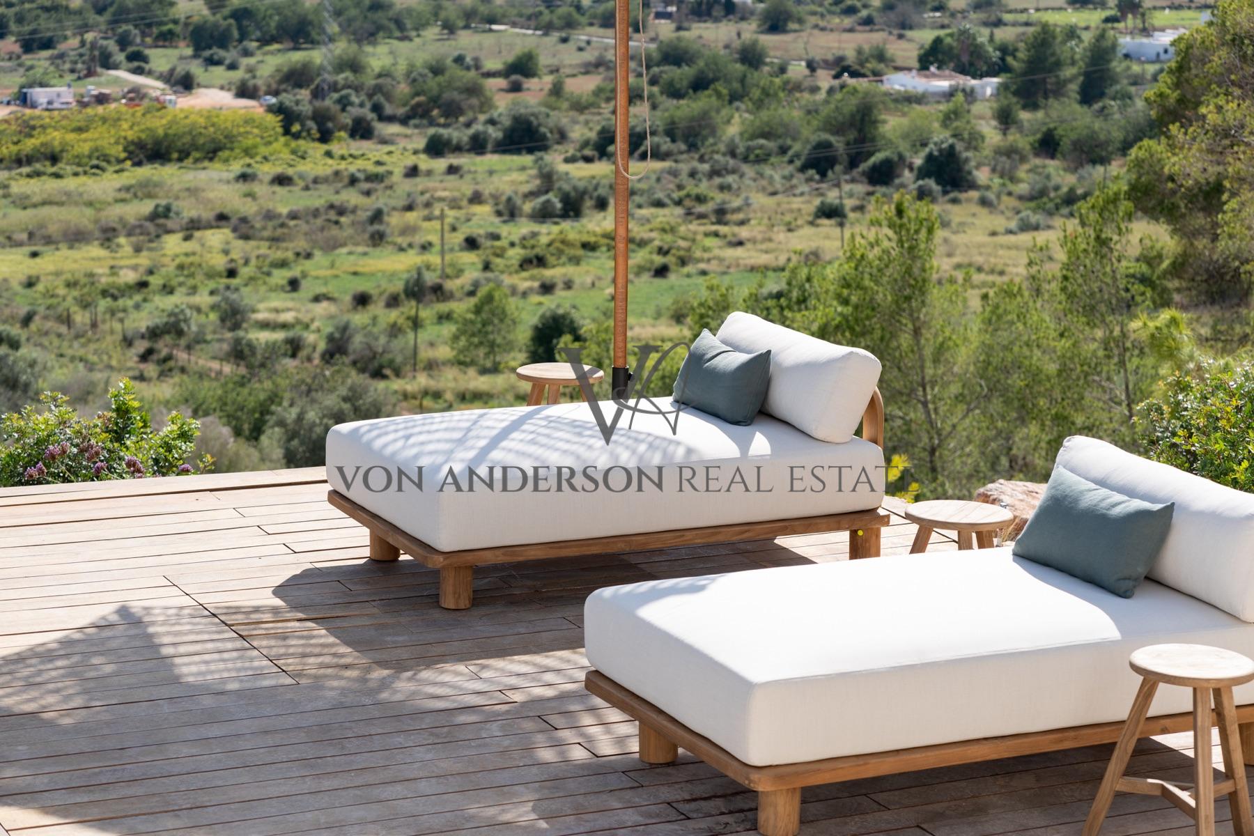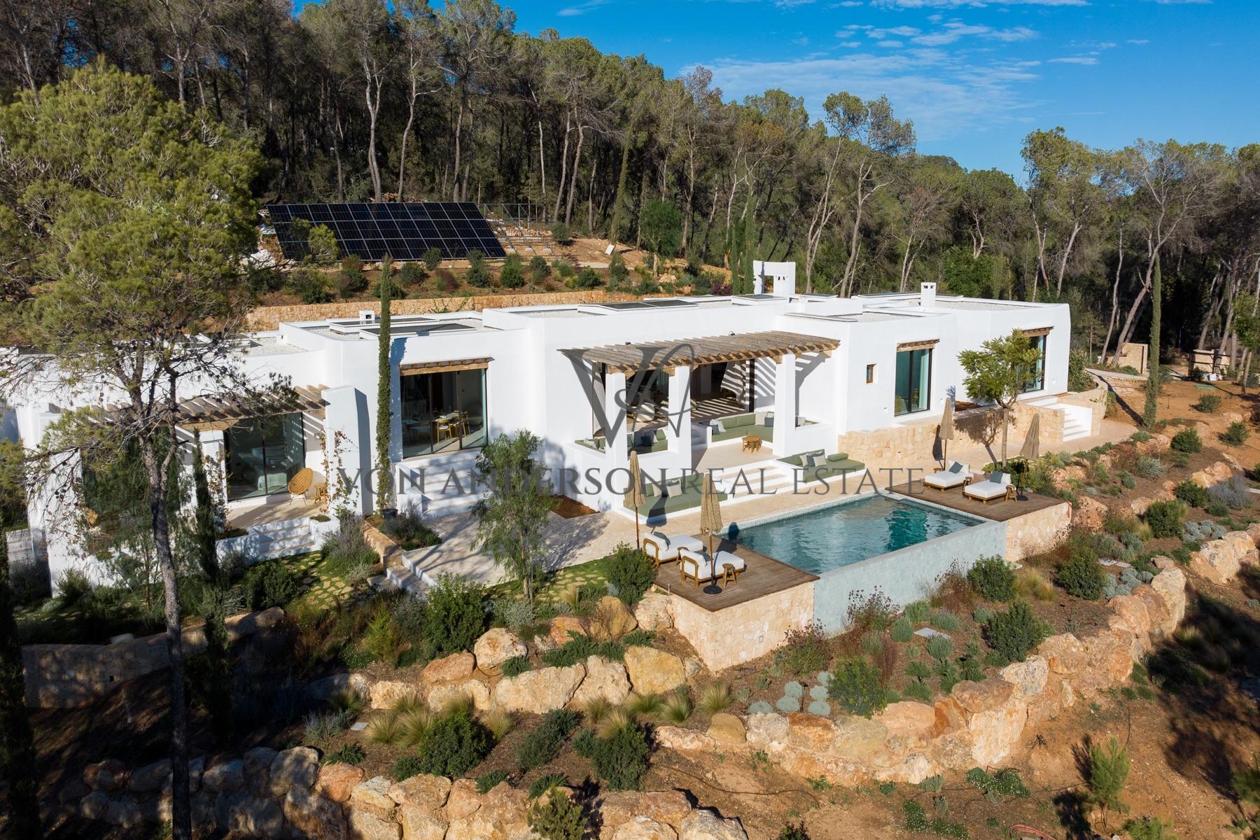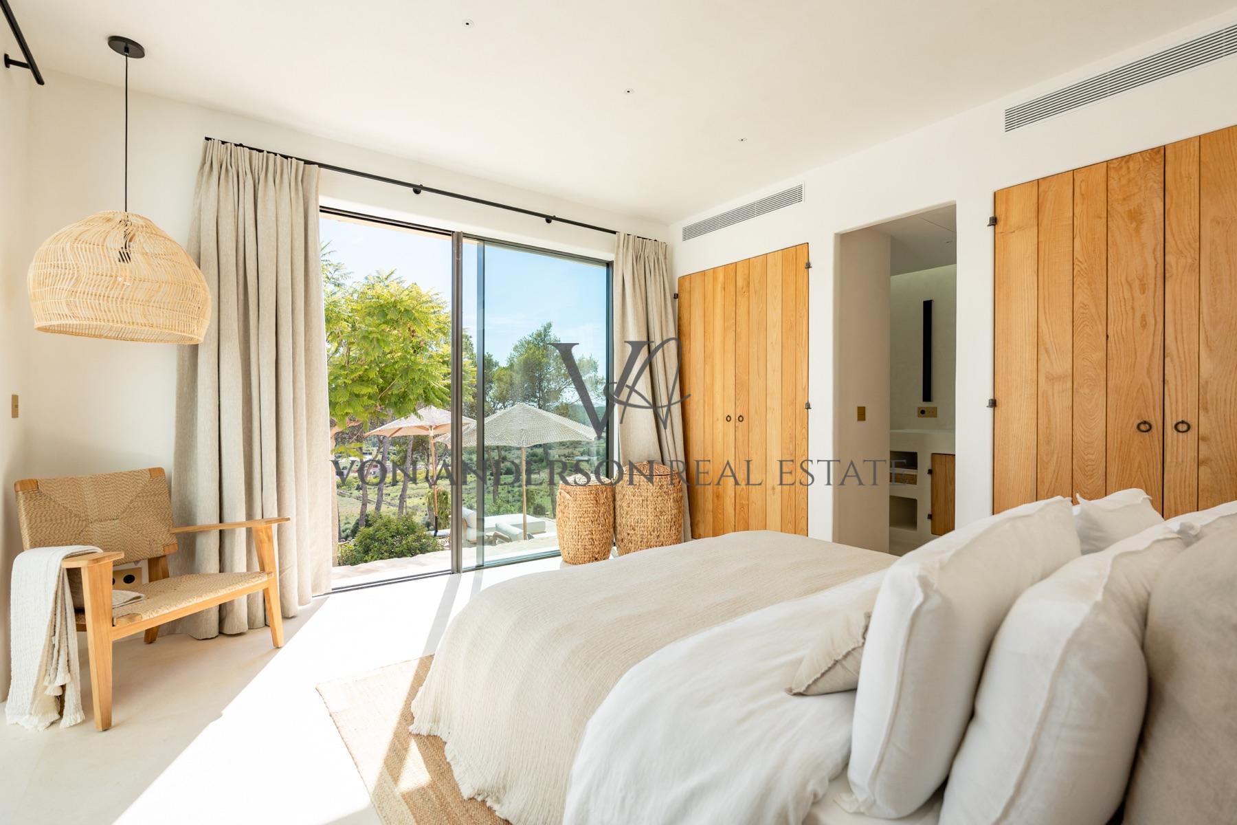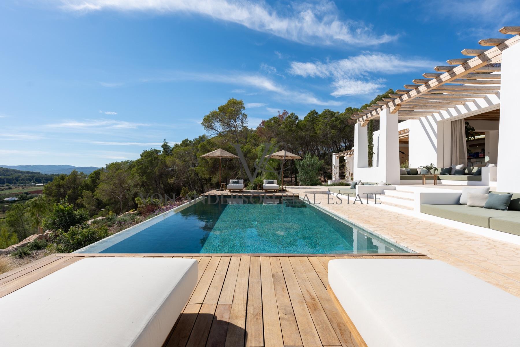 La villa comprend cinq chambres spacieuses, quatre salles de bains élégantes et un plan ouvert qui relie harmonieusement la cuisine sur mesure, le salon élégant et la salle à manger raffinée. Les portes coulissantes du sol au plafond inondent les intérieurs de lumière naturelle, encadrant les vues spectaculaires de la vallée tout en favorisant une atmosphère sereine et aérée. L'utilisation de matériaux naturels, tels que le bois et la pierre, apporte chaleur et authenticité, faisant écho au caractère des fincas historiques d'Ibiza.