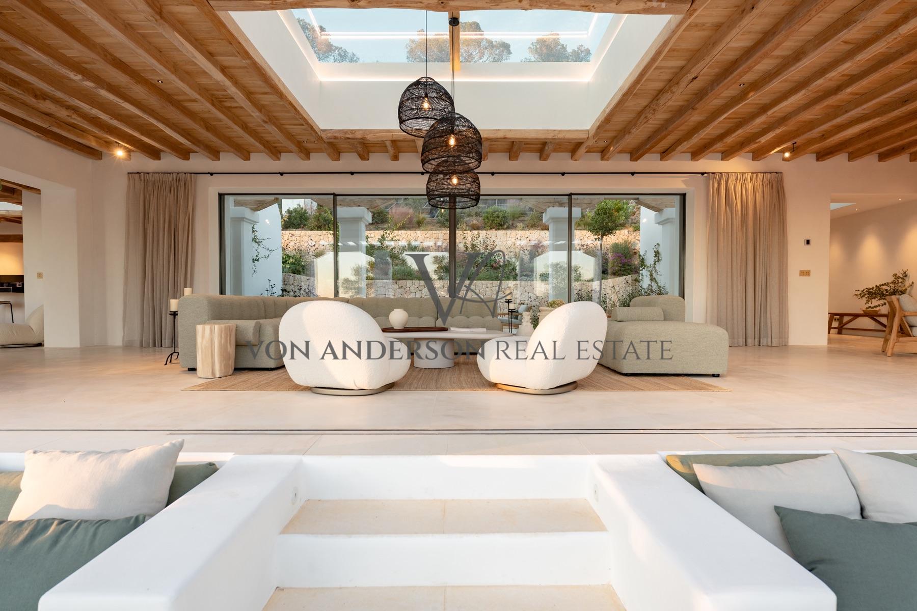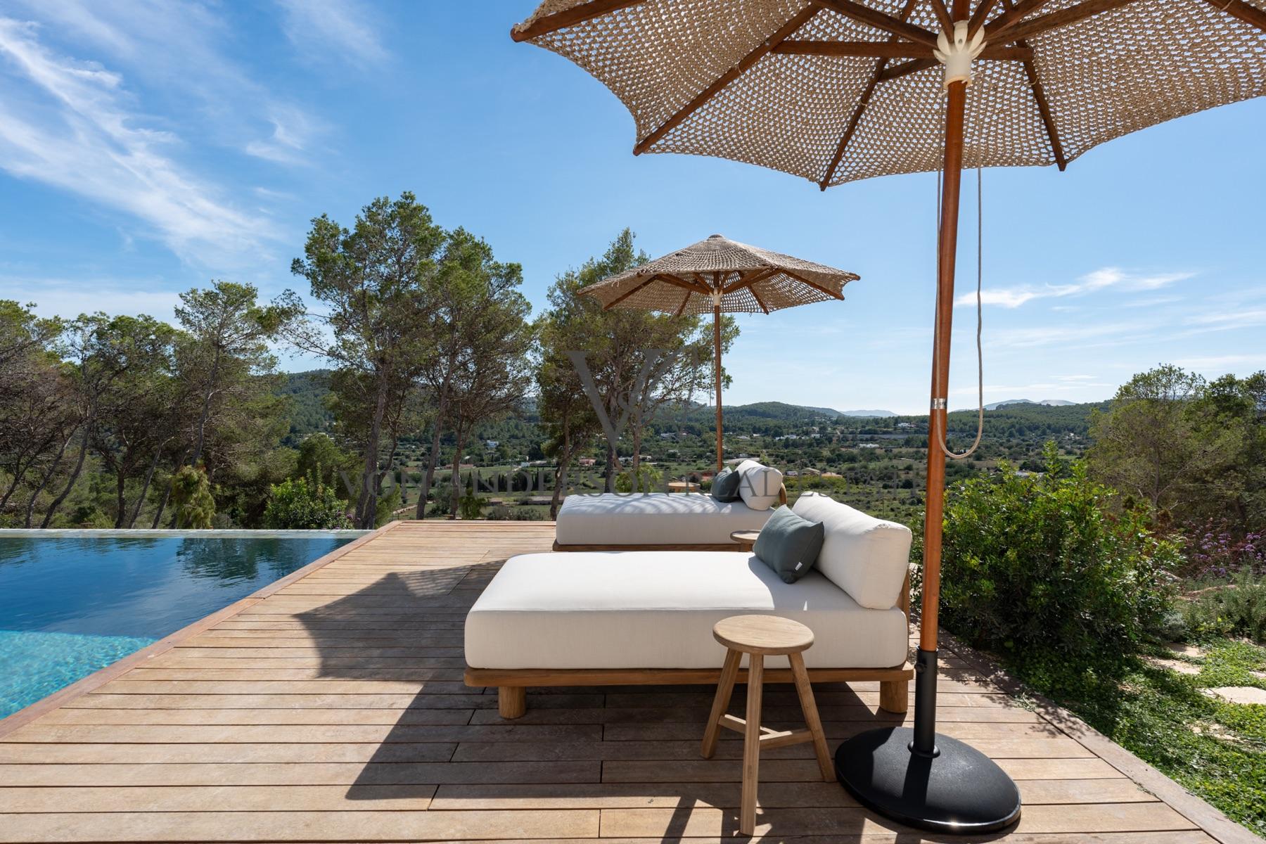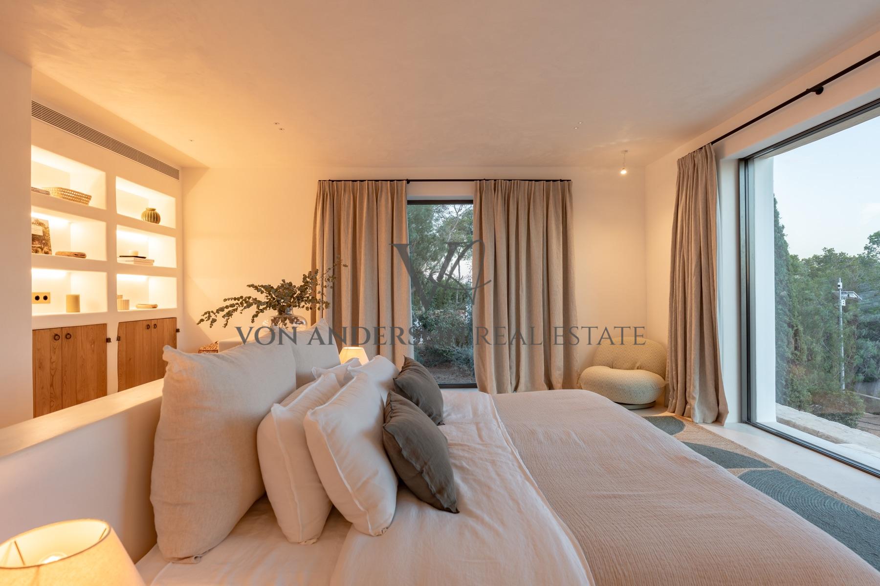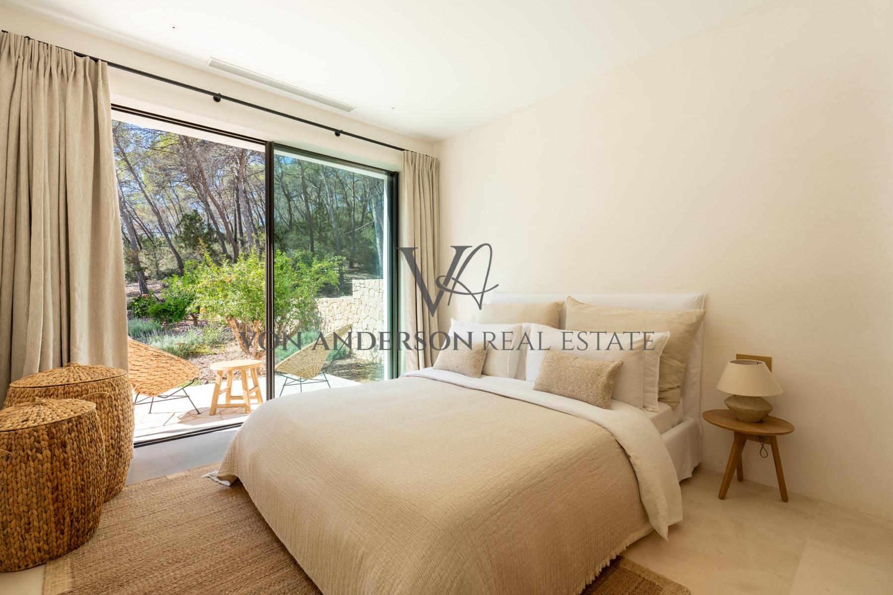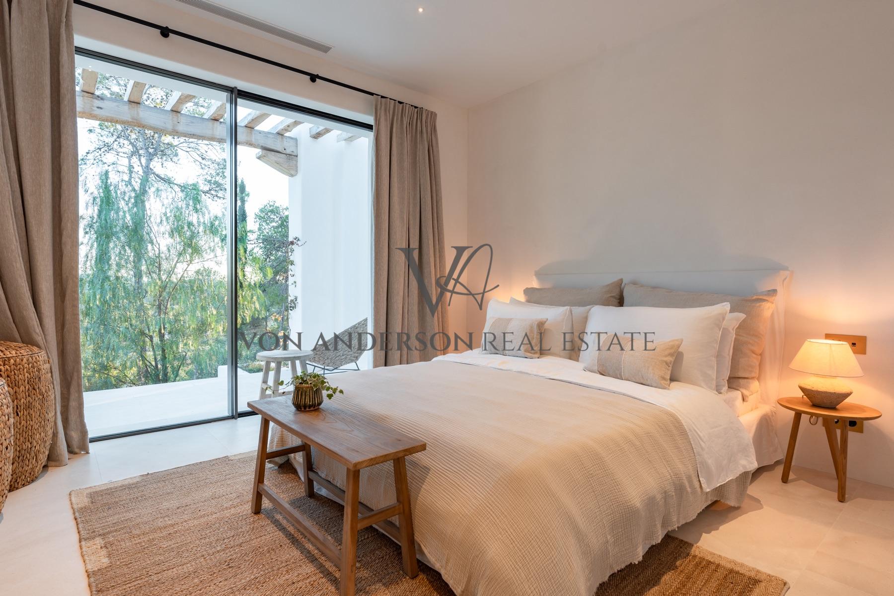 La villa comprend cinq chambres spacieuses, quatre salles de bains élégantes et un plan ouvert qui relie harmonieusement la cuisine sur mesure, le salon élégant et la salle à manger raffinée. Les portes coulissantes du sol au plafond inondent les intérieurs de lumière naturelle, encadrant les vues spectaculaires de la vallée tout en favorisant une atmosphère sereine et aérée. L'utilisation de matériaux naturels, tels que le bois et la pierre, apporte chaleur et authenticité, faisant écho au caractère des fincas historiques d'Ibiza.