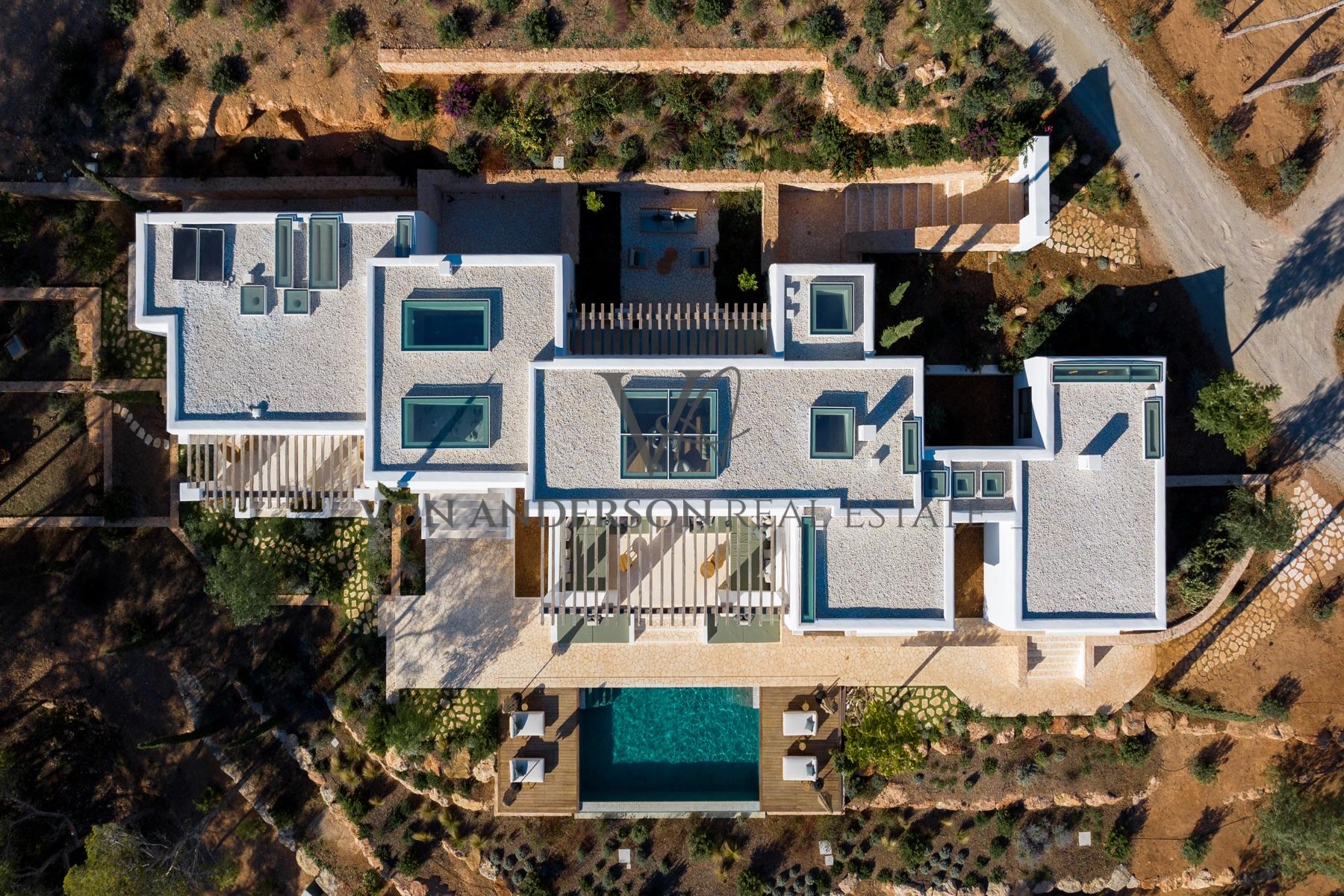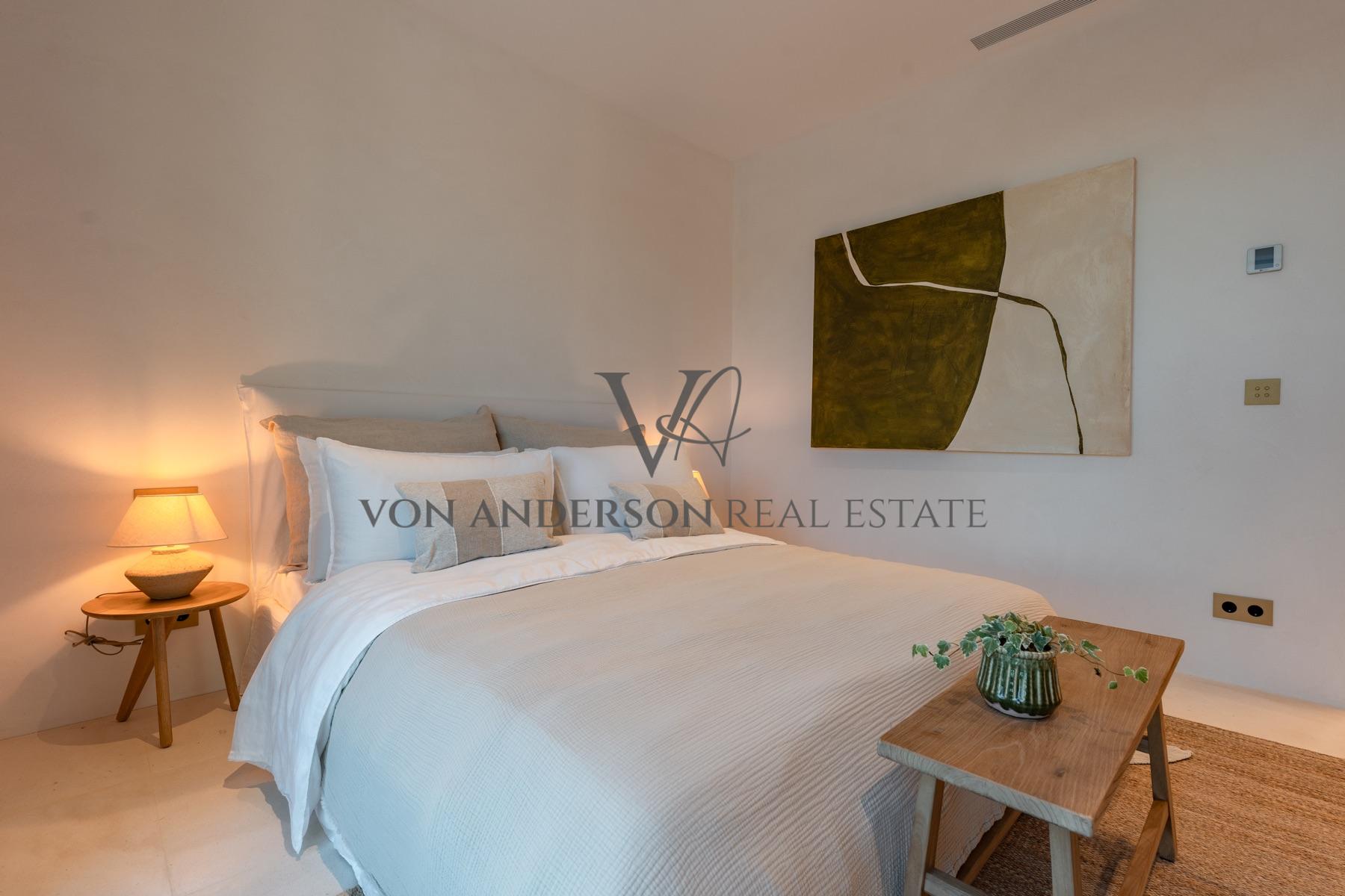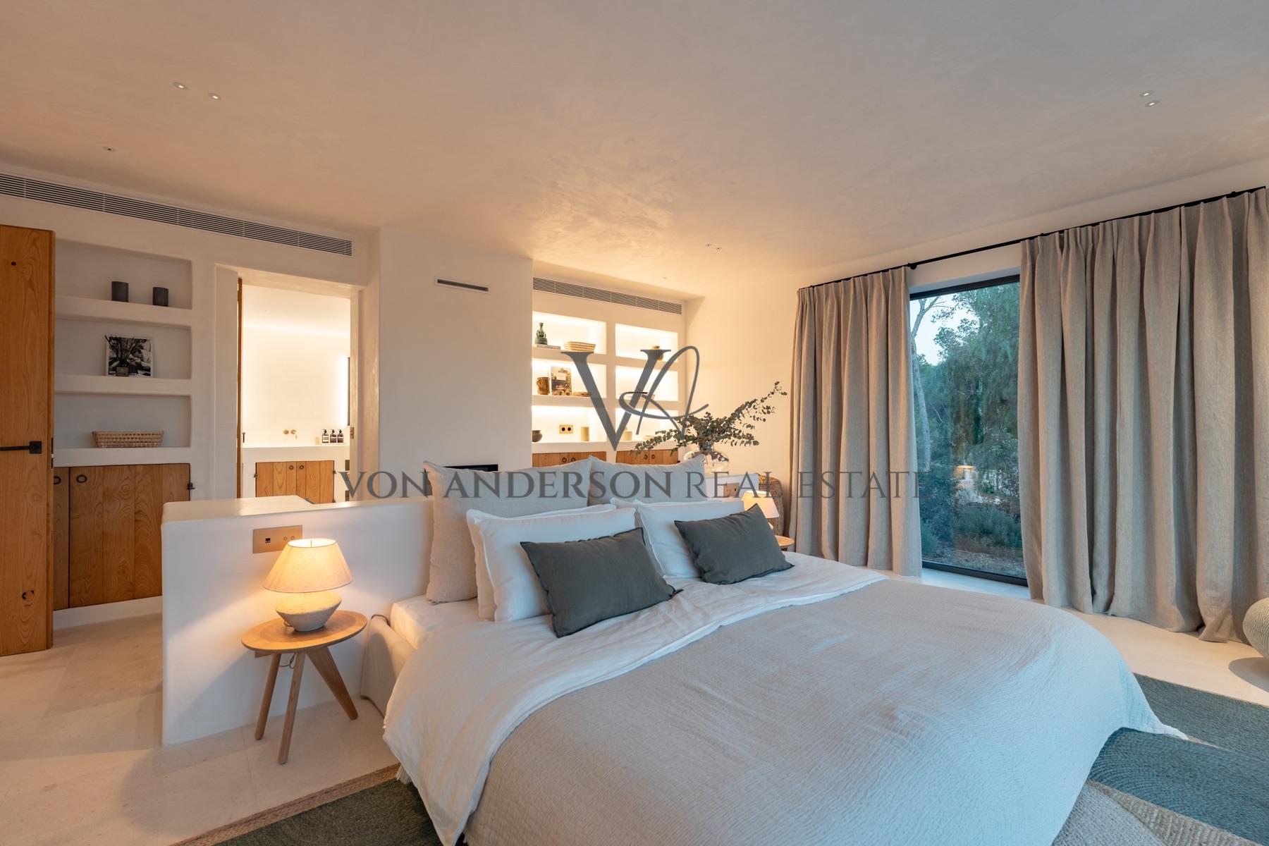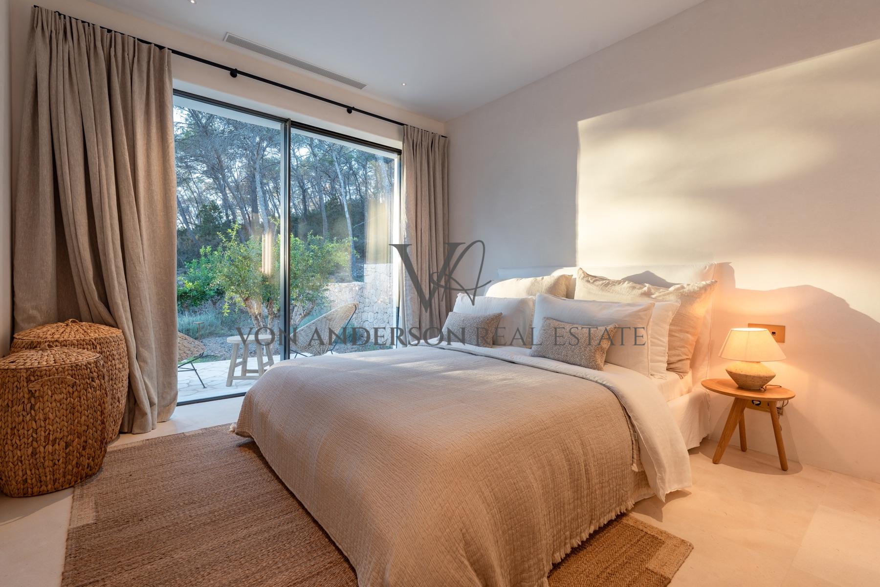La villa comprend cinq chambres spacieuses, quatre salles de bains élégantes et un plan ouvert qui relie harmonieusement la cuisine sur mesure, le salon élégant et la salle à manger raffinée. Les portes coulissantes du sol au plafond inondent les intérieurs de lumière naturelle, encadrant les vues spectaculaires de la vallée tout en favorisant une atmosphère sereine et aérée. L'utilisation de matériaux naturels, tels que le bois et la pierre, apporte chaleur et authenticité, faisant écho au caractère des fincas historiques d'Ibiza.