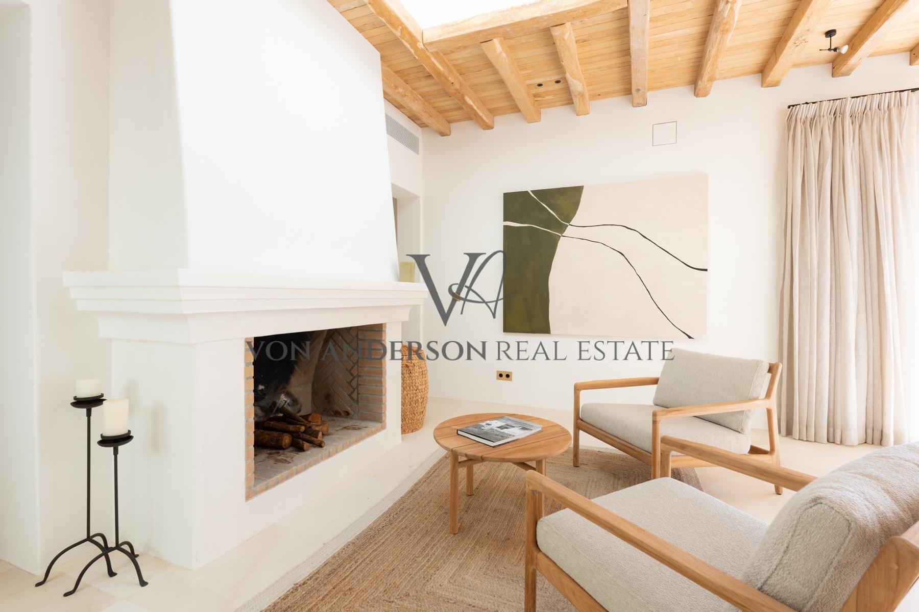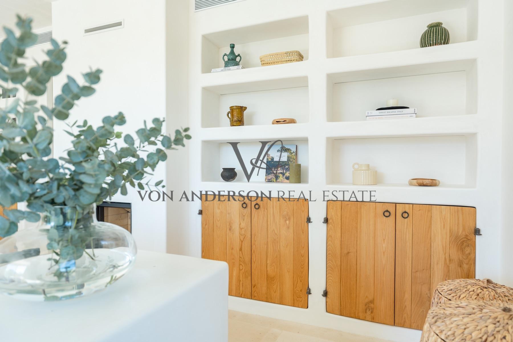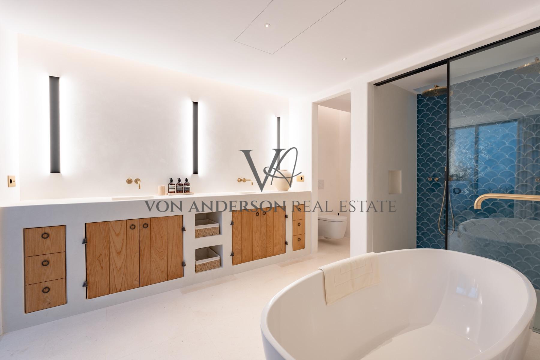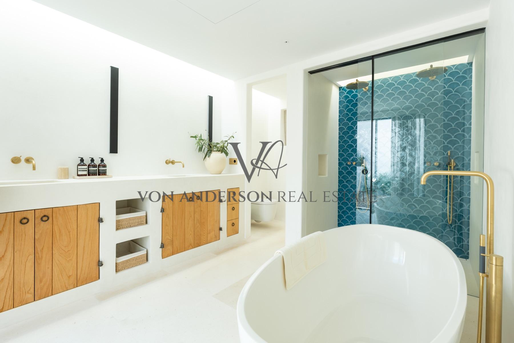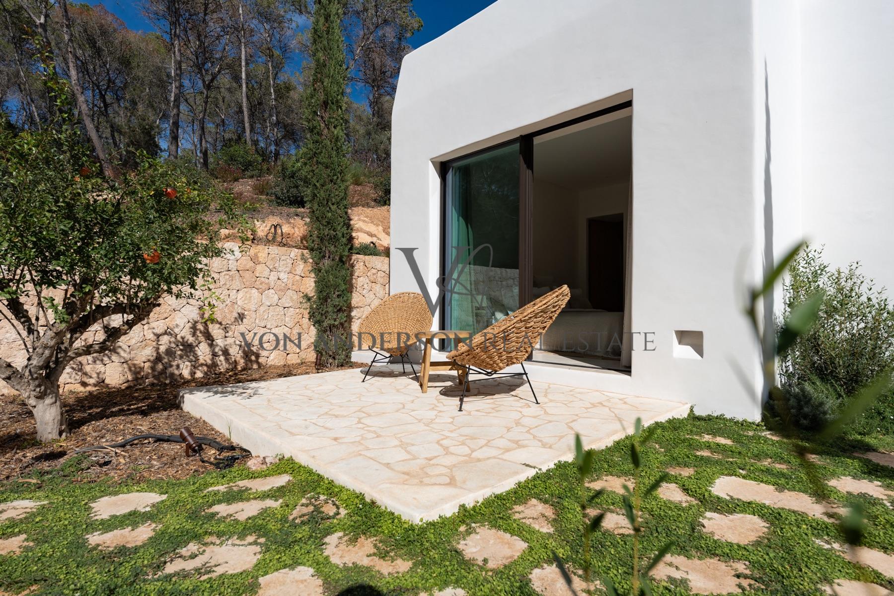 La villa comprend cinq chambres spacieuses, quatre salles de bains élégantes et un plan ouvert qui relie harmonieusement la cuisine sur mesure, le salon élégant et la salle à manger raffinée. Les portes coulissantes du sol au plafond inondent les intérieurs de lumière naturelle, encadrant les vues spectaculaires de la vallée tout en favorisant une atmosphère sereine et aérée. L'utilisation de matériaux naturels, tels que le bois et la pierre, apporte chaleur et authenticité, faisant écho au caractère des fincas historiques d'Ibiza.