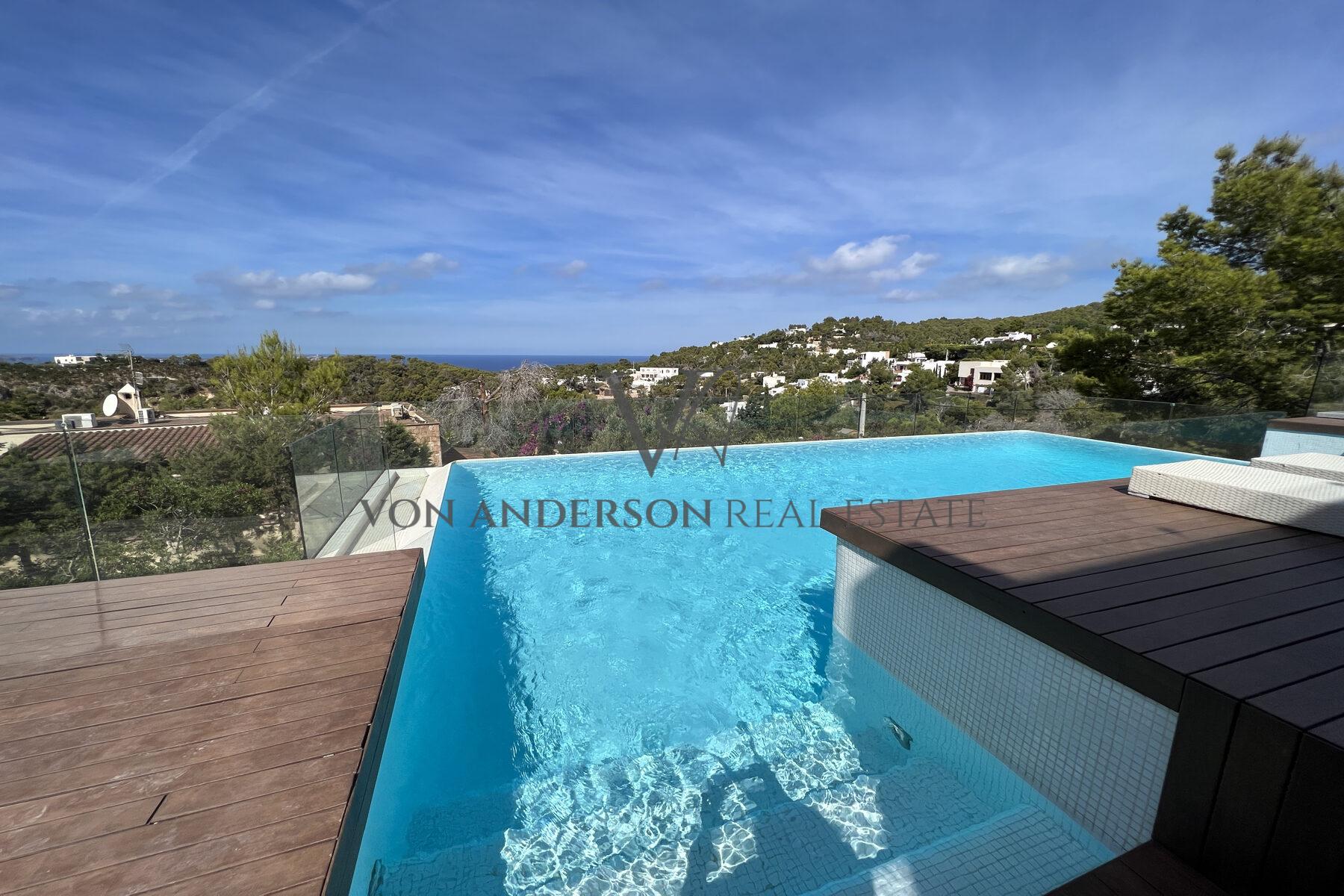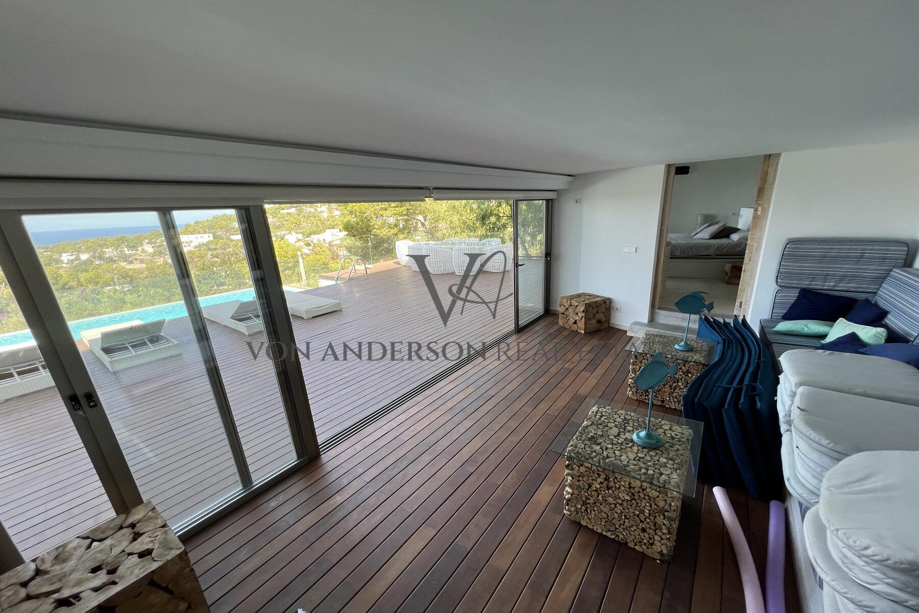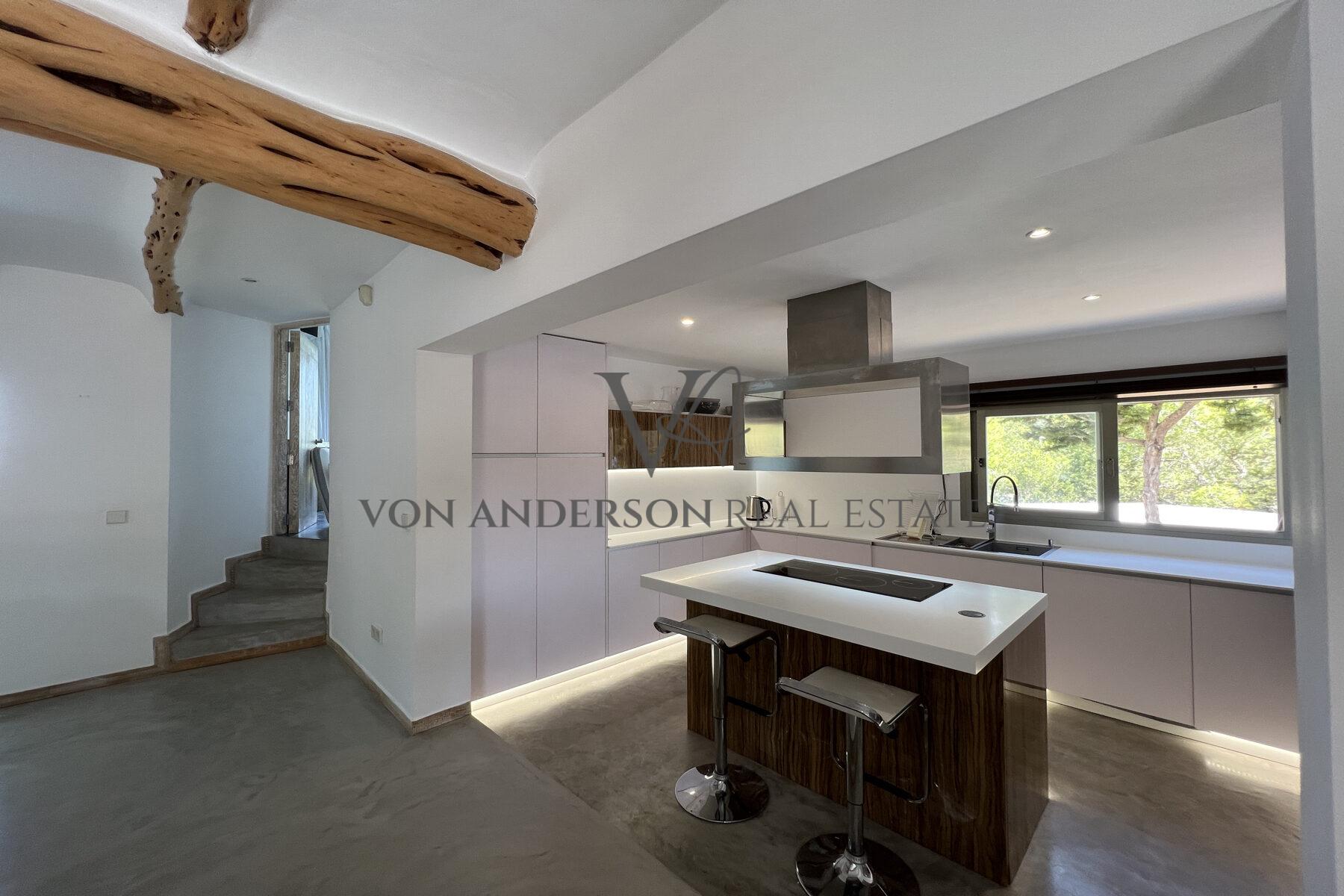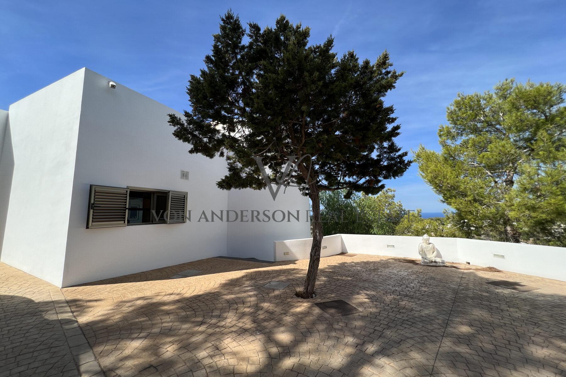 Cette villa contemporaine entièrement rénovée est située dans le sud-ouest de la région de San José, à 5 km de la pittoresque baie de sable de Cala Tarida, au cœur d'une campagne verdoyante. La propriété possède une licence de tourisme et bénéficie d'une vue imprenable sur la mer et le coucher de soleil.