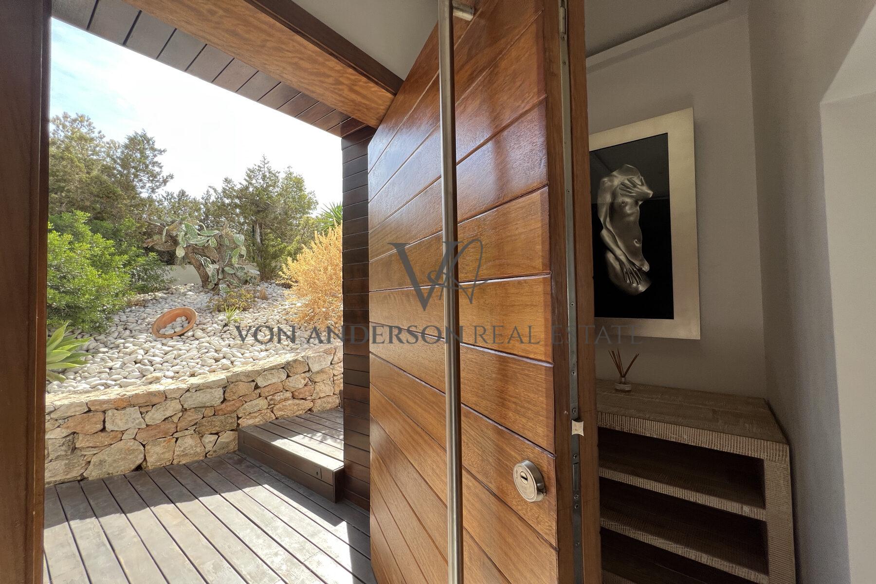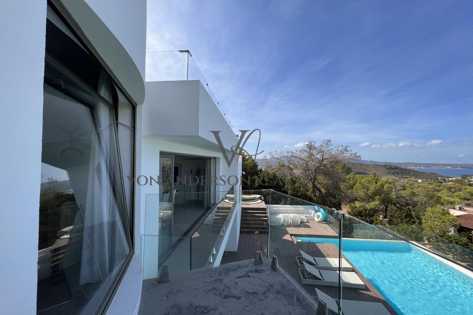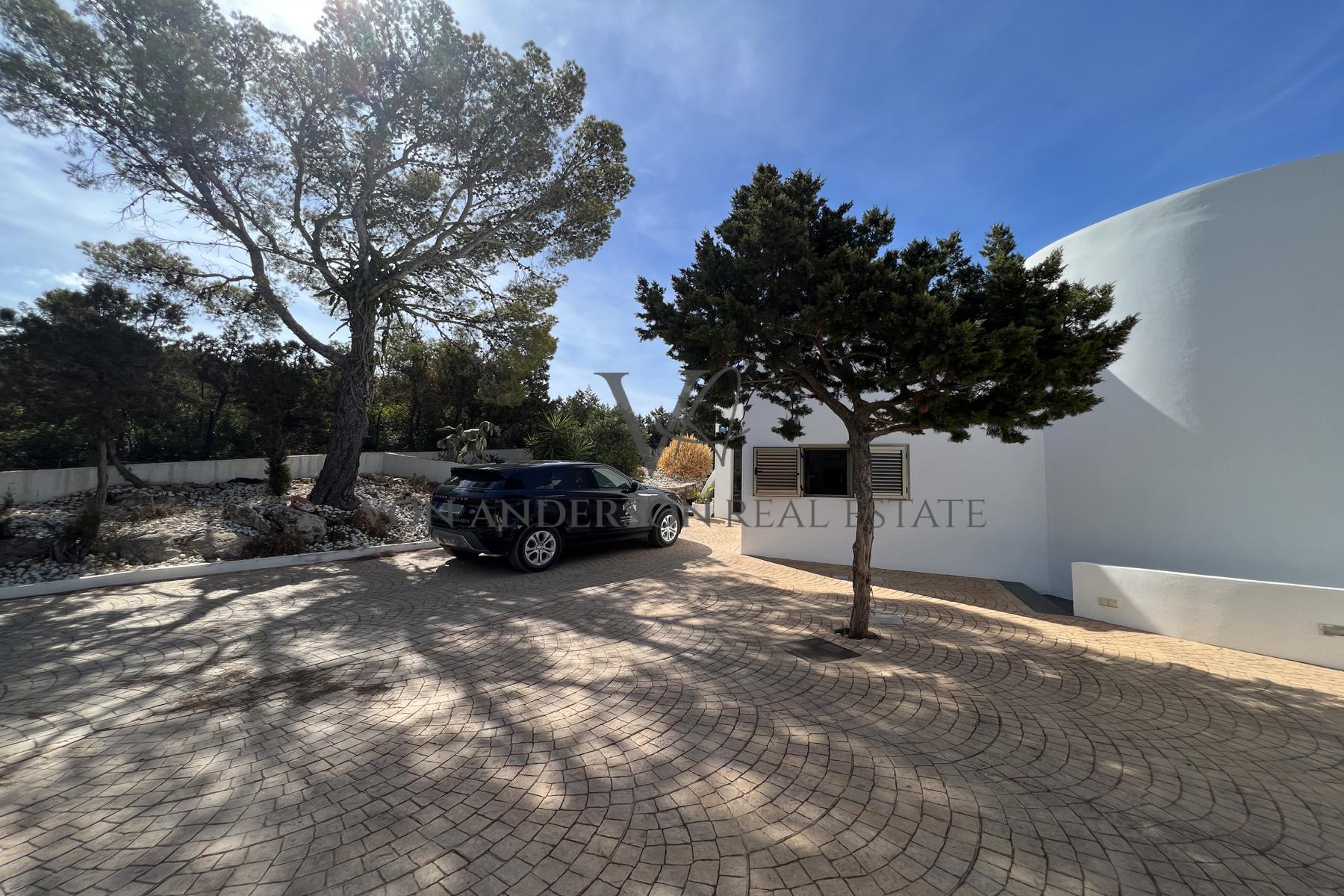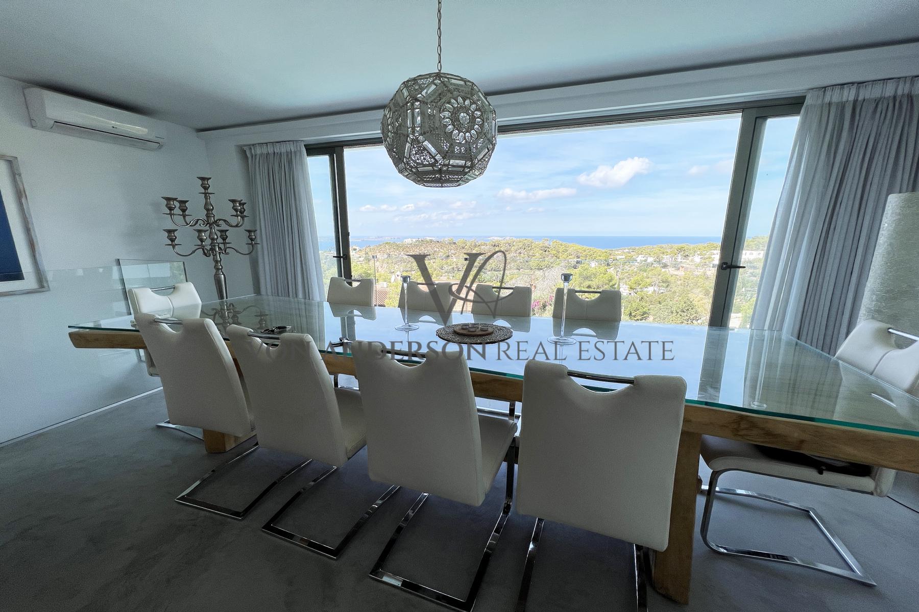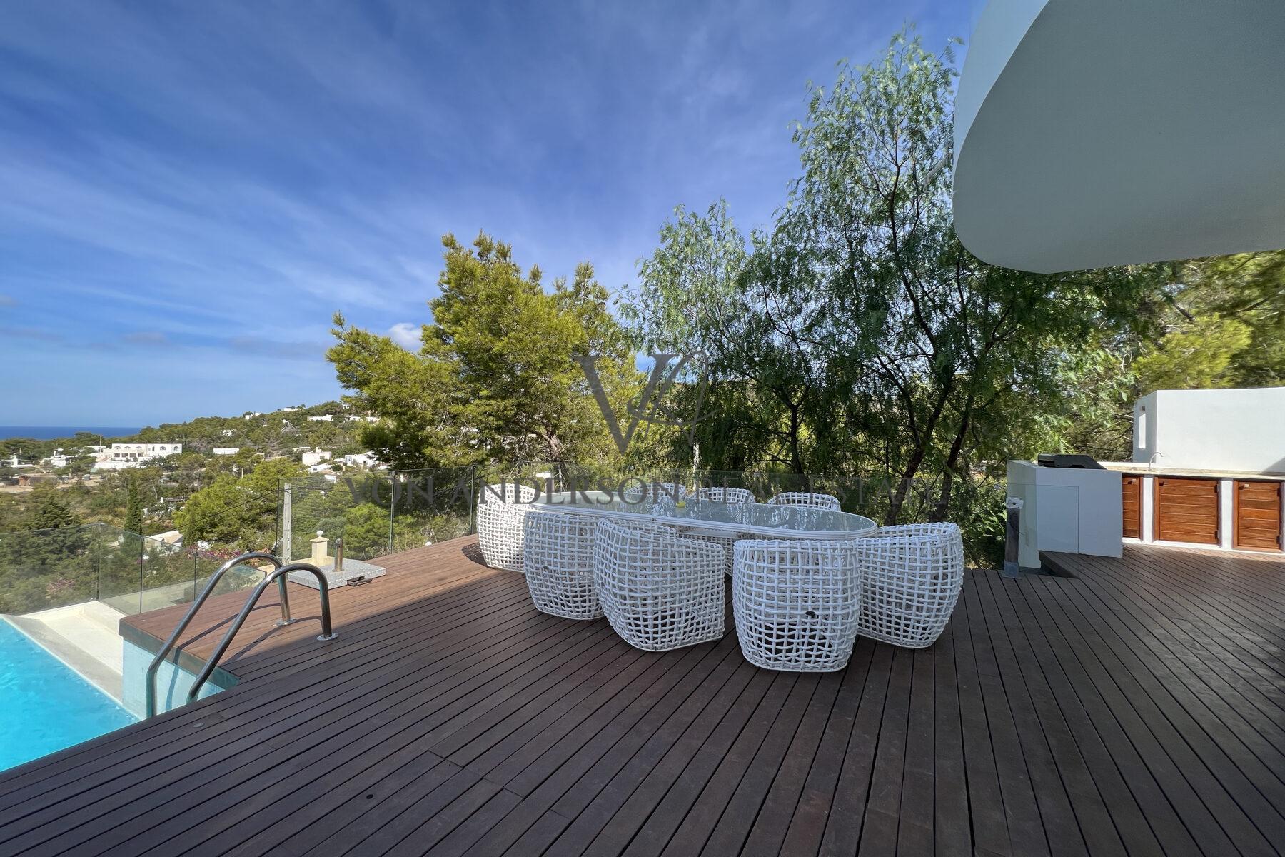 Cette villa contemporaine entièrement rénovée est située dans le sud-ouest de la région de San José, à 5 km de la pittoresque baie de sable de Cala Tarida, au cœur d'une campagne verdoyante. La propriété possède une licence de tourisme et bénéficie d'une vue imprenable sur la mer et le coucher de soleil.