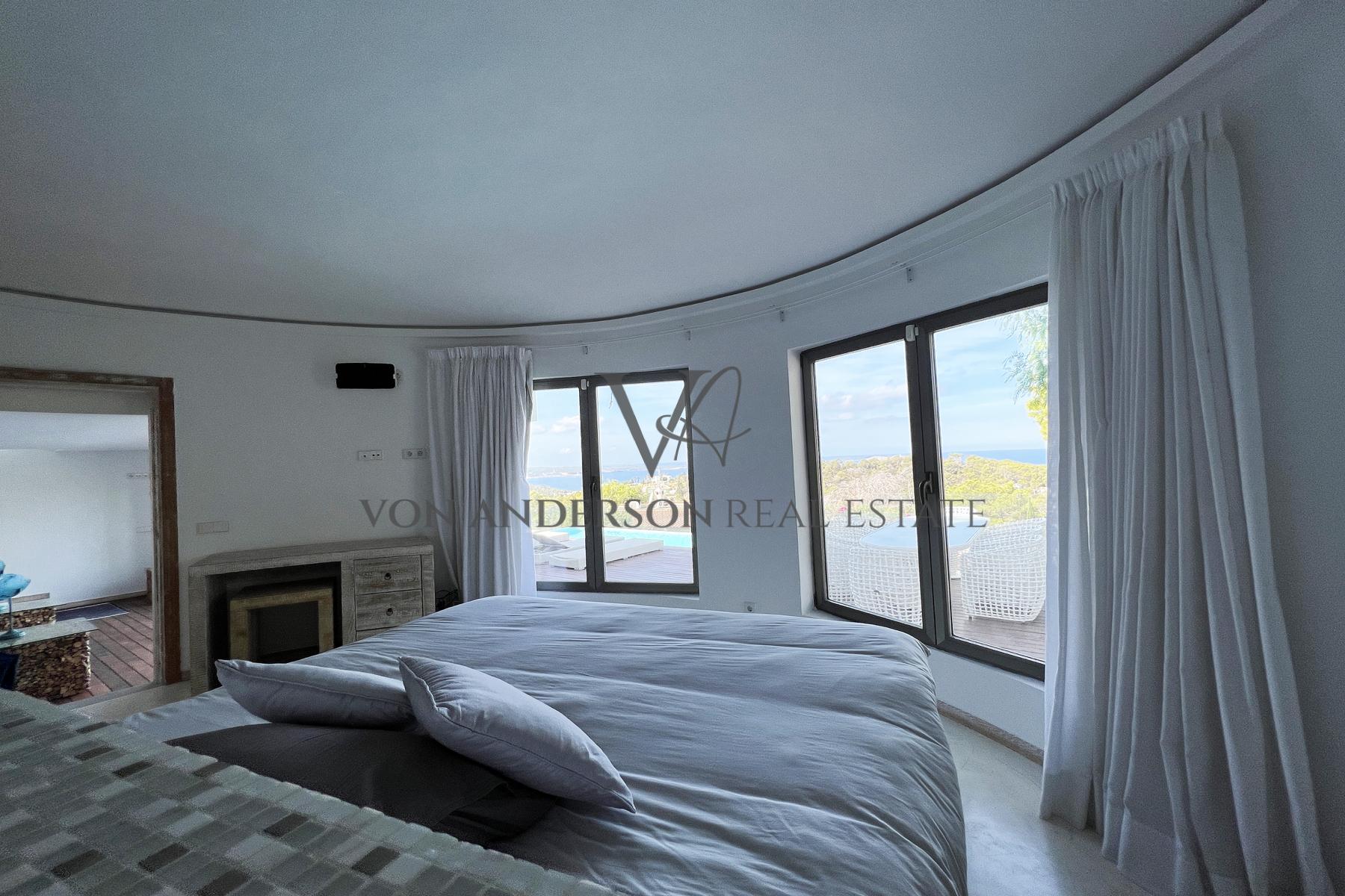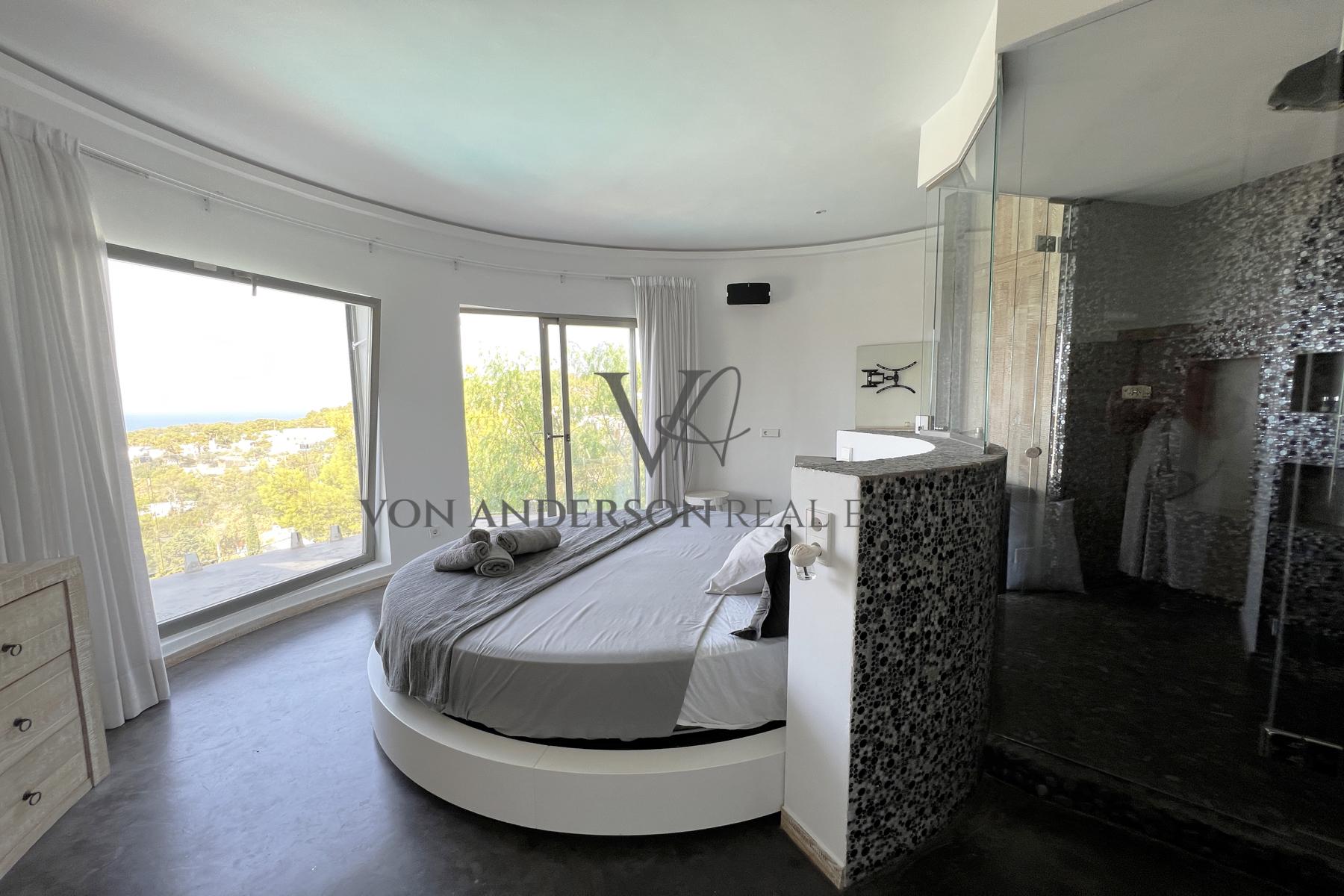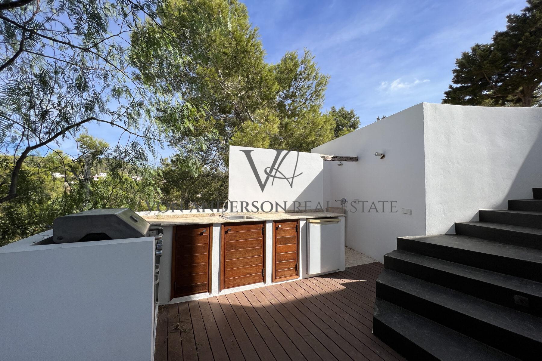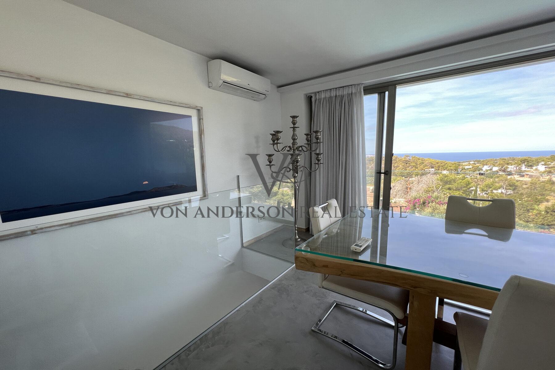 Cette villa contemporaine entièrement rénovée est située dans le sud-ouest de la région de San José, à 5 km de la pittoresque baie de sable de Cala Tarida, au cœur d'une campagne verdoyante. La propriété possède une licence de tourisme et bénéficie d'une vue imprenable sur la mer et le coucher de soleil.