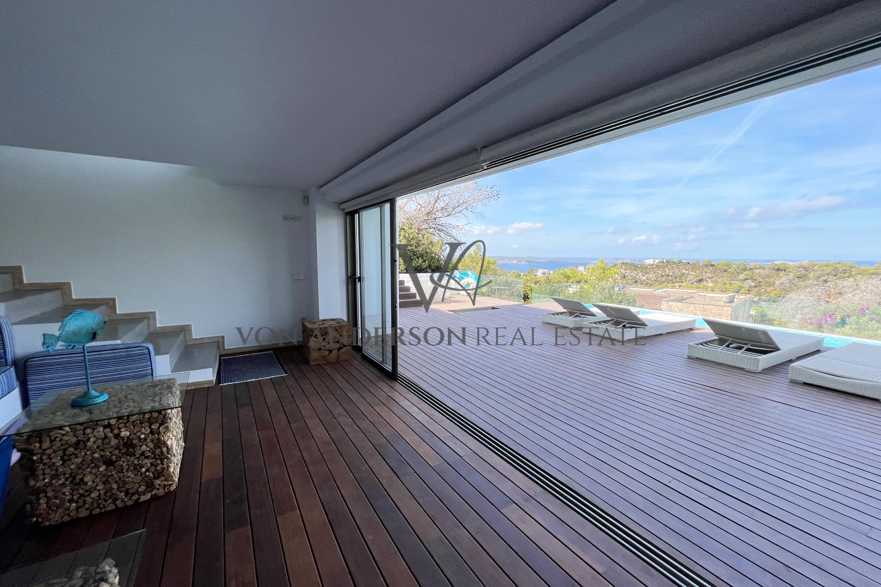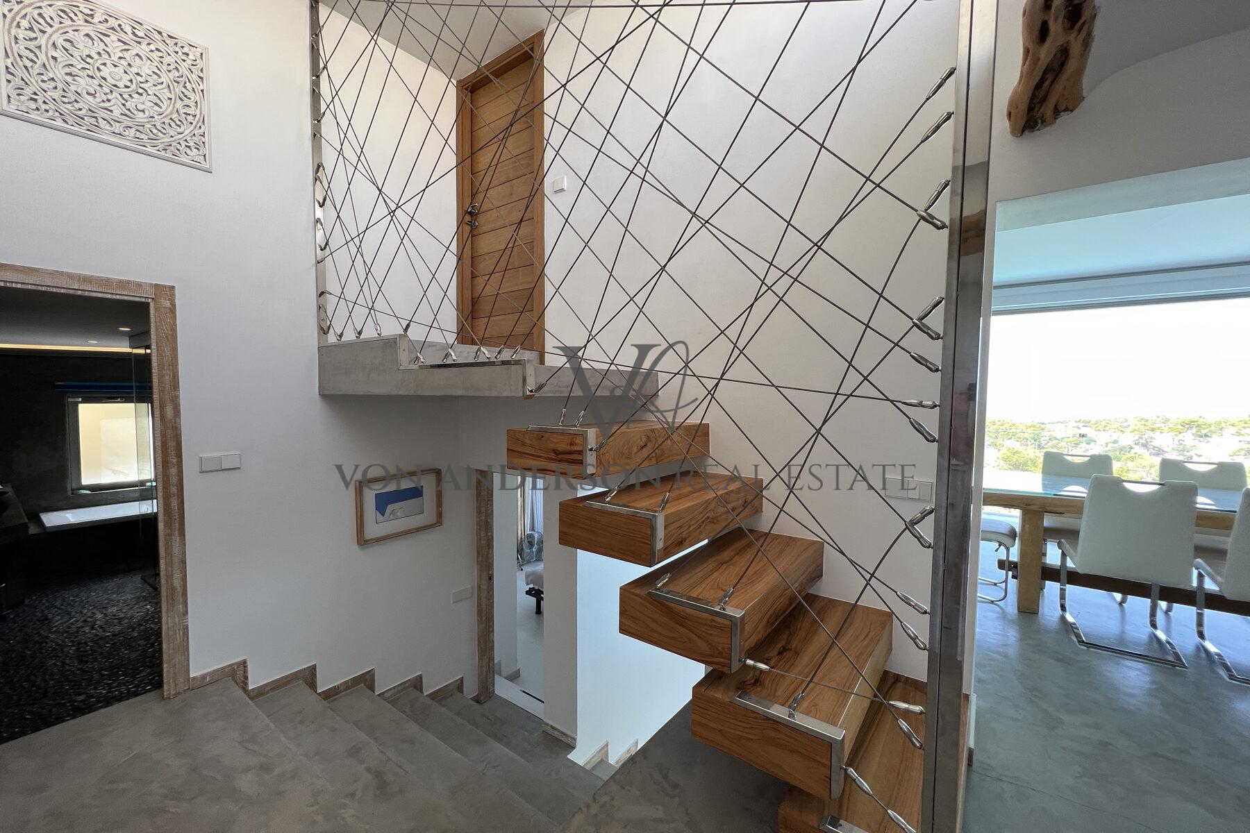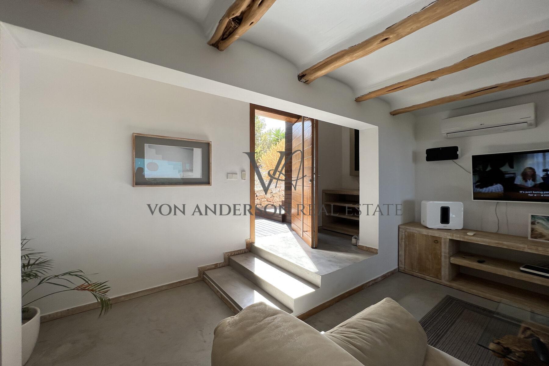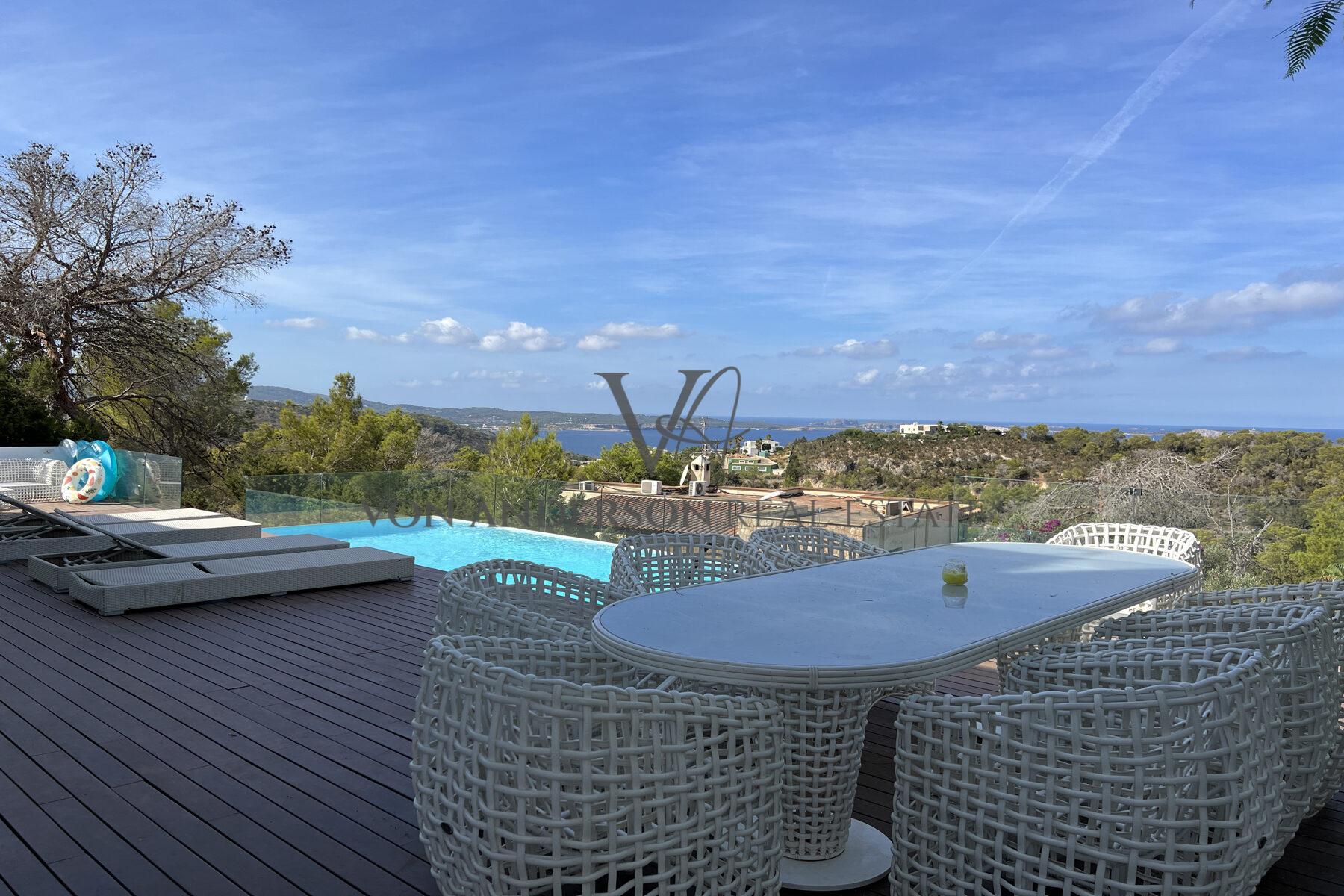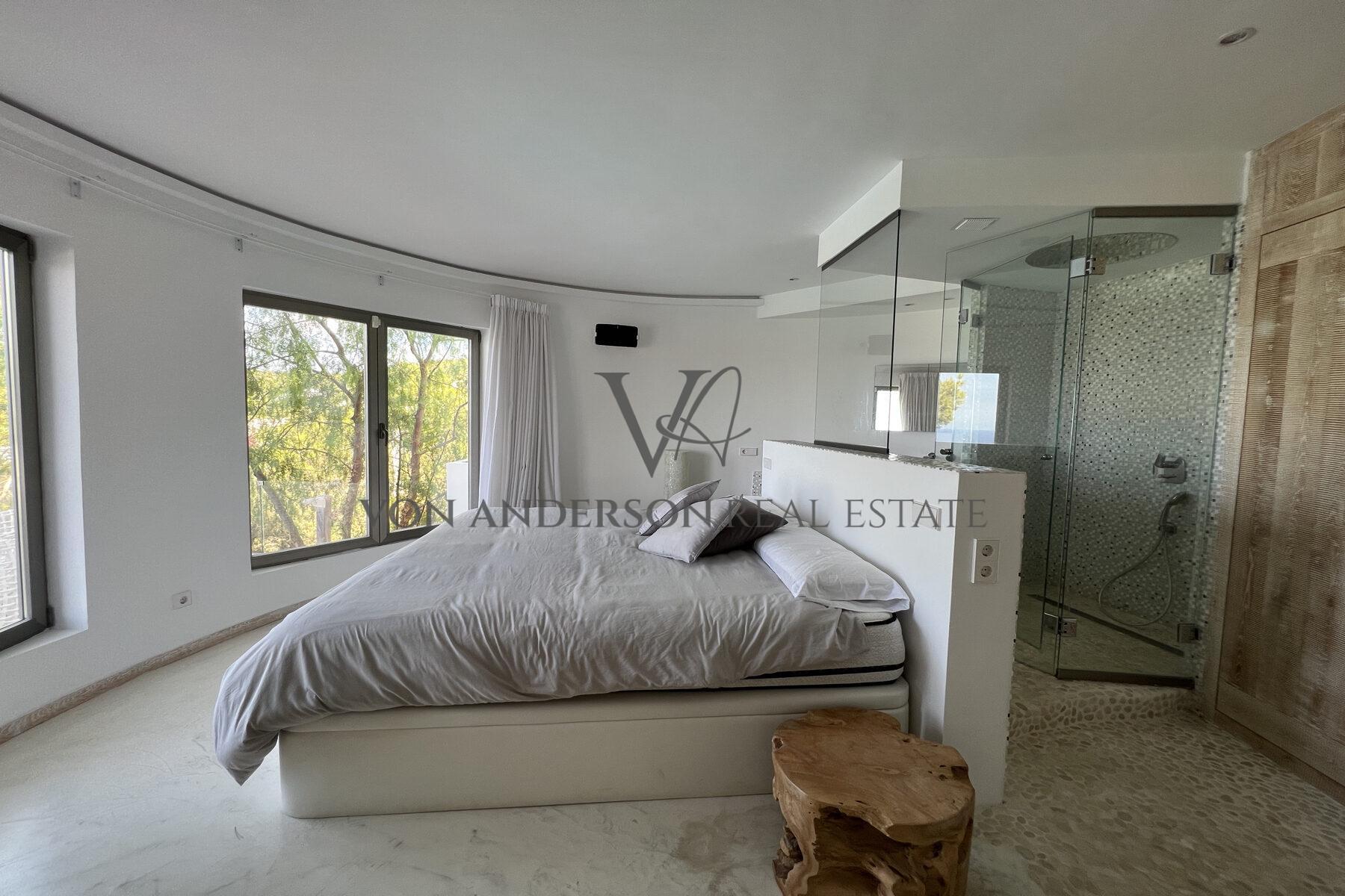 Cette villa contemporaine entièrement rénovée est située dans le sud-ouest de la région de San José, à 5 km de la pittoresque baie de sable de Cala Tarida, au cœur d'une campagne verdoyante. La propriété possède une licence de tourisme et bénéficie d'une vue imprenable sur la mer et le coucher de soleil.
