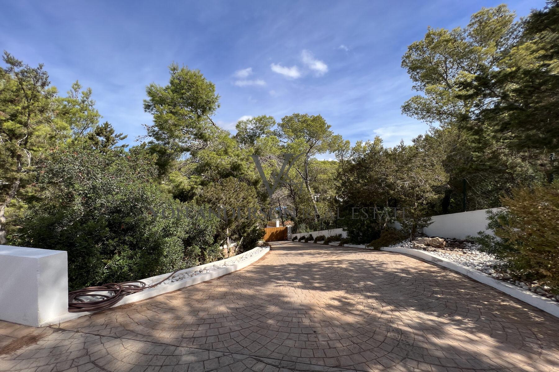Orientée vers l'ouest, la villa dispose d'un grand parking et est entourée de charmants murs en pierre locale. La propriété est couronnée par un toit-terrasse spacieux qui offre une vue panoramique à 360 degrés sur la région pittoresque de Cala Salada, la mer, le littoral et les forêts de pins.