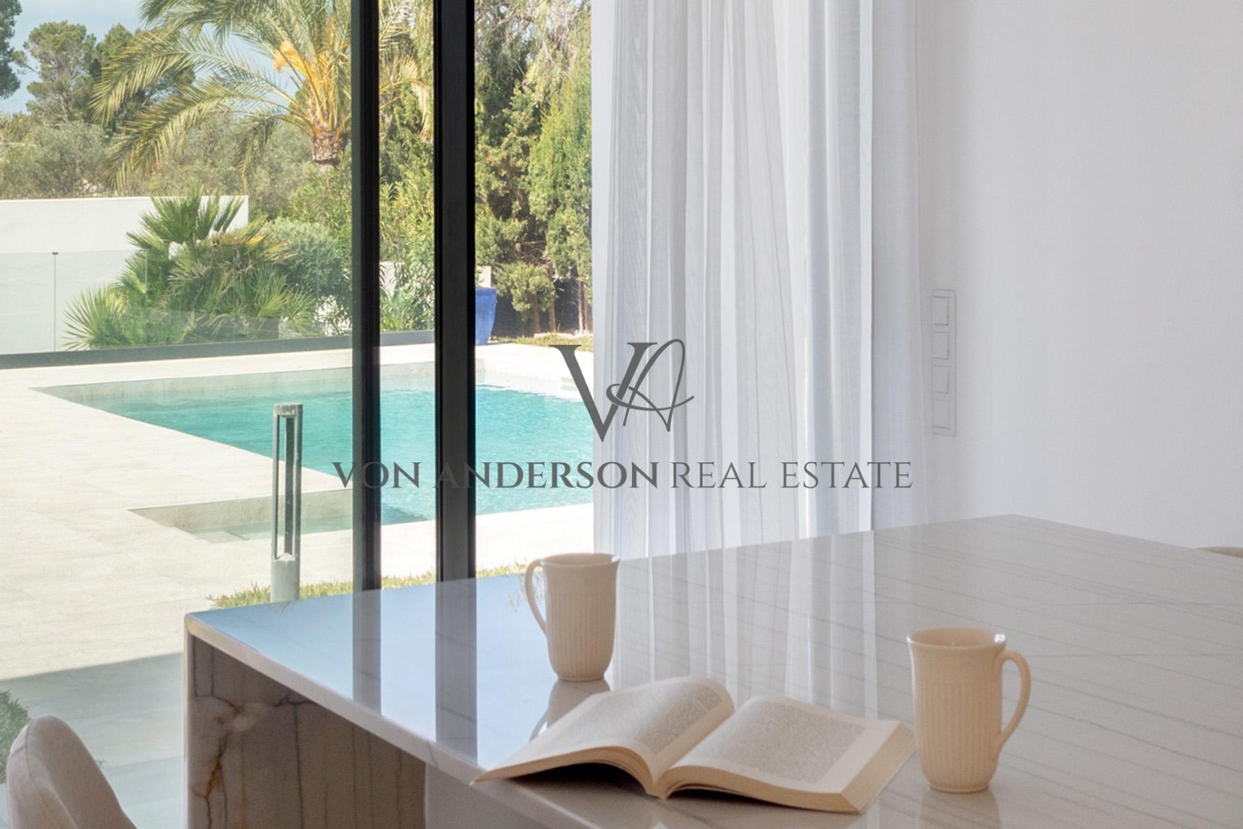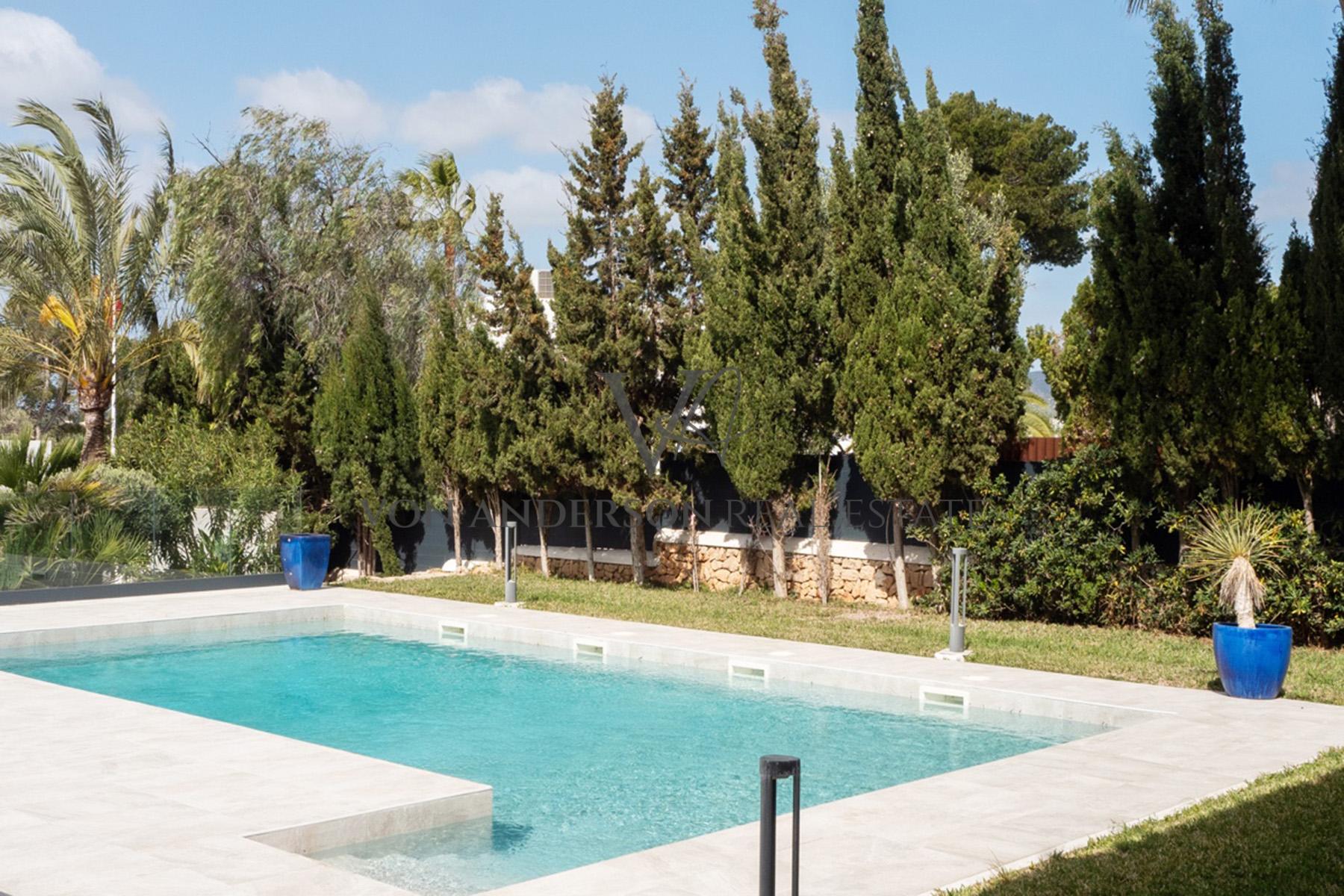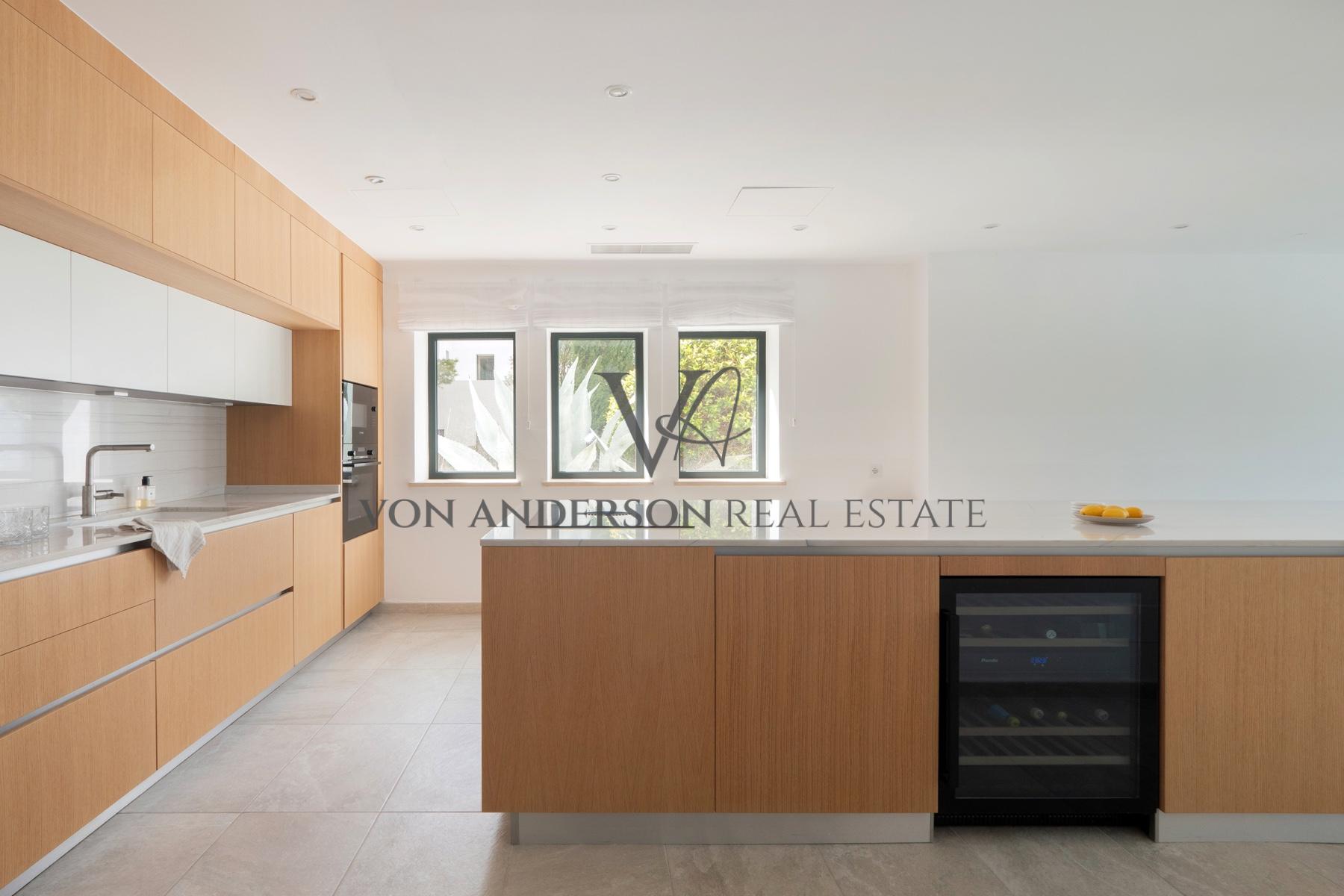 De leefruimtes strekken zich op natuurlijke wijze uit via openslaande deuren naar meerdere uitgestrekte terrassen, ideaal om buiten te dineren en bij zonsondergang te entertainen. Buiten flankeren aangelegde tuinen met elegante palmen en gemanicuurde gazons een uitnodigend zwembad met zonovergoten solariumterras dat een oase van rust vormt, perfect geschikt voor ontspanning of om gasten in stijl te ontvangen.