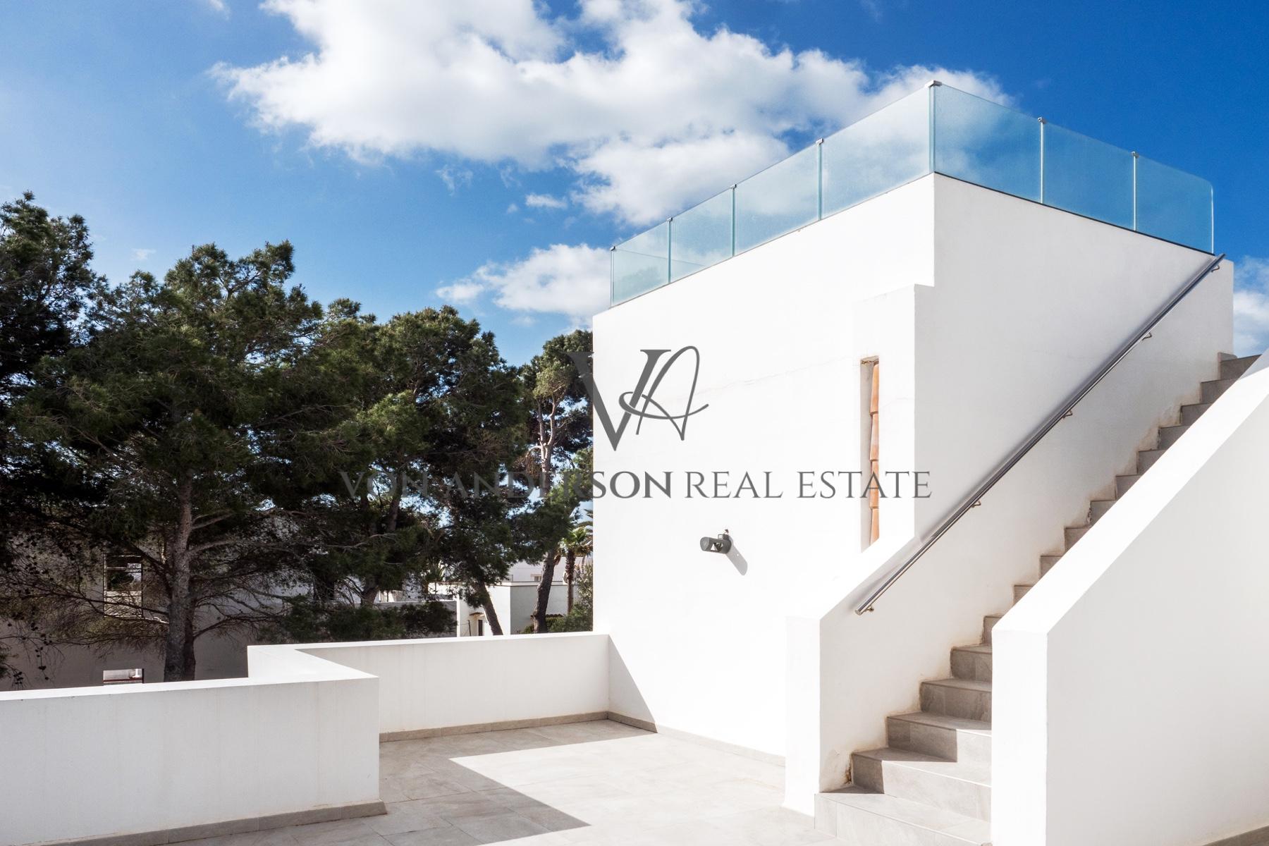 Een dakterras bekroont het huis en biedt een panoramisch uitzicht over het azuurblauwe water van de Middellandse Zee. Een idyllische omgeving om tot rust te komen onder de Balearenhemel. De woning beschikt ook over een ruime dubbele garage, die zowel gemak als functionaliteit biedt.
