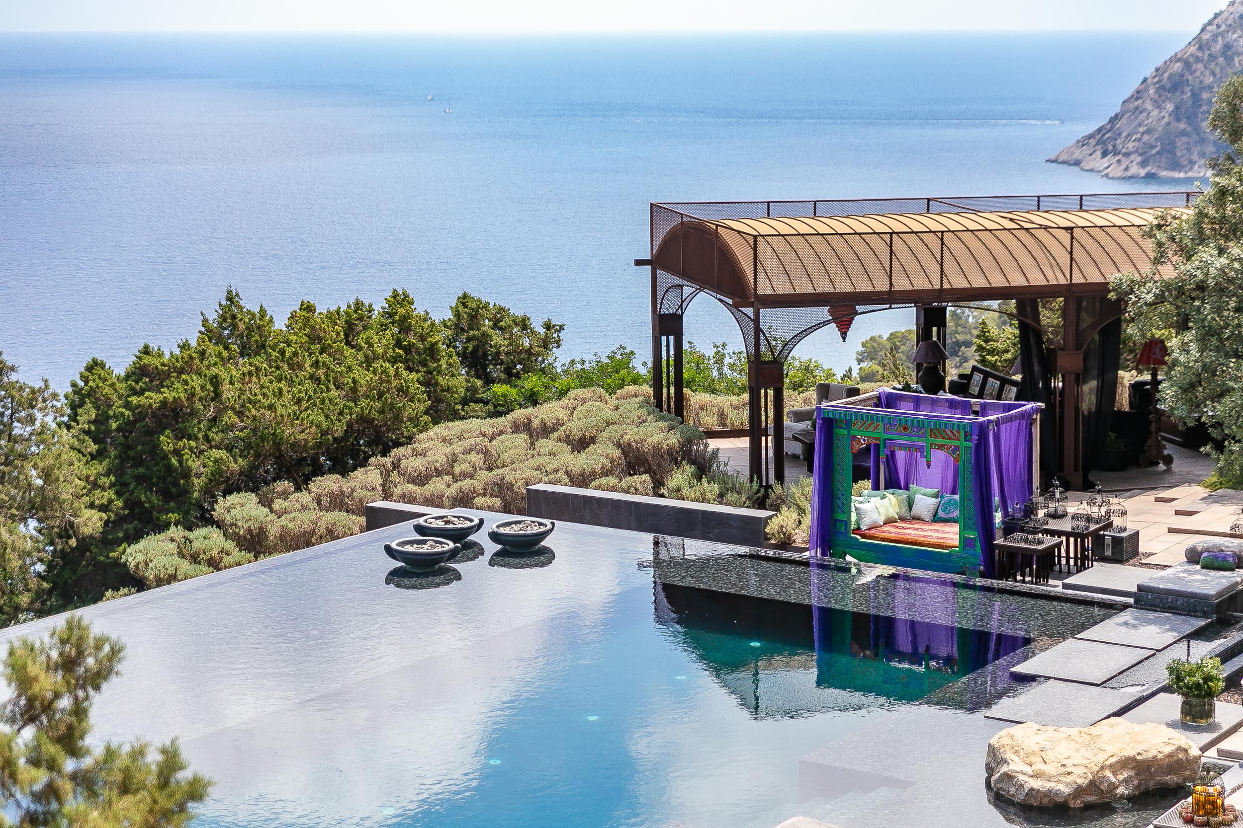 De villa ligt bovenop een verhoogde positie en biedt een panoramisch uitzicht op de azuurblauwe zee, het verre silhouet van Tagomago, de kust van Mallorca en het golvende landschap van Ibiza - een schouwspel dat de ziel echt in vervoering brengt.