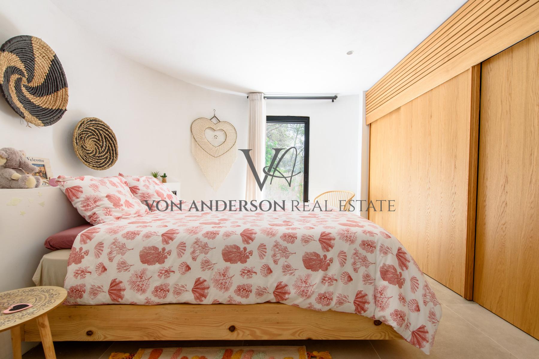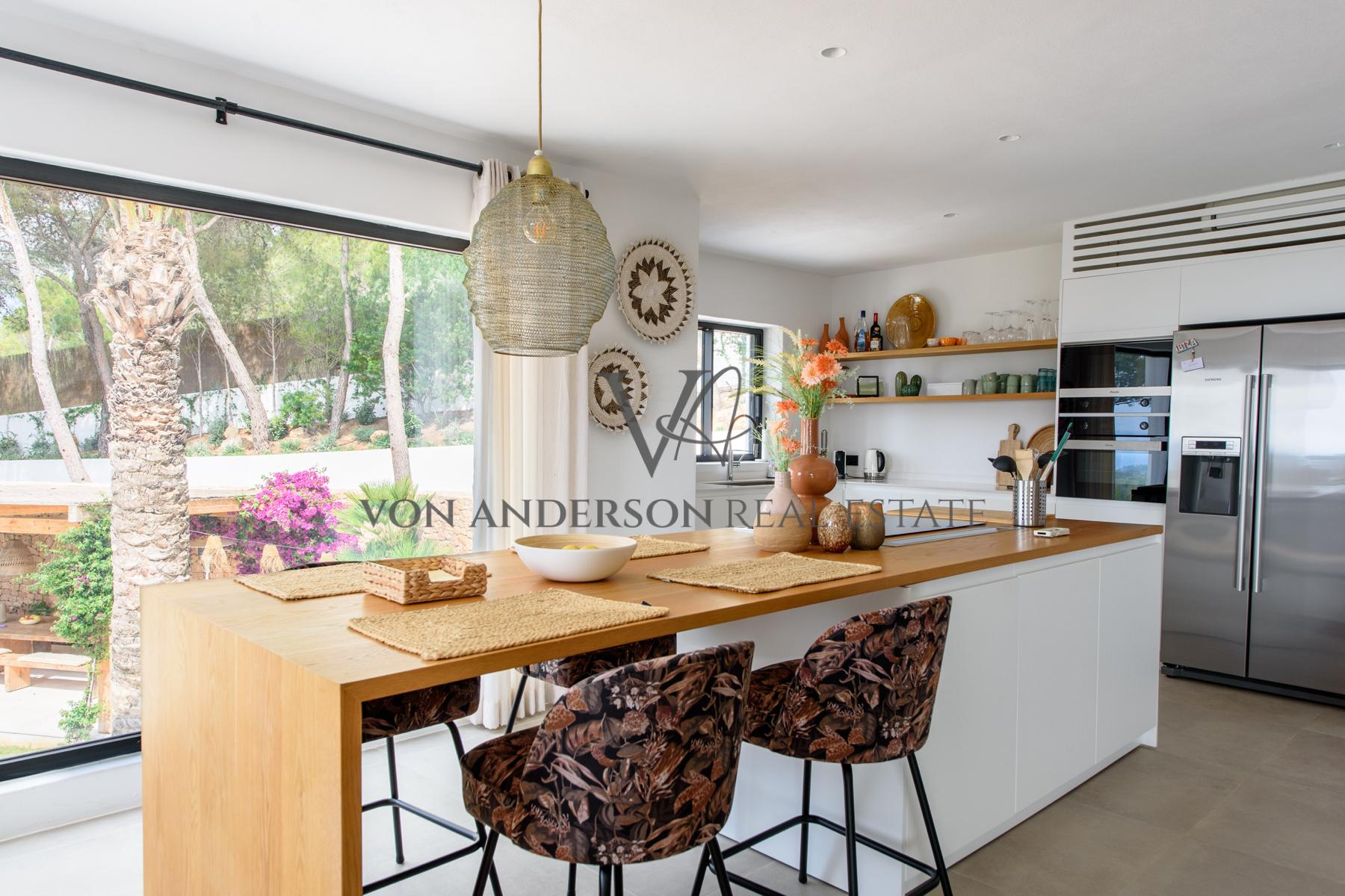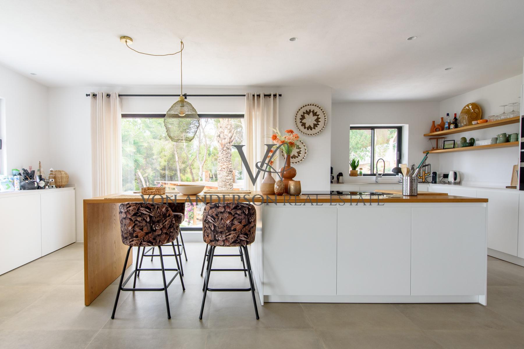 Outdoors, there’s a well-appointed kitchen, a bar, and a covered chill-out area with a dining table, making it perfect for entertaining family and friends while basking in the splendour of Ibiza’s legendary sunsets. The villa is fully air-conditioned and also offers a utility room, office, parking, and ample storage.