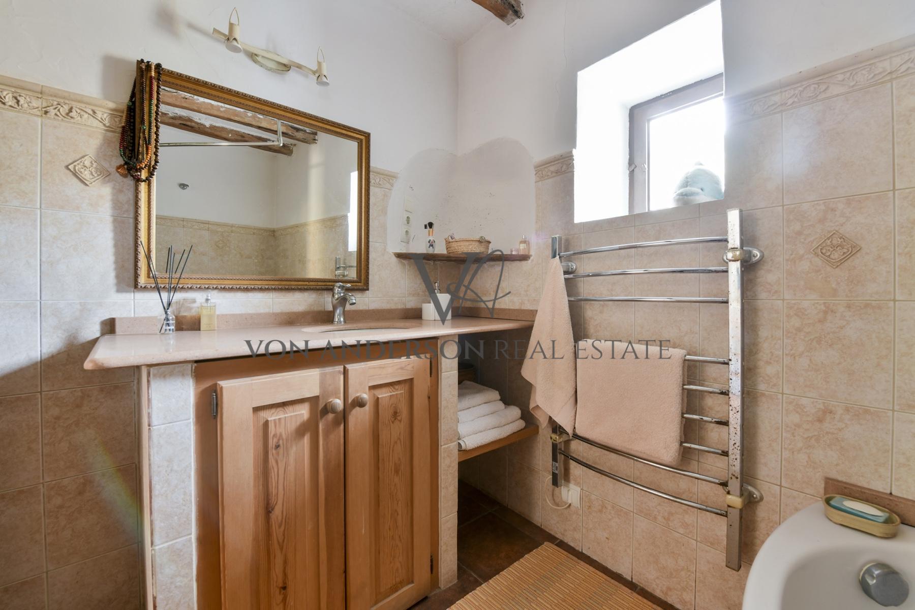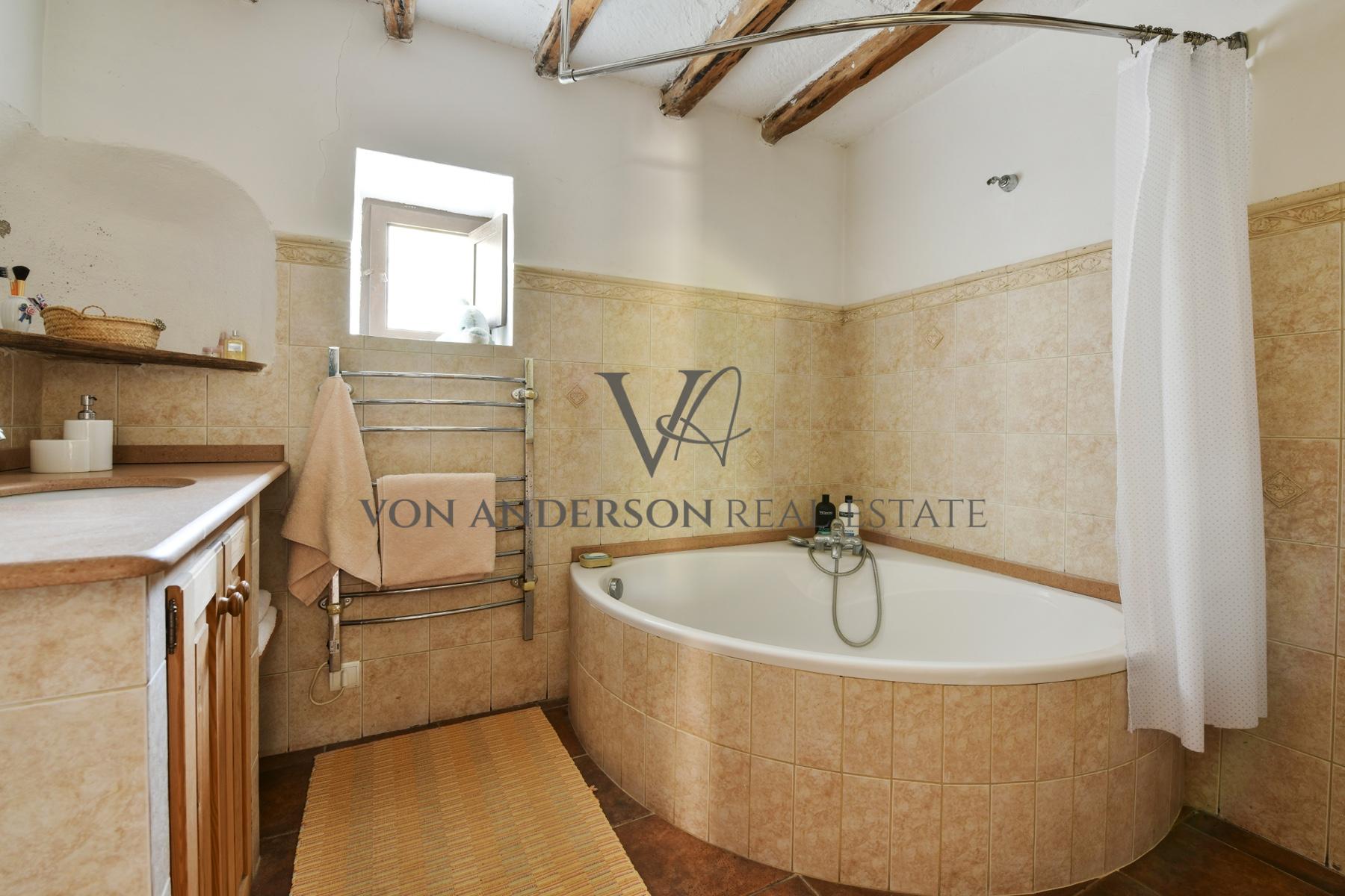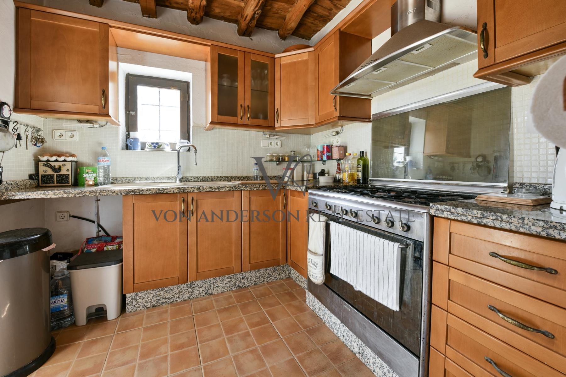 The studio accommodation includes an additional bedroom, bathroom, and an open-plan living space extending to a pleasant terrace with gardens hosting a majestic 300-year-old olive tree. The finca’s interior retains its authentic charm, appearing untouched by time yet lovingly maintained. Terracotta tiled floors, original wood-burning chimneys, and thick white walls topped by rich wooden beamed ceilings reflect its history. Modern additions like mains electricity, large windows and floor-to-ceiling patio doors offer contemporary comfort and luminosity perfect for modern island living.