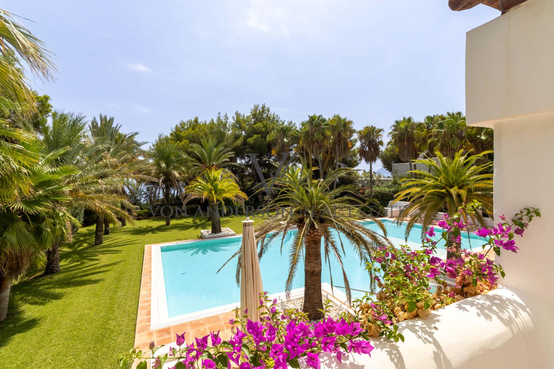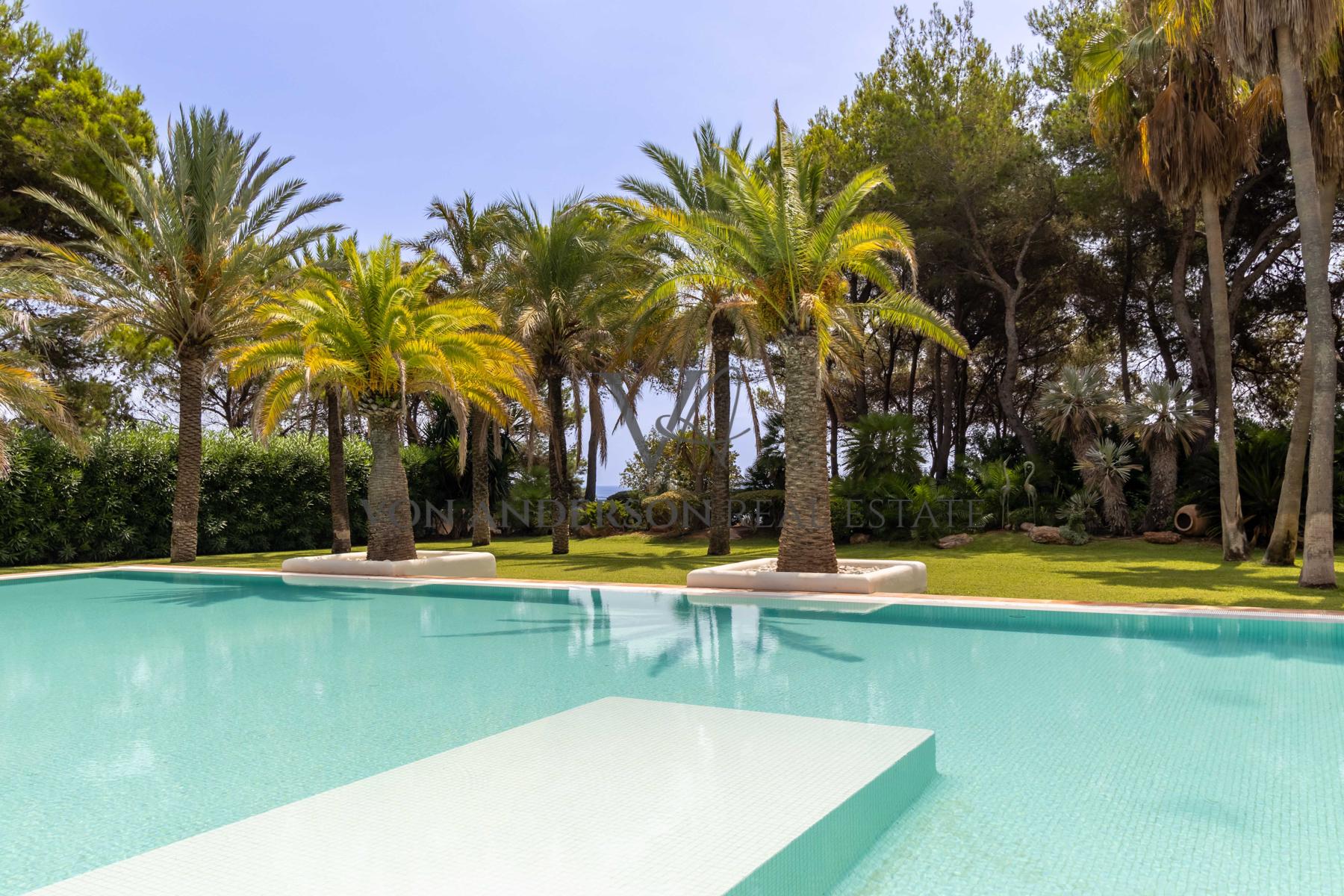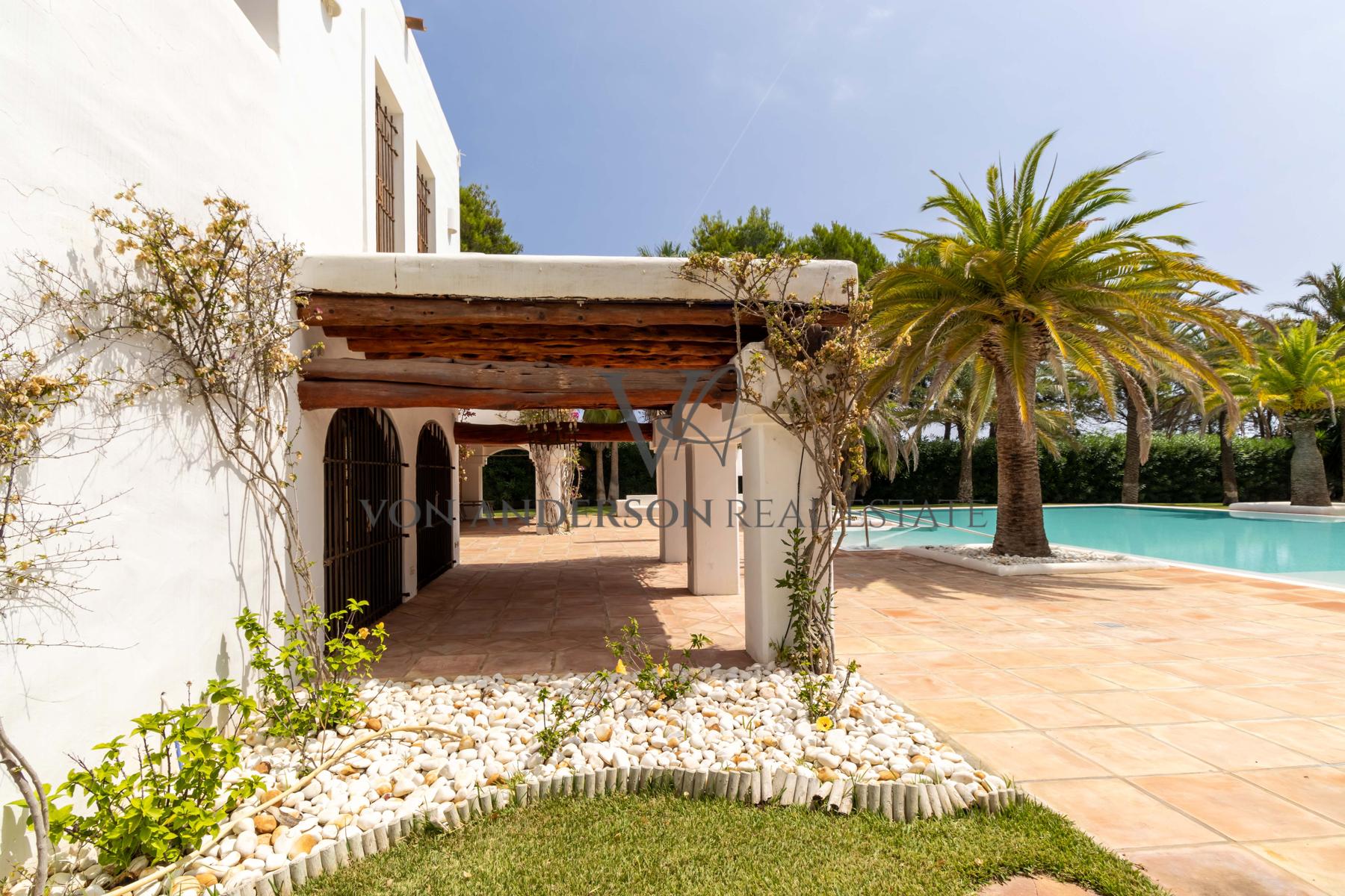 A remarkable villa, boasting a substantial swimming pool and elevated partial sea views over Niu Blau bay, is situated near the charming beach resorts of S’Argamassa, Cala Pada, Cala Martina, and Es Cana on Ibiza’s picturesque East Coast. This splendidly renovated Blakstad property spans an expansive 540m² of living space and occupies a spacious garden plot exceeding 5,630m², in close proximity to some of the island’s most esteemed beaches and exclusive destinations.