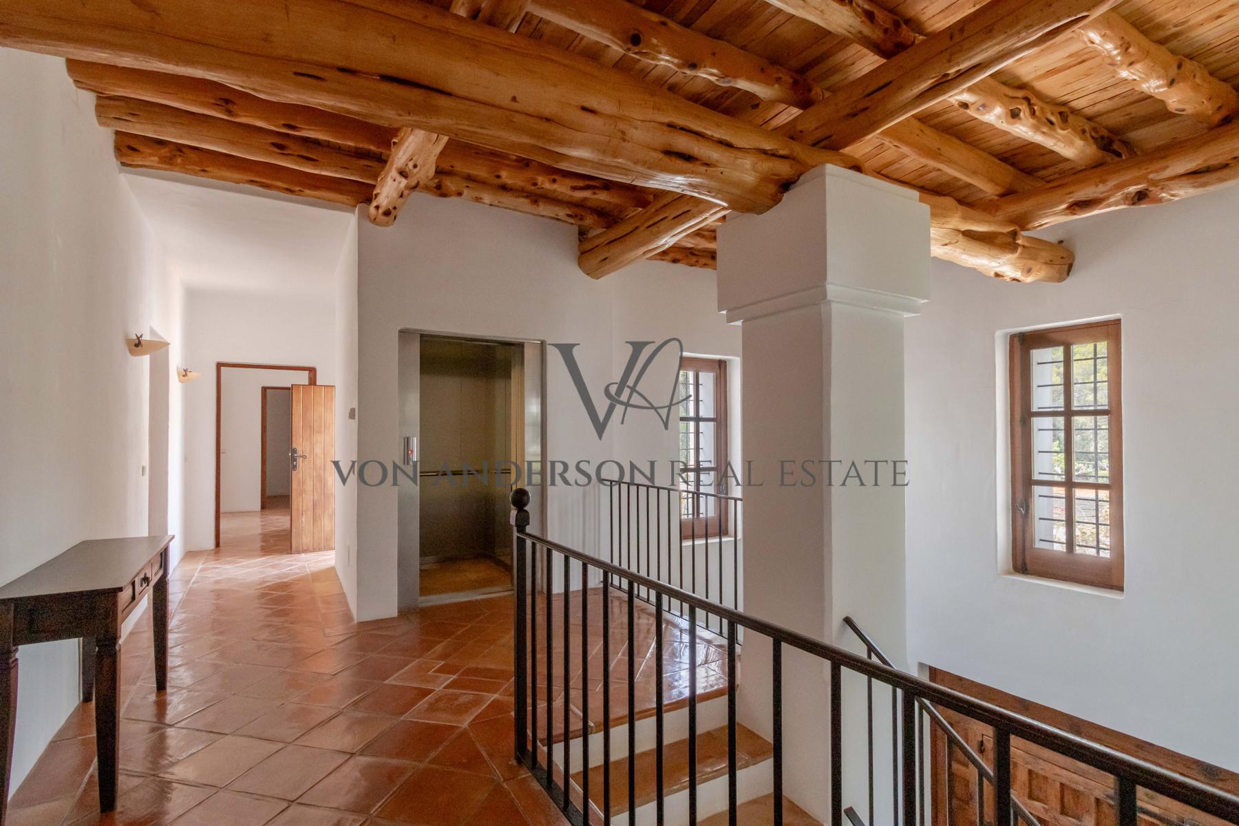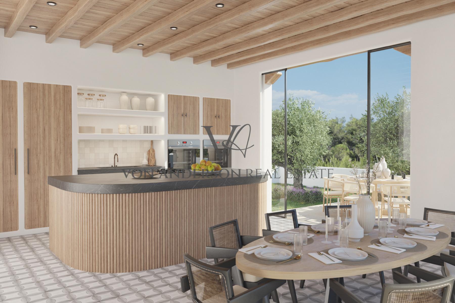 With a cozy wood-burning fireplace, subtle spotlighting, and patio doors leading to a large, covered dining porch amidst beautifully landscaped grounds, the lounge exudes a welcoming atmosphere. The interior maintains the property’s authenticity while embracing a contemporary minimalist elegance. Traditional elements such as elegant wall arches and Sabina wood-beamed ceilings harmonise with pure-white walls and natural materials, imparting a bright and timeless quality to the villa.