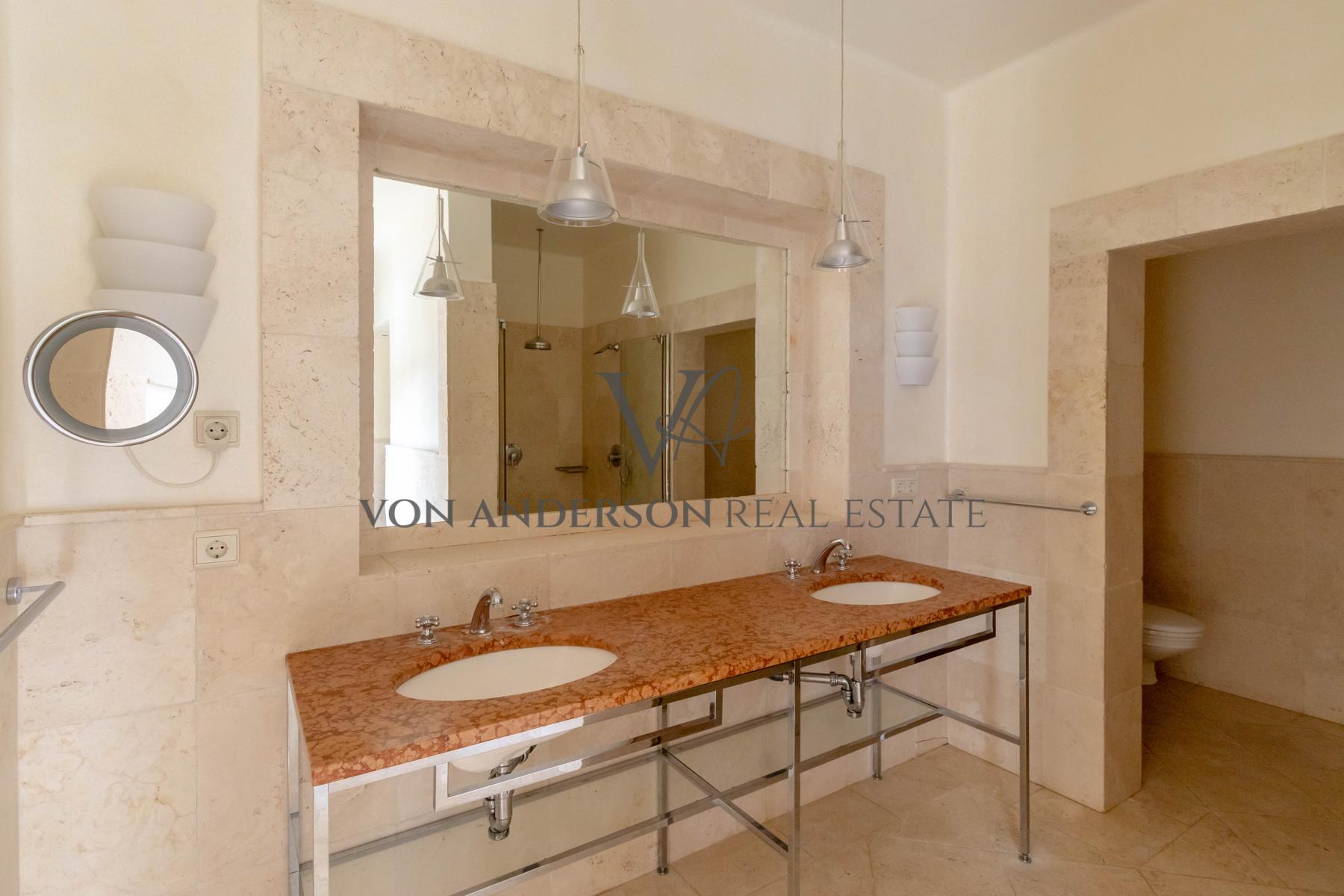 Adorned in decorative local stone, the main entrance of this fully gated luxury home opens through gleaming glass doors into a hallway with an elevator to the upper level and roof terrace. The extensive grounds, accessed via a wide, sweeping driveway that also provides parking, offer direct access to the sea and create a secluded haven of tranquility.