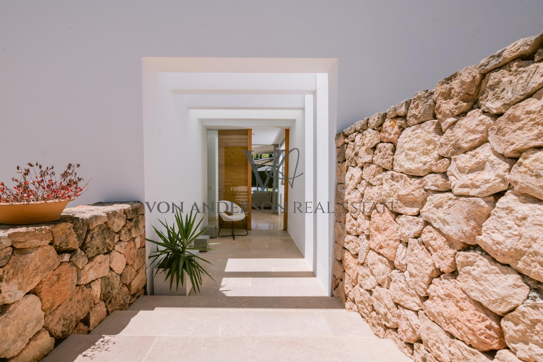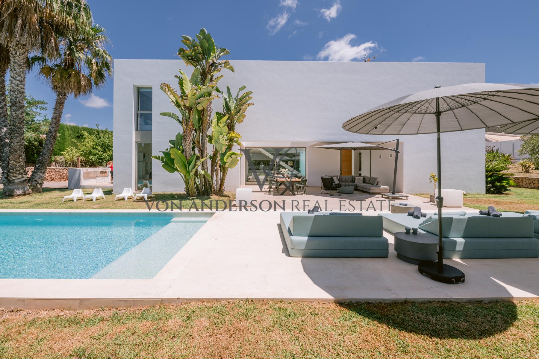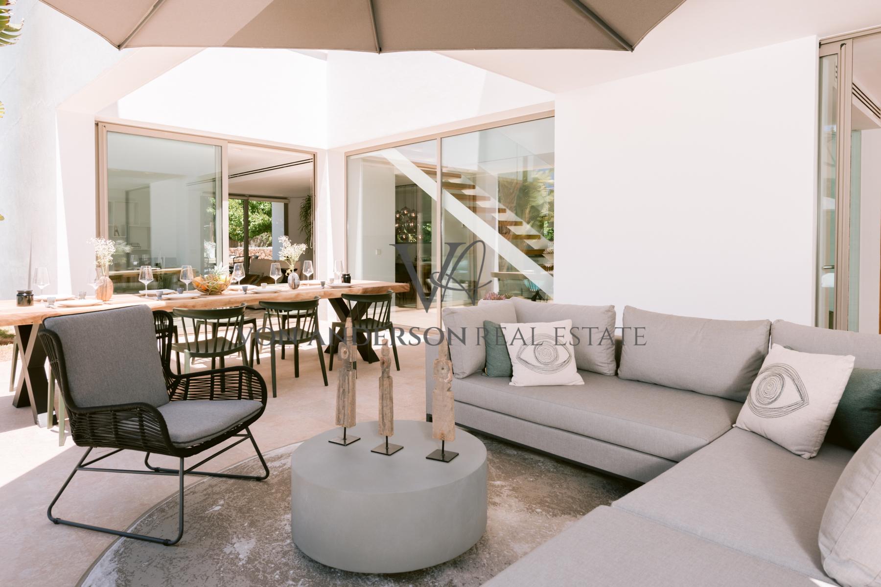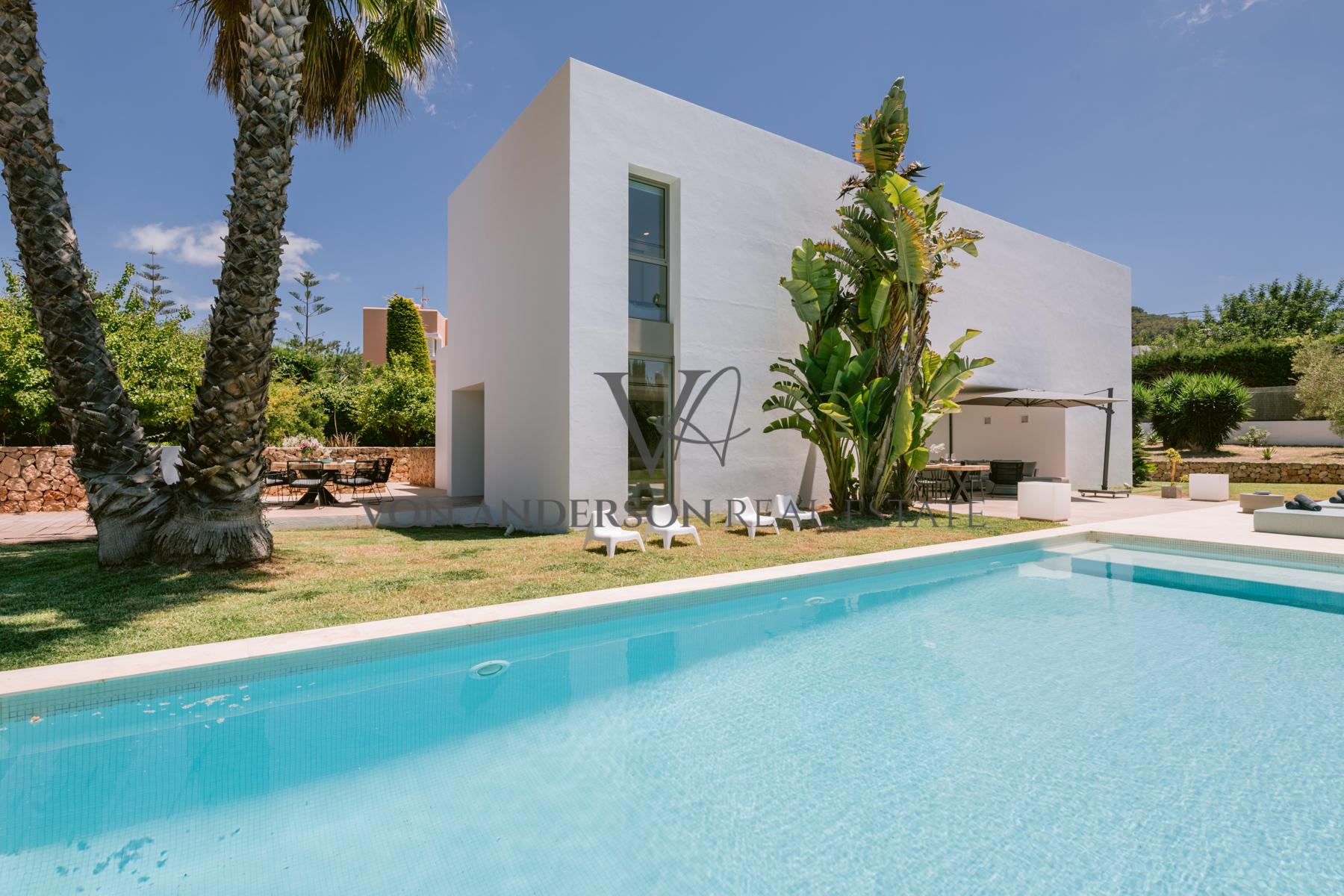 A breathtaking contemporary villa nestled within a large 2000m2 garden plot in the quaint village of Jesus, just a short drive from Ibiza town, the stunning Talamanca bay and the prestigious Botafoch yachting marina.