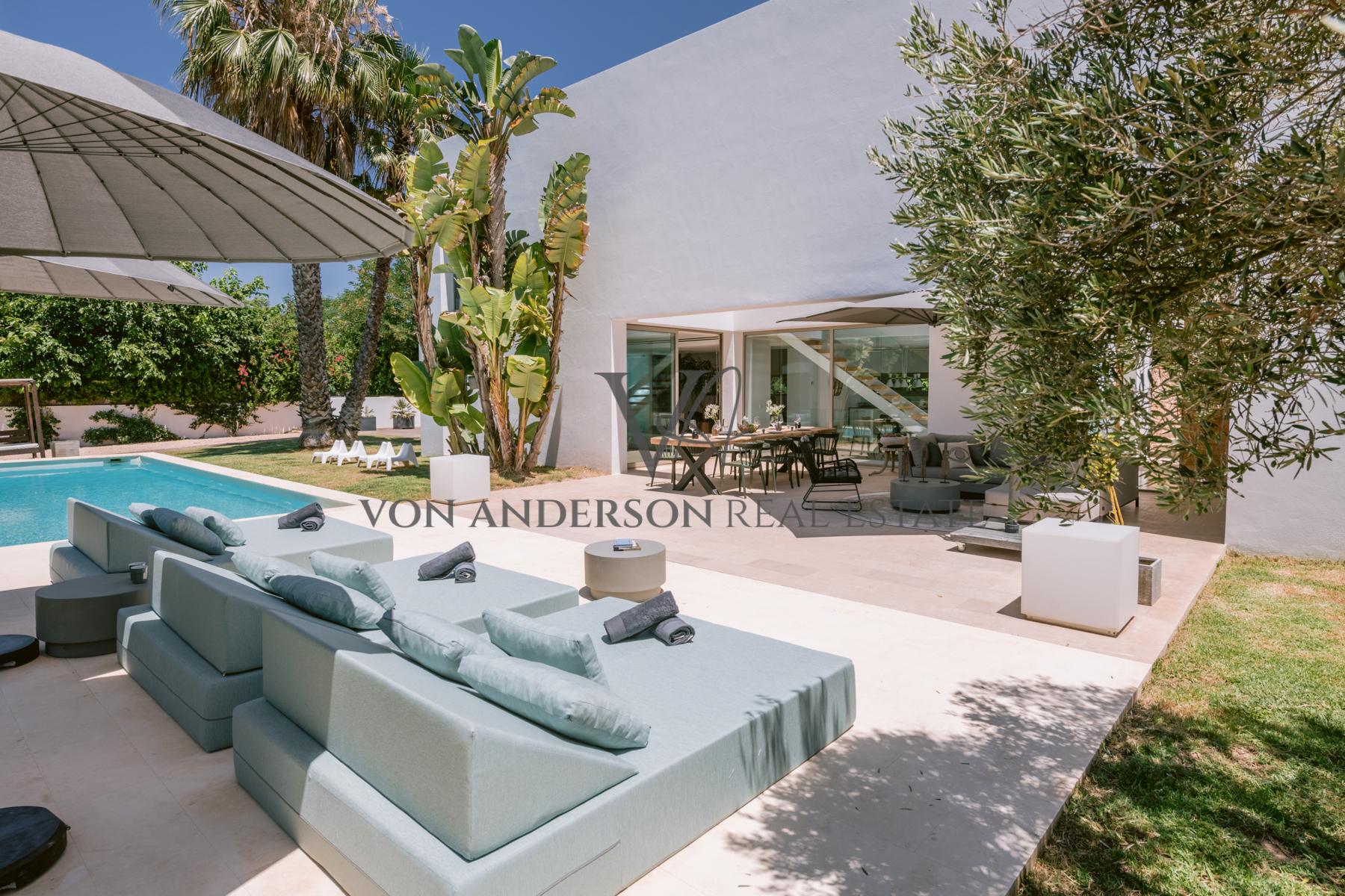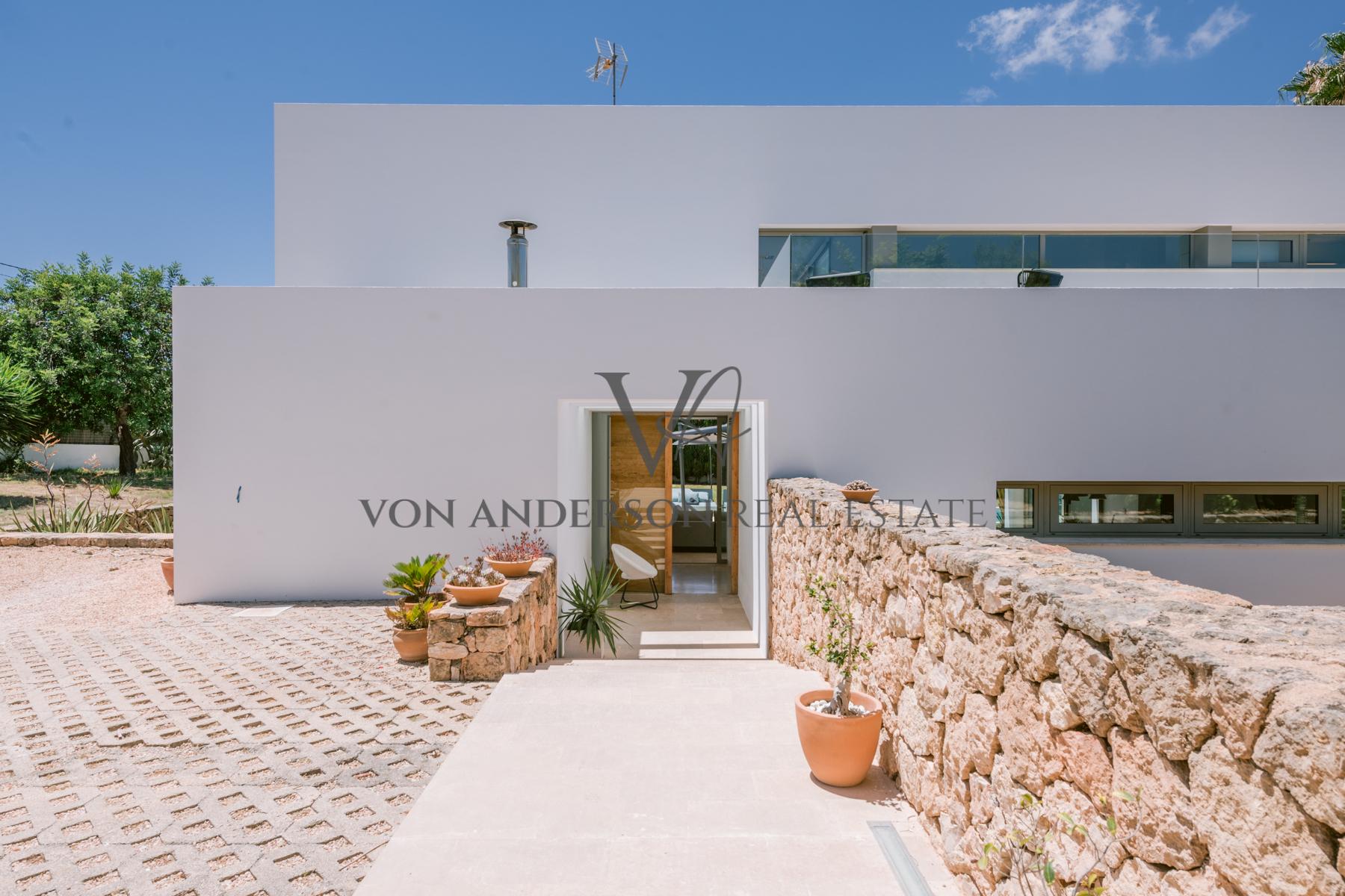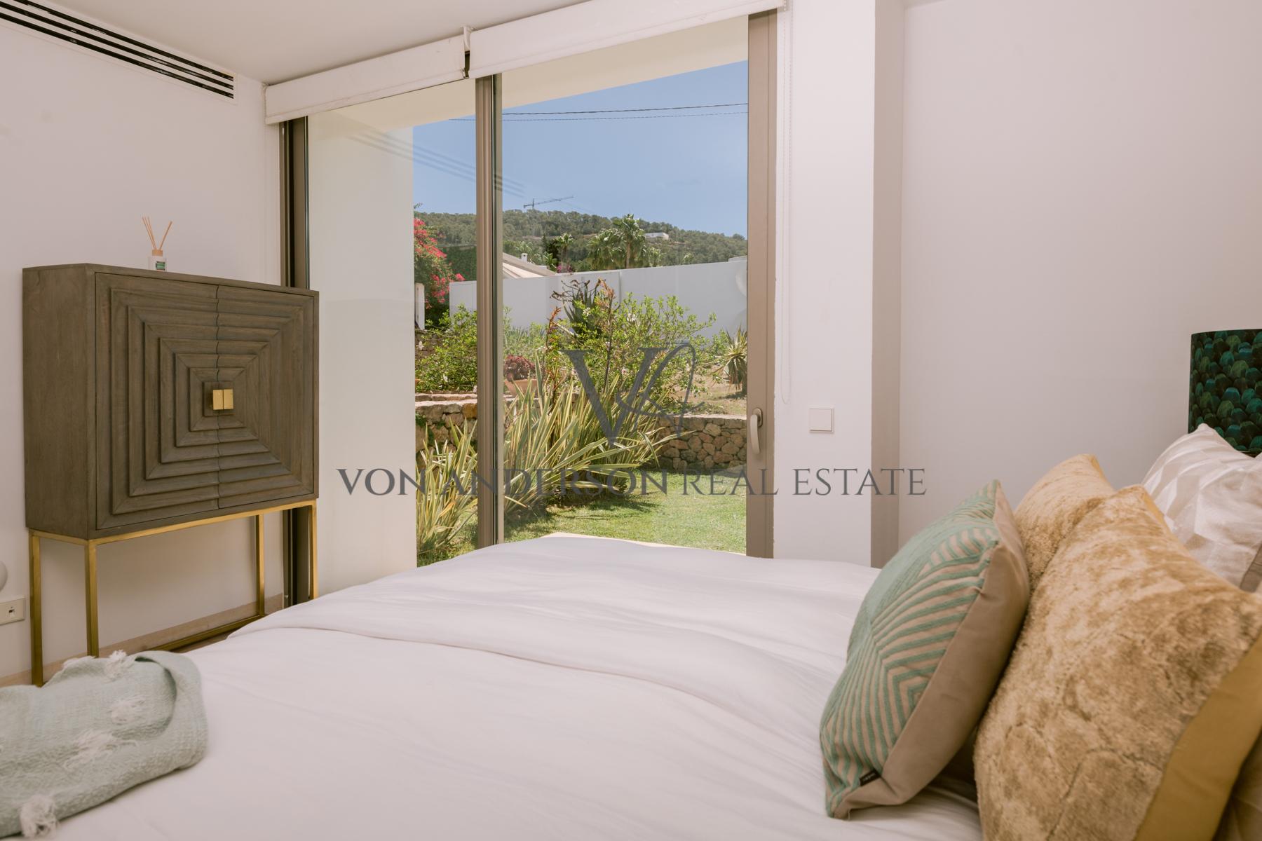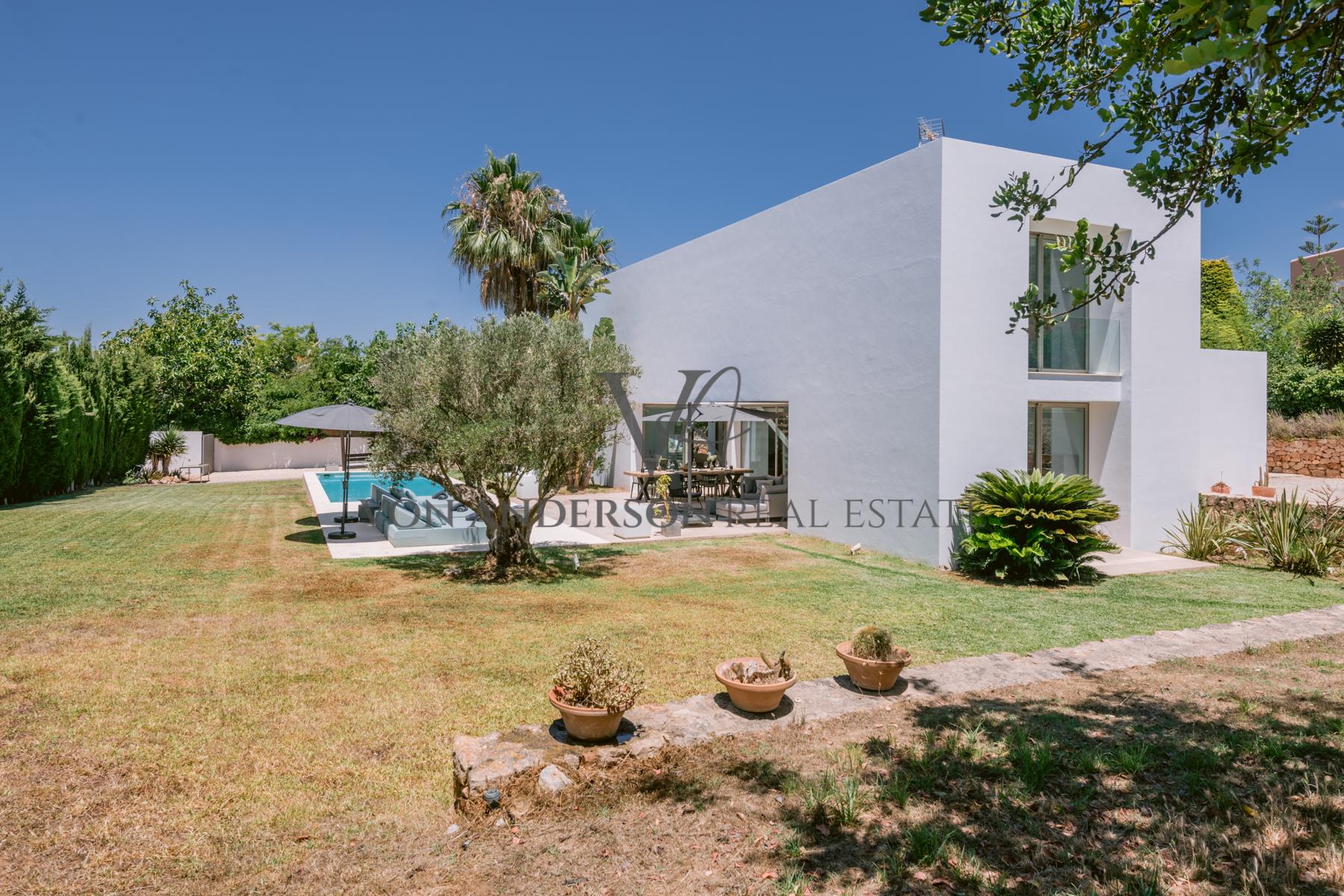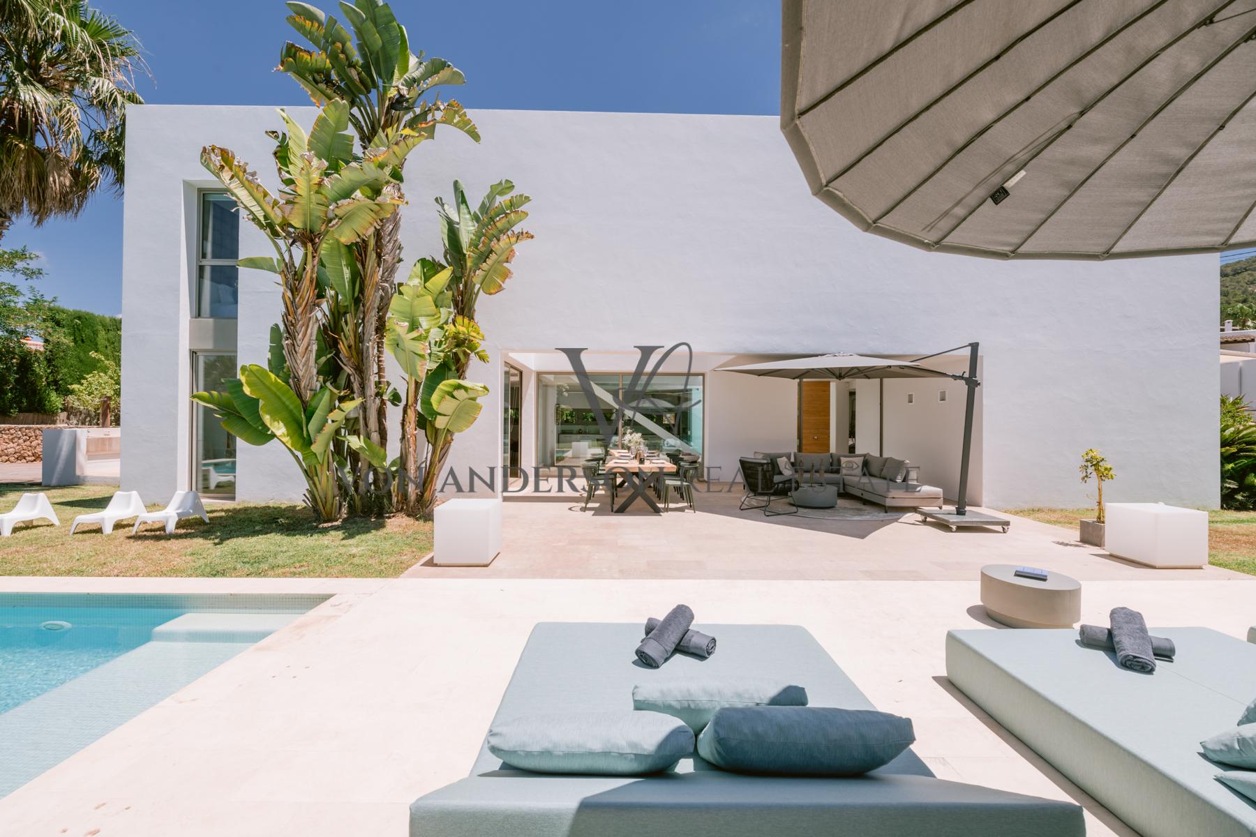 A breathtaking contemporary villa nestled within a large 2000m2 garden plot in the quaint village of Jesus, just a short drive from Ibiza town, the stunning Talamanca bay and the prestigious Botafoch yachting marina.