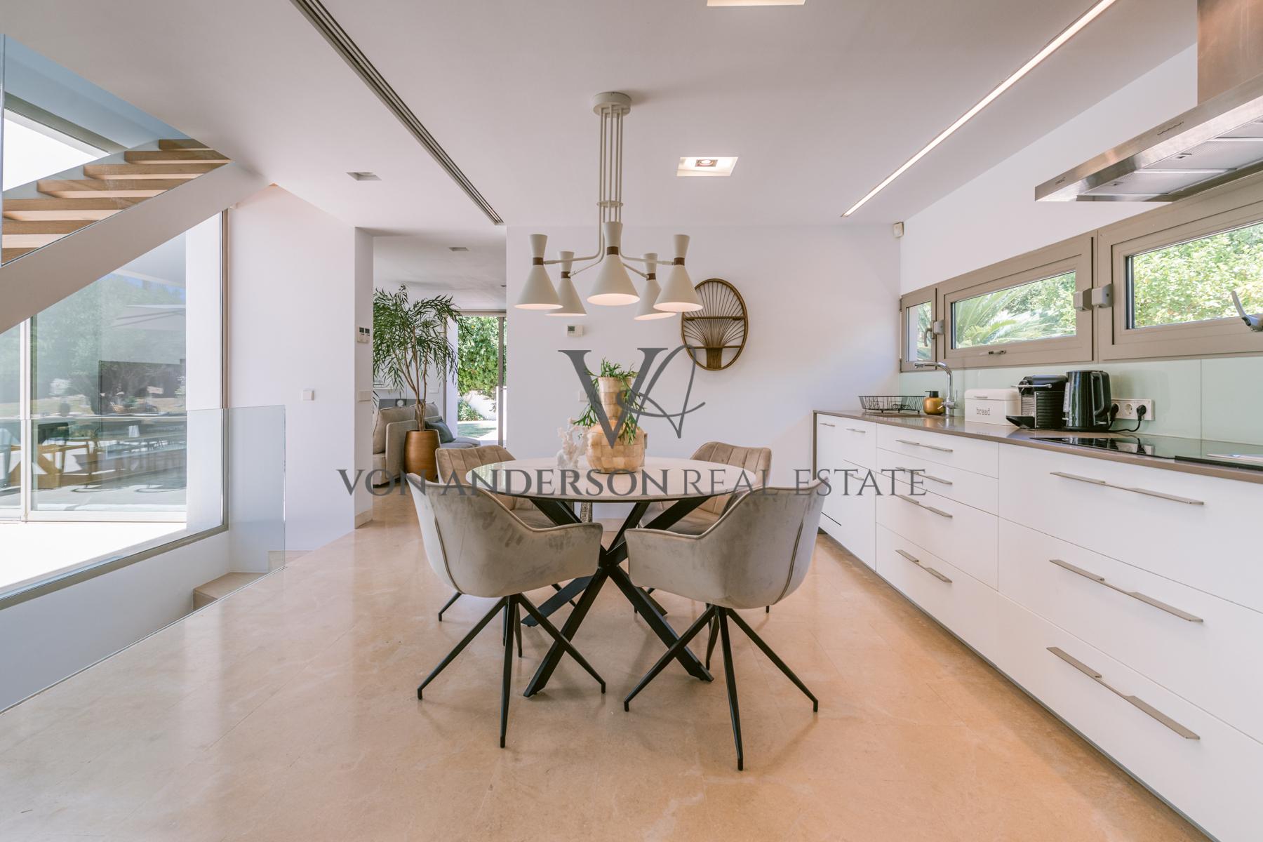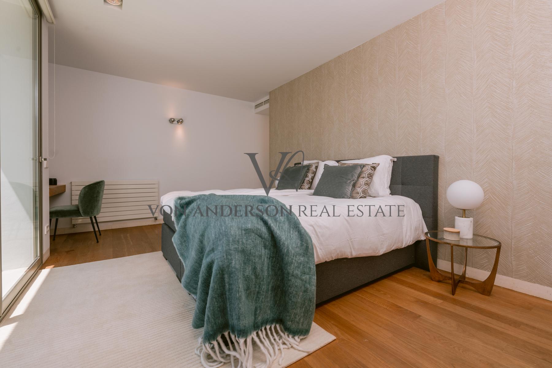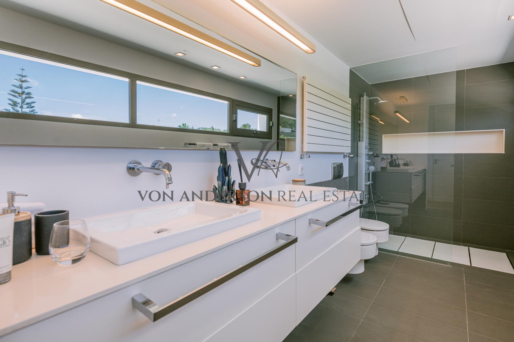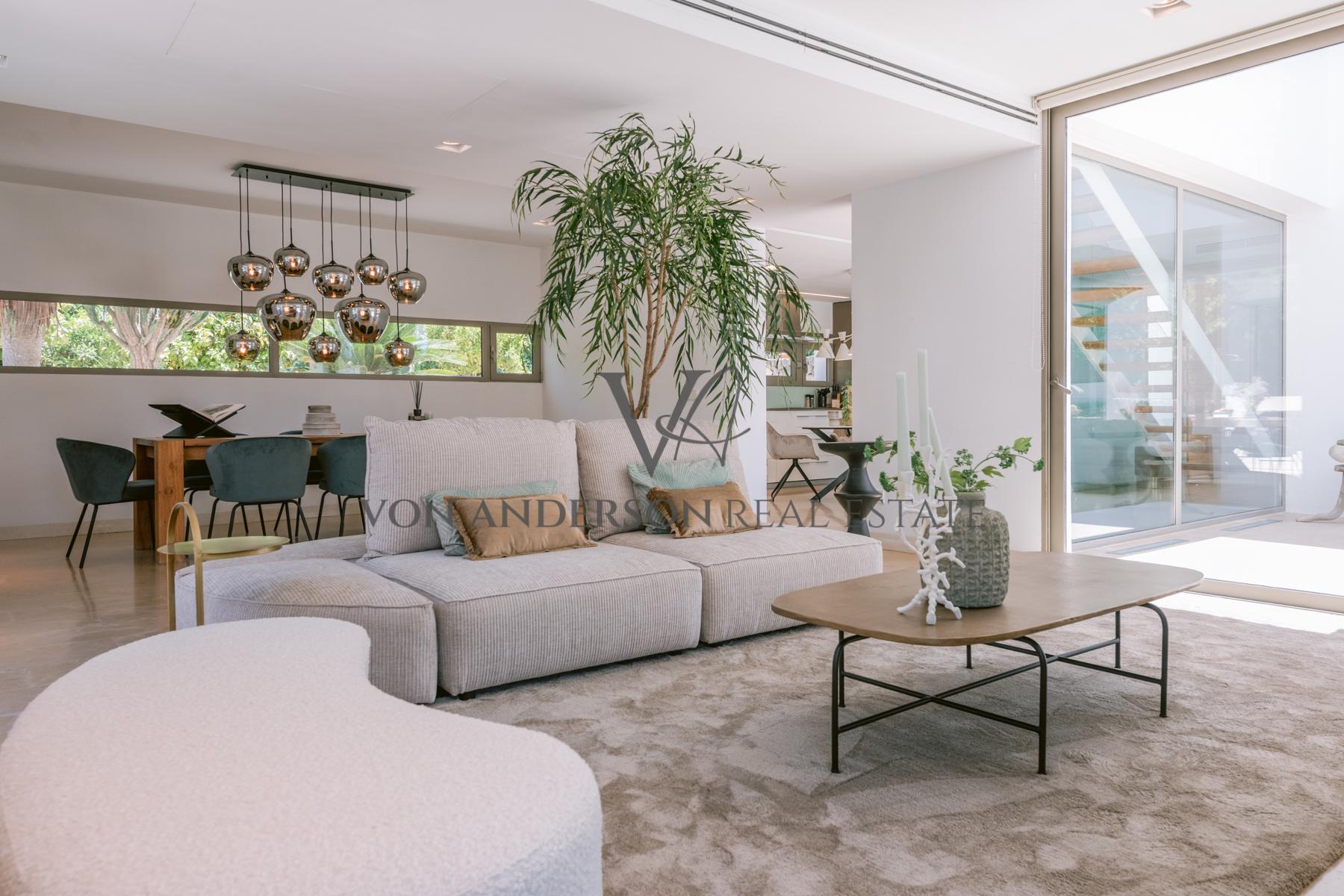 This exceptional property features four suites, each with its own private bathroom, including a lavish master suite with an outdoor gym and a penthouse boasting its own balcony. Spanning 320m2 across three floors, the villa offers a spacious open-plan living area and a custom-fitted kitchen equipped with top-of-the-line energy-efficient appliances.