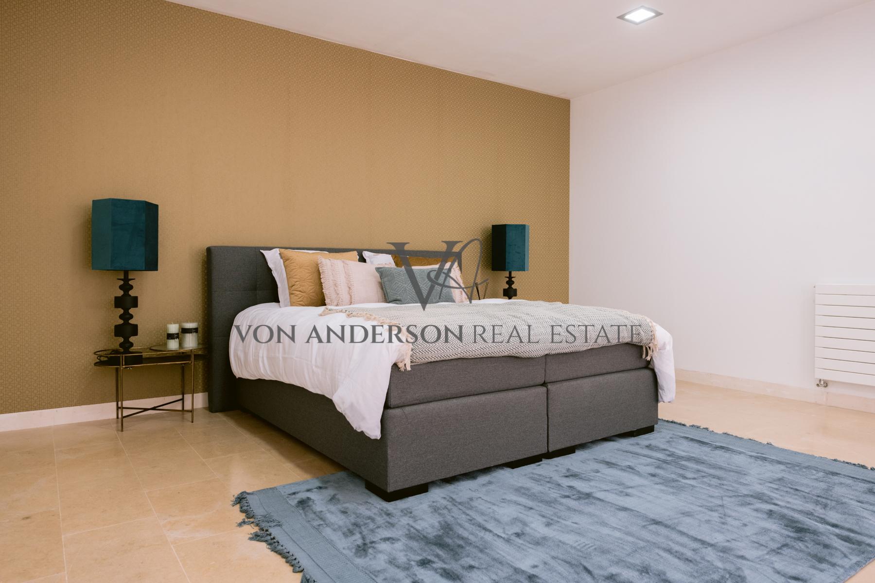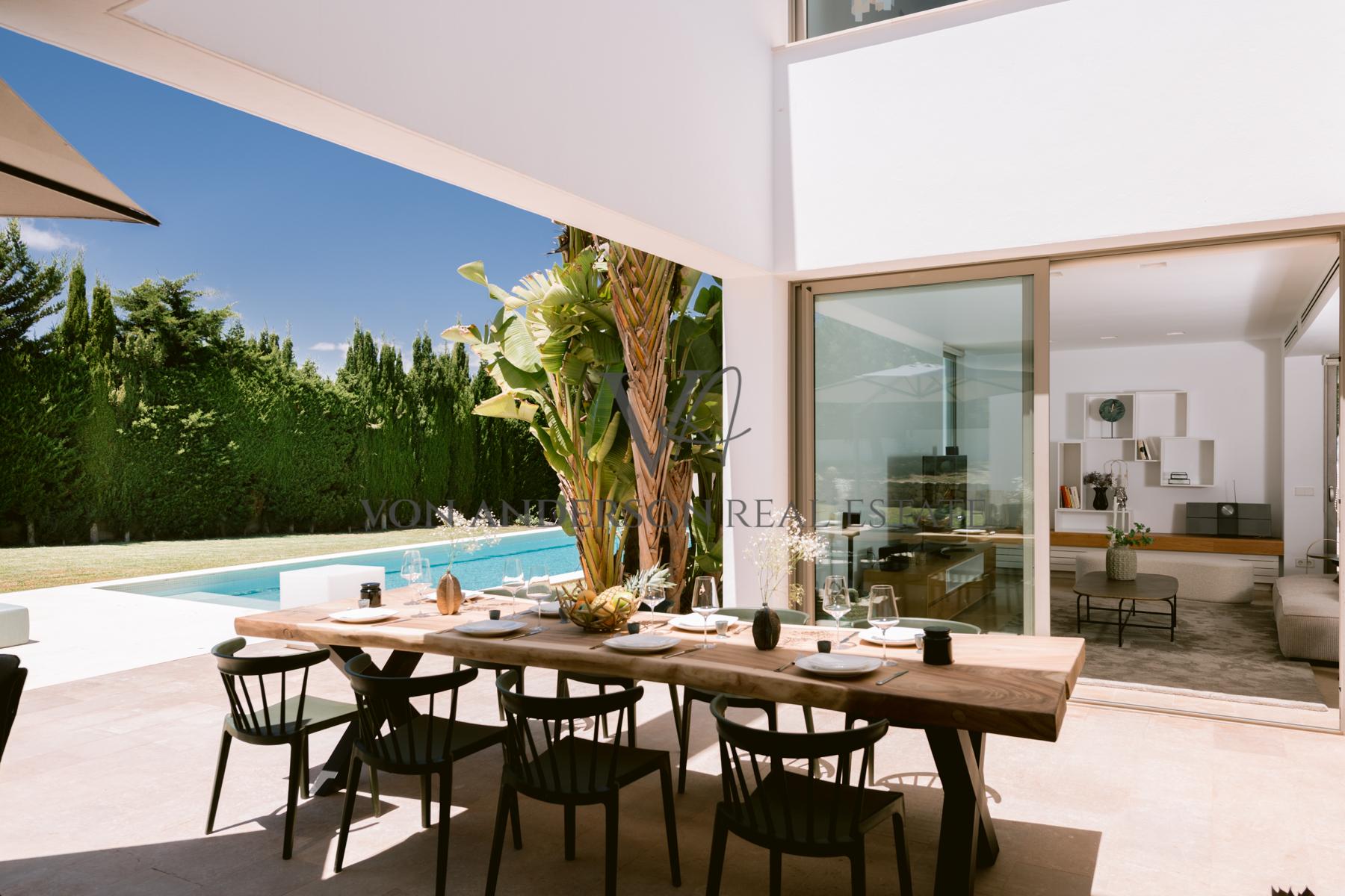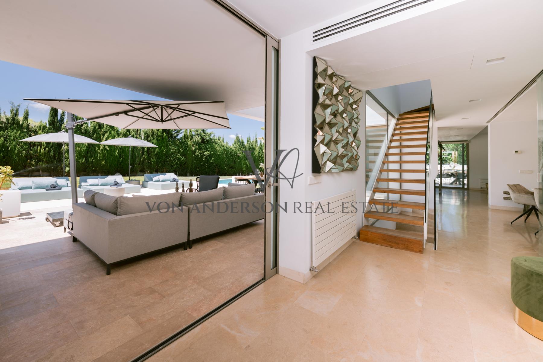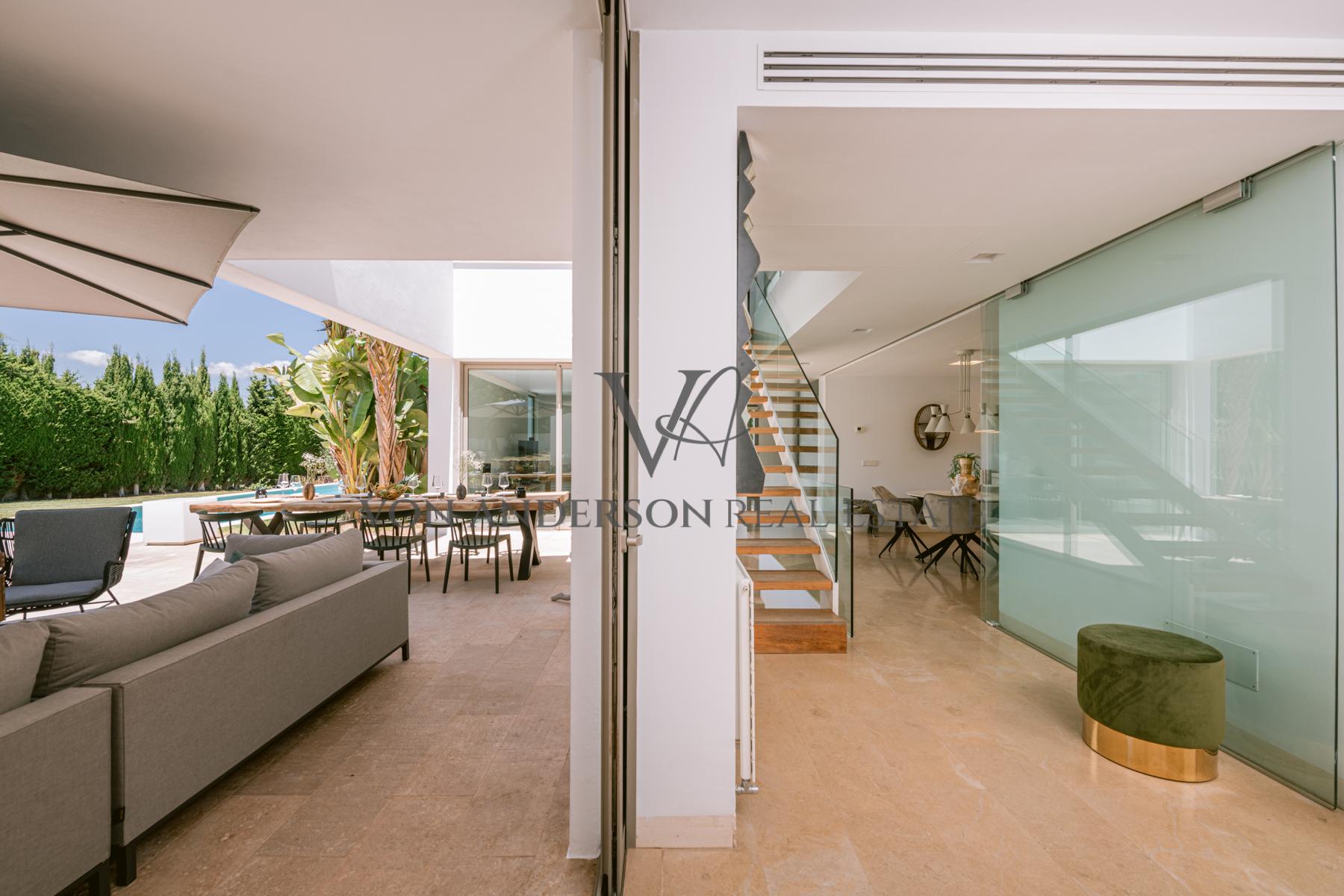 This exceptional property features four suites, each with its own private bathroom, including a lavish master suite with an outdoor gym and a penthouse boasting its own balcony. Spanning 320m2 across three floors, the villa offers a spacious open-plan living area and a custom-fitted kitchen equipped with top-of-the-line energy-efficient appliances.