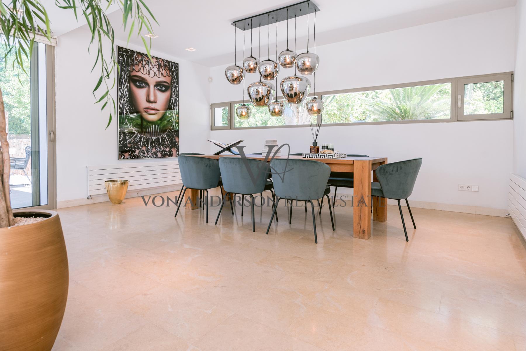 The kitchen seamlessly connects to the expansive gardens, adorned with multiple large terraces, providing ample opportunities for outdoor living amidst serene surroundings. Inside, the residence exudes modern minimalism with touches of elegance through its use of materials such as marble, glass, and chrome, complemented by unique, character-filled furnishings.