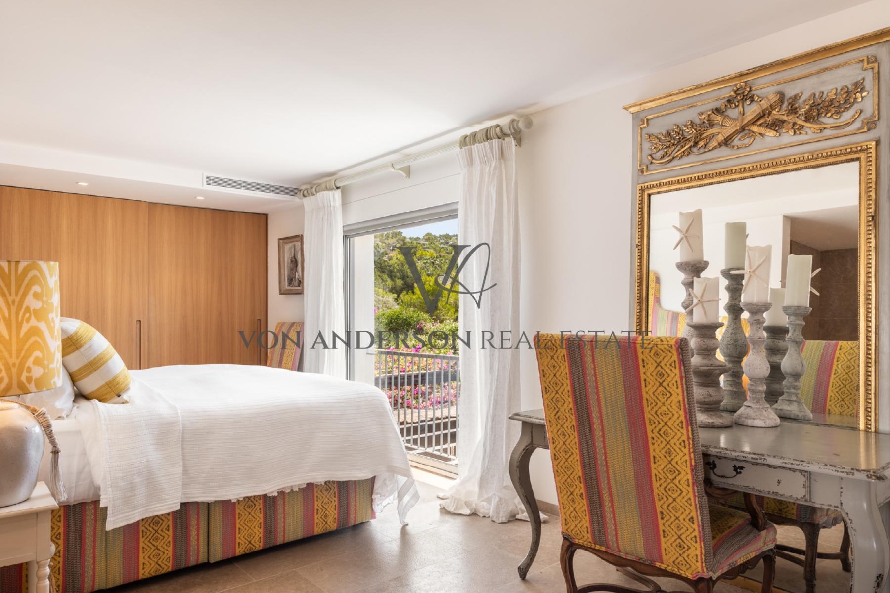 Perched in a prime, end-of-row position within one of Ibiza’s most exclusive gated communities, this exquisitely maintained villa offers 180-degree panoramic views over the serene, southwest bay of Cala Conta—renowned worldwide for its kaleidoscopic sunsets.