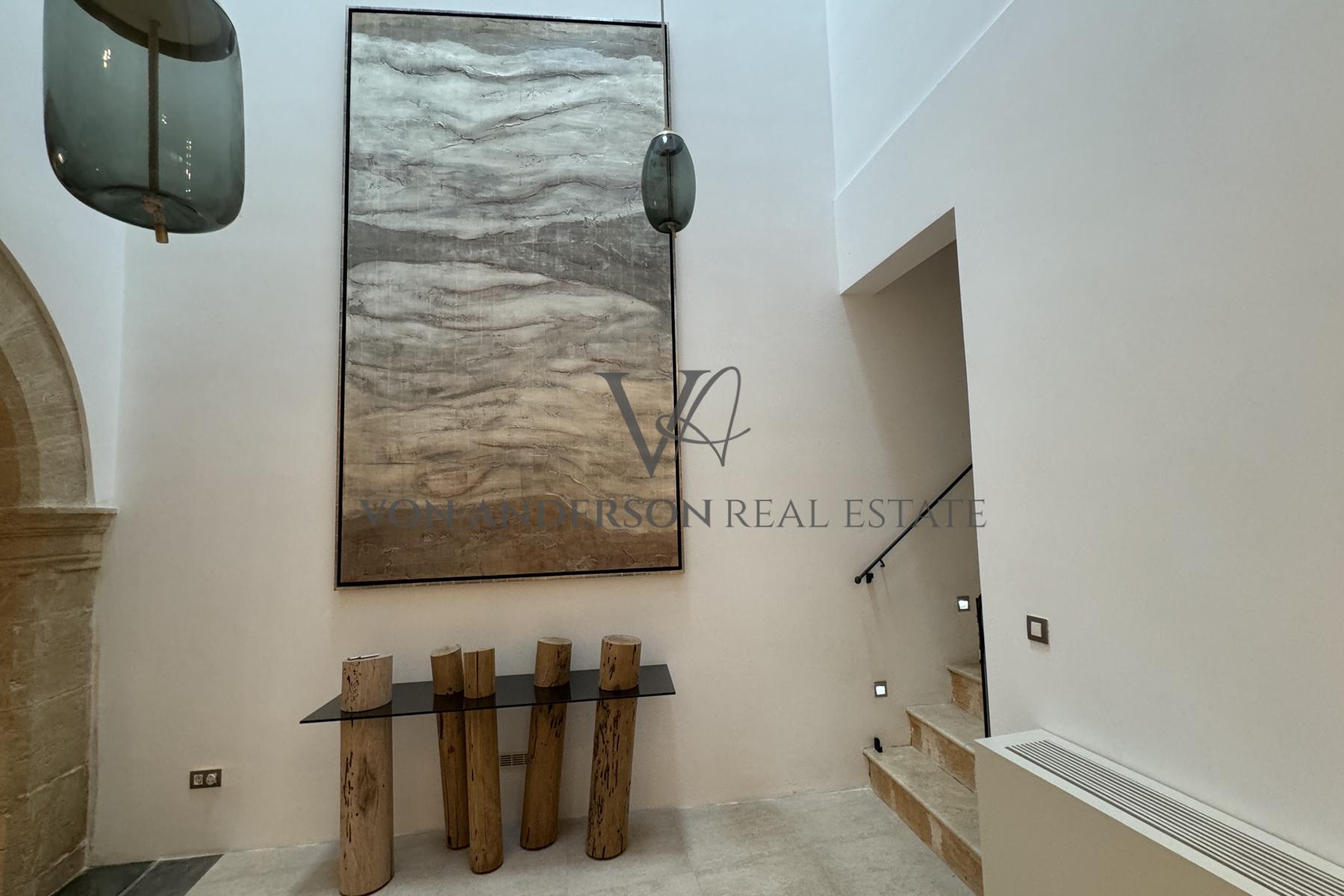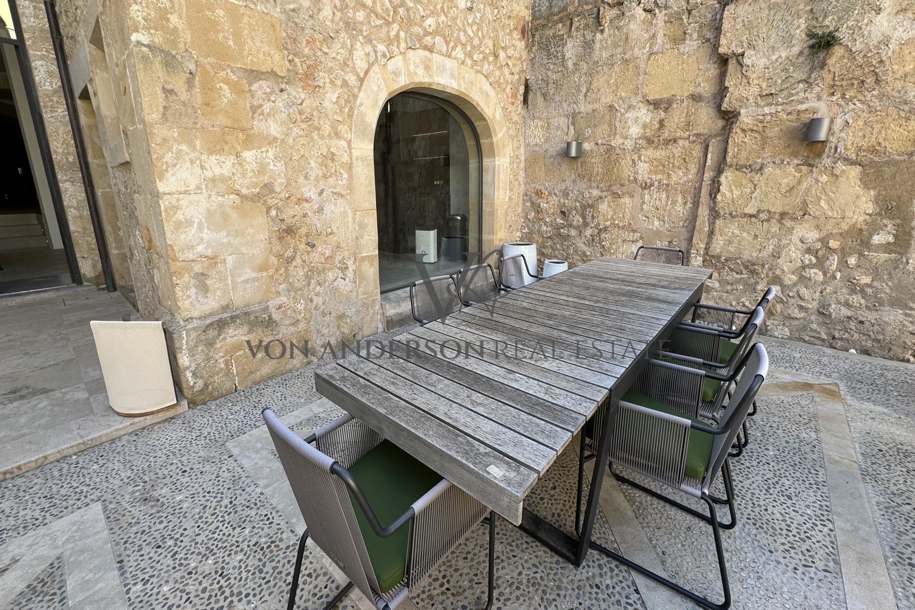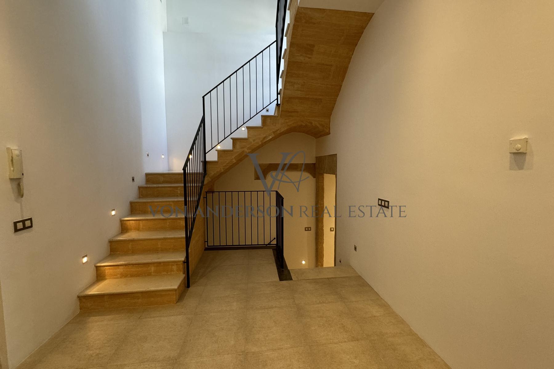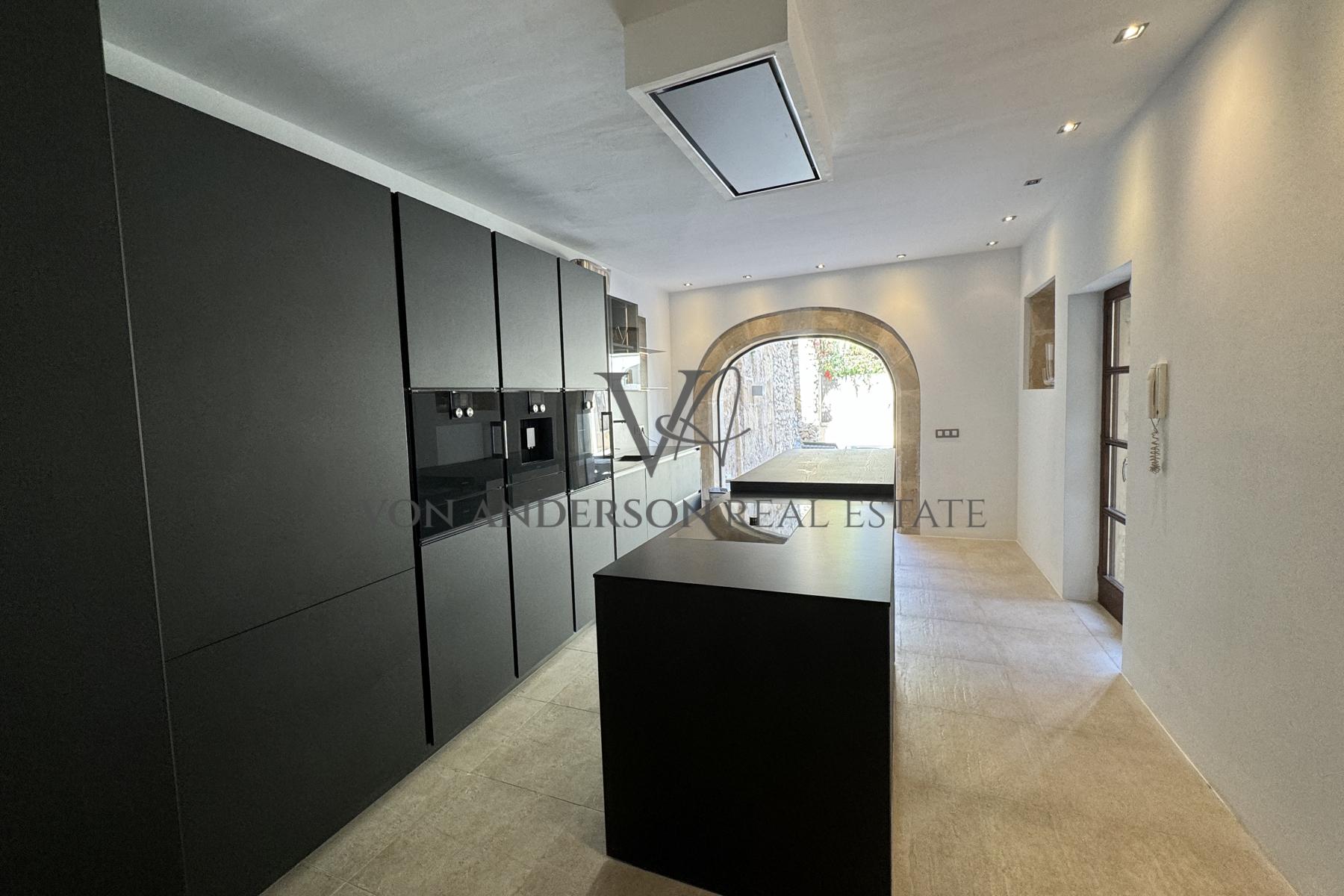 This exceptional townhouse, situated in the heart of Pollensa on the scenic north east area of Mallorca, boasts a striking modern design fused seamlessly with notable architectural elements such as beautiful wooden features and ornate stone arches throughout.