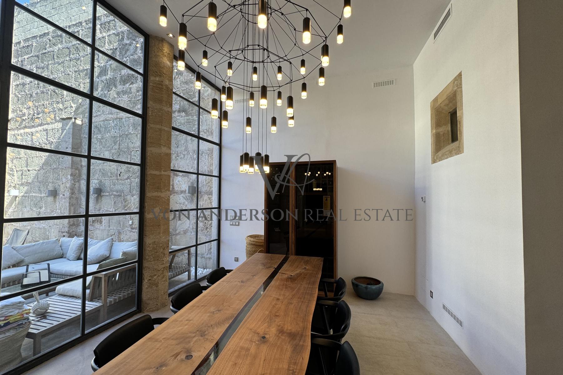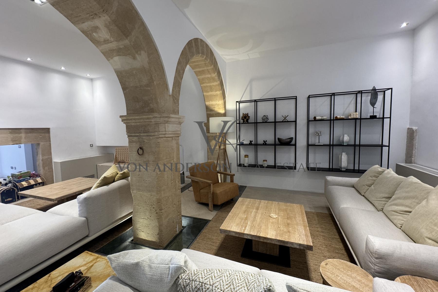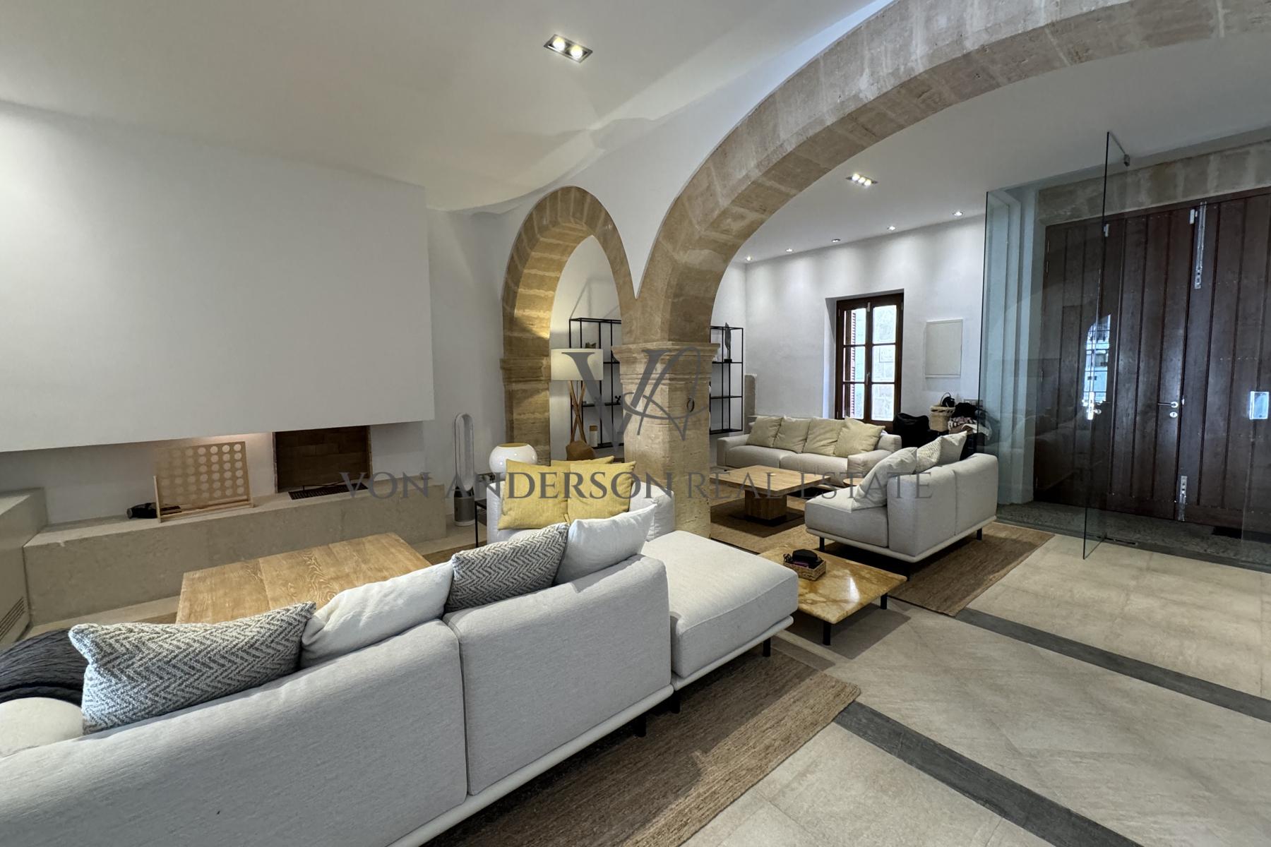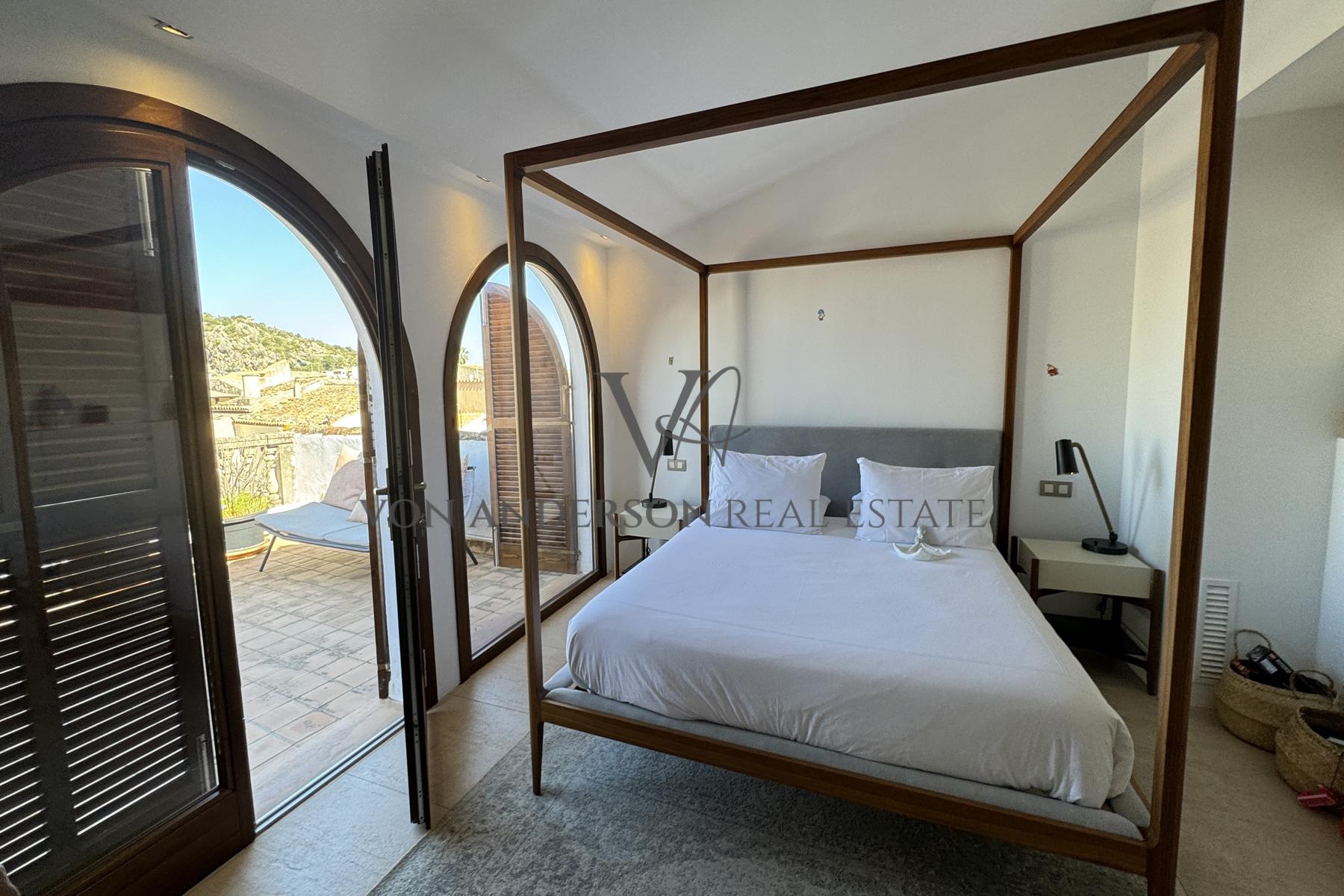 This exceptional townhouse, situated in the heart of Pollensa on the scenic north east area of Mallorca, boasts a striking modern design fused seamlessly with notable architectural elements such as beautiful wooden features and ornate stone arches throughout.