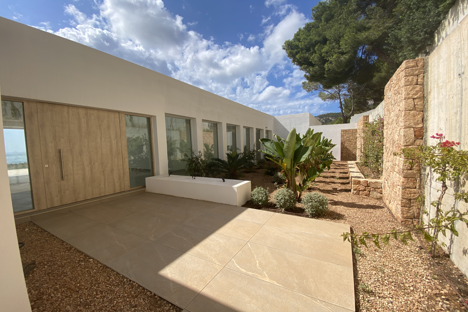 Large sliding doors suffuse the interiors with natural light and capitalise on the sweeping vistas of the valley, while the use of wood, stone, and other indigenous materials evokes the rustic charm of the island’s heritage fincas. The grounds of this distinguished residence boast ample shaded and open terrace spaces, as well as a grand 70m2 swimming pool, nestled amidst verdant greenery, offering a secluded sanctuary in rural Ibiza.