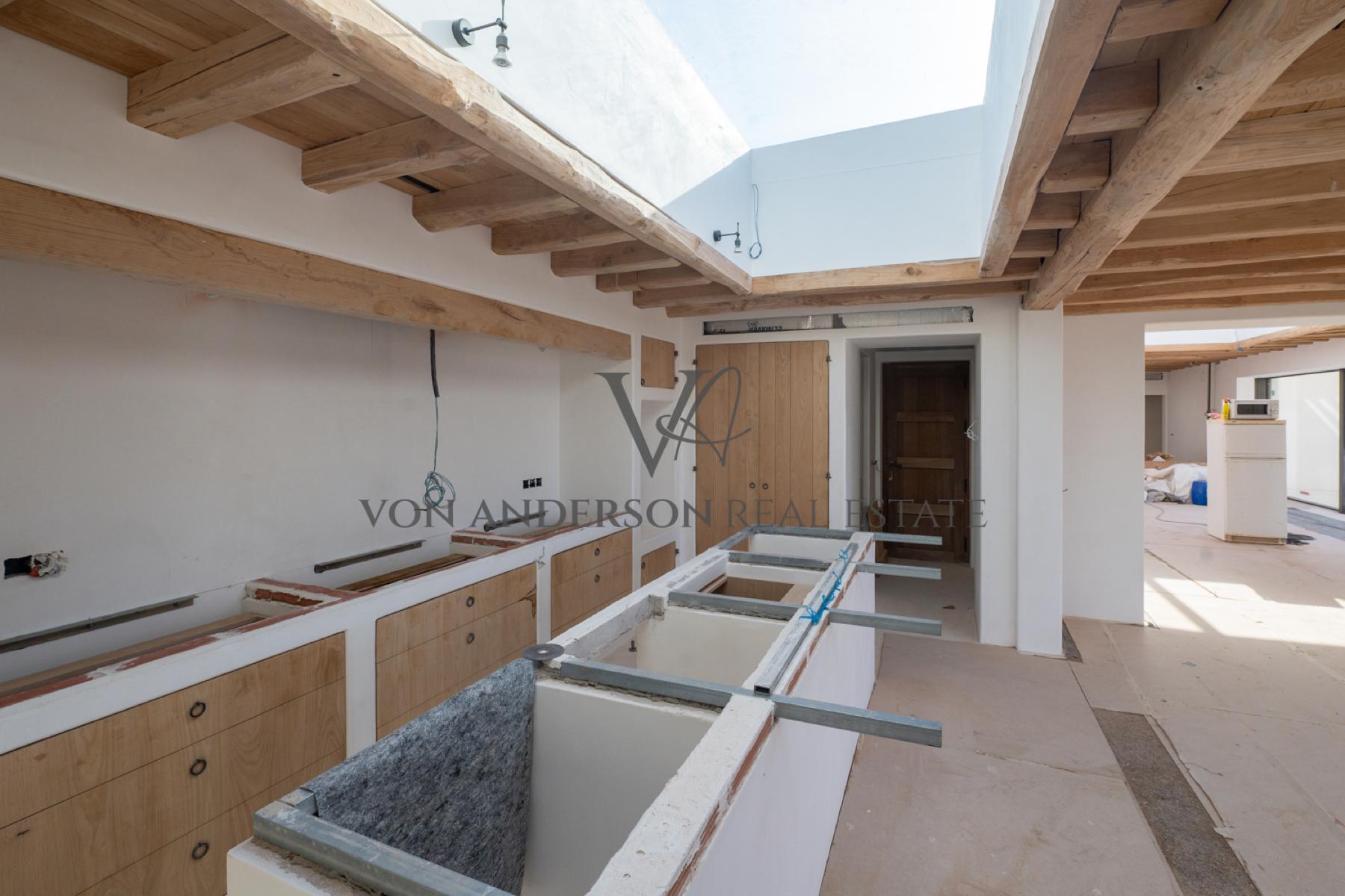 Large sliding doors suffuse the interiors with natural light and capitalise on the sweeping vistas of the valley, while the use of wood, stone, and other indigenous materials evokes the rustic charm of the island’s heritage fincas. The grounds of this distinguished residence boast ample shaded and open terrace spaces, as well as a grand 70m2 swimming pool, nestled amidst verdant greenery, offering a secluded sanctuary in rural Ibiza.