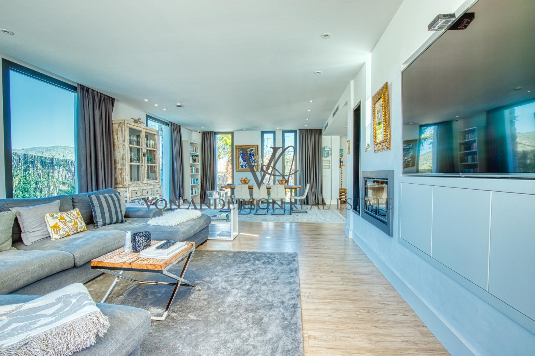 The open-plan living, dining, and kitchen areas seamlessly connect through well-lit spaces with wooden floors and numerous windows. Offering an exceptional setting for family living, the house provides captivating views of the forests and mountains from nearly every room.